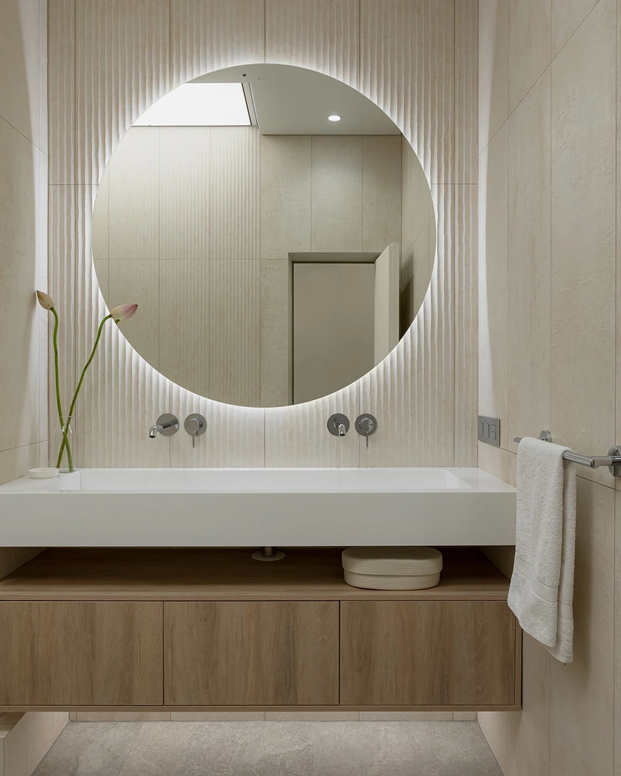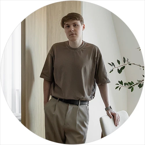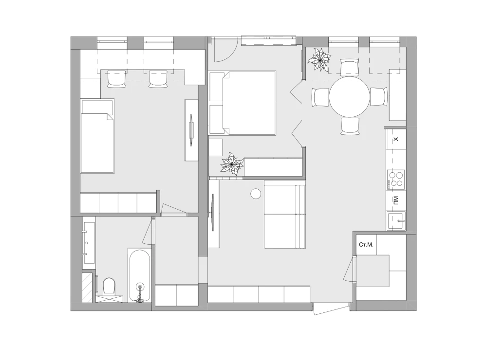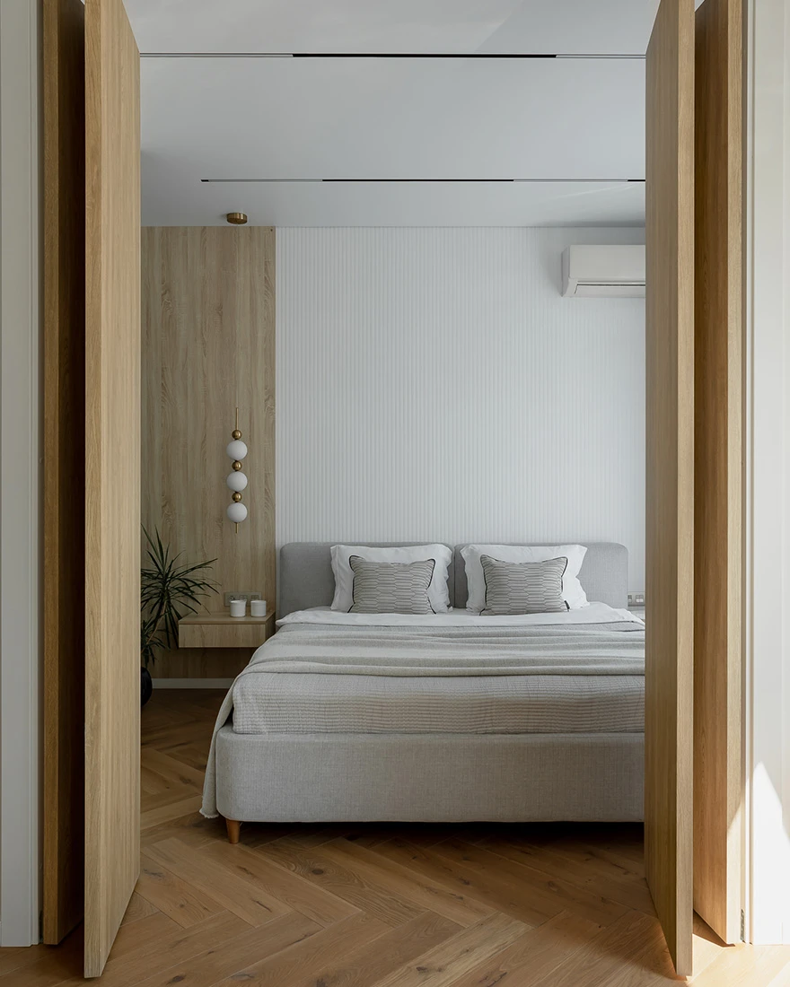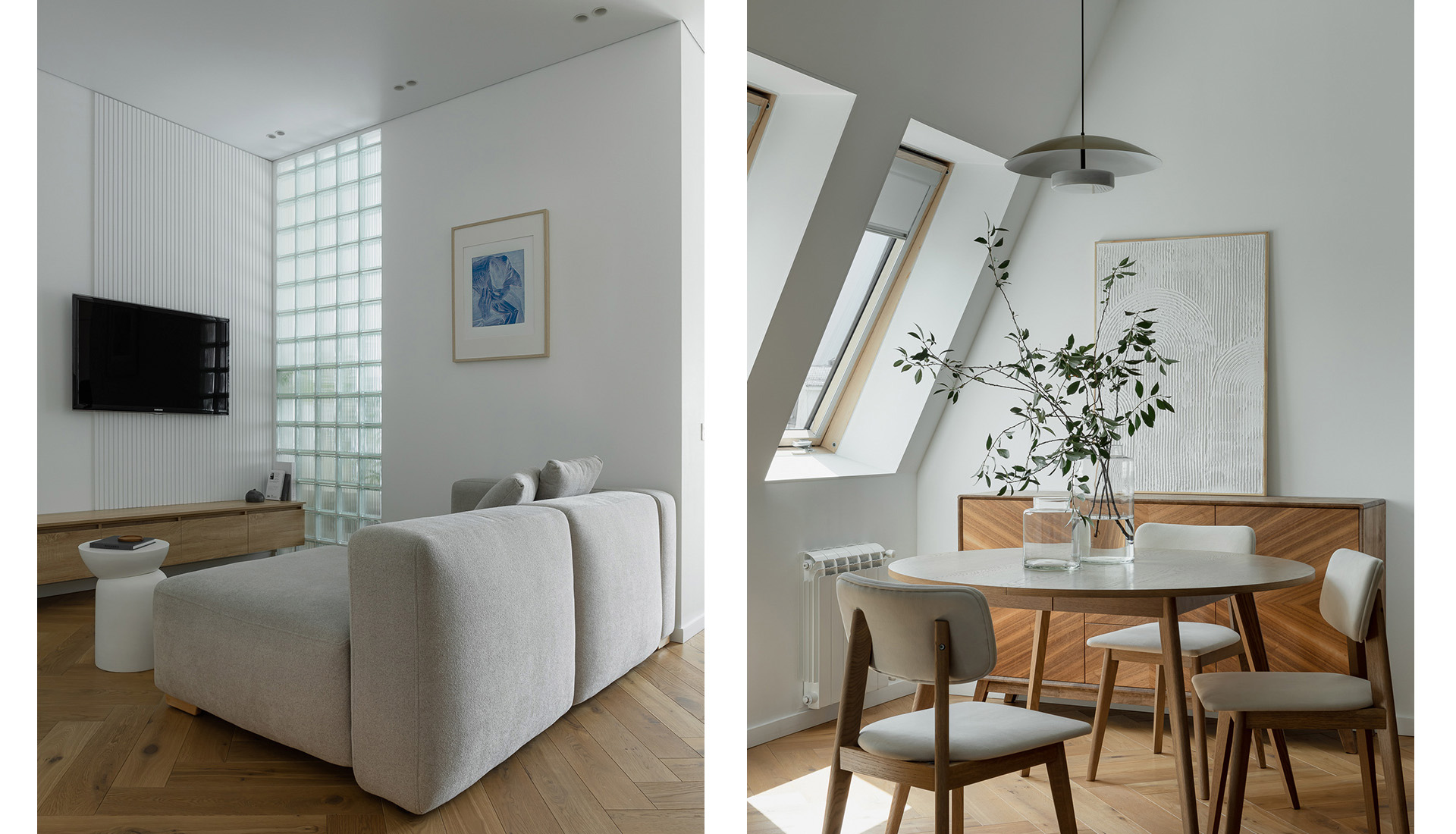 Интерьер выдержан в спокойной природной гамме. «Получился лаконичный минимализм. Белый цвет стен делает квартиру визуально просторнее, а мягкая мебель нейтрального серого цвета и латунные ручки на шкафах балансируют интерьер. Также спальню от гостиной отделяет стена из стеклоблоков, тем самым мы не теряем свет из окна. Для меня ценно, что я реализовал все запросы и пожелания заказчиков, сделав для них комфортный интерьер для жизни», — завершает дизайнер.