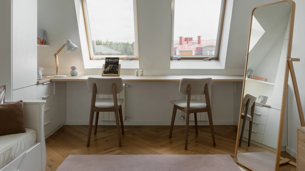 Изначально в квартире были кухня‑гостиная и спальня, детской не было. Благодаря перепланировка в квартире появились две отдельные спальни и зона для встреч с гостями, а также просторная кухня‑гостиная. «Изюминка — мансардные окна, которые придают загородный вайб и задают настроение всему проекту», — говорит Александр.