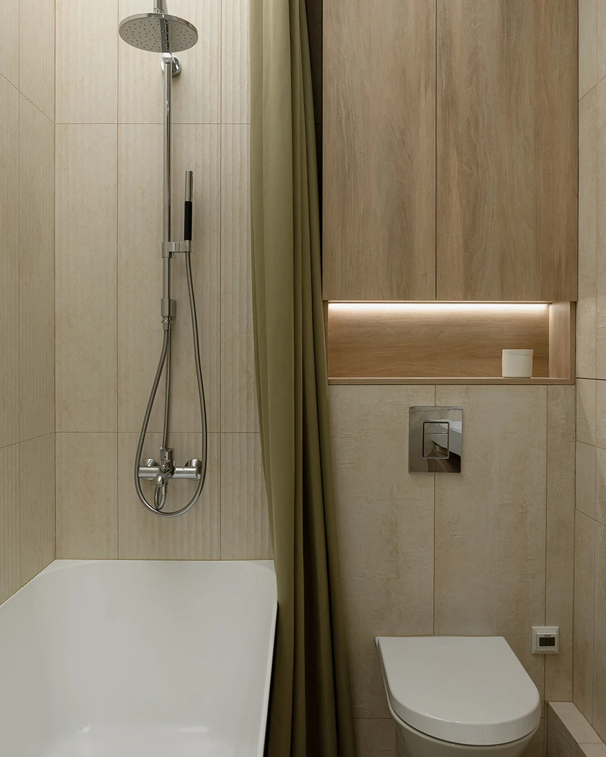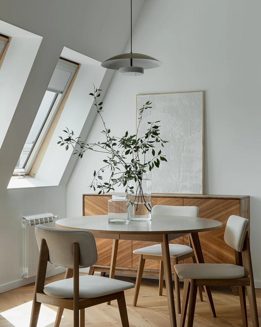 Дизайнер Александр Шарков, SHAR Interior design, оформил квартиру площадью 73 кв. метра на мансардном этаже четырехэтажного дома в клубном поселке в пригороде Екатеринбурга. Вдохновением послужила эстетика японских домов. Задачей дизайнера было создать современный интерьер и удобную планировку для молодой семьи с ребенком. «Моей главной идеей было передать атмосферу спокойствия загородной жизни, при этом сохраняя современный облик квартиры», — рассказывает автор проекта.