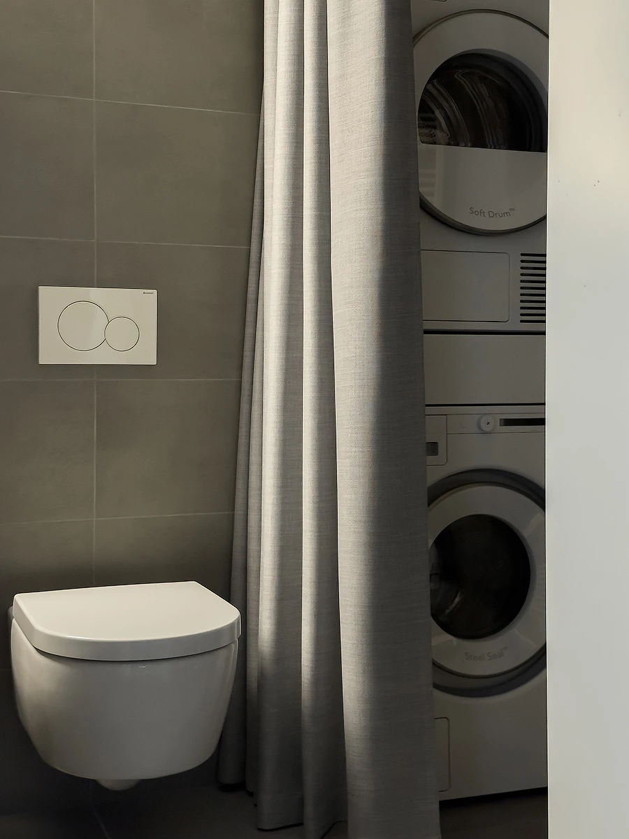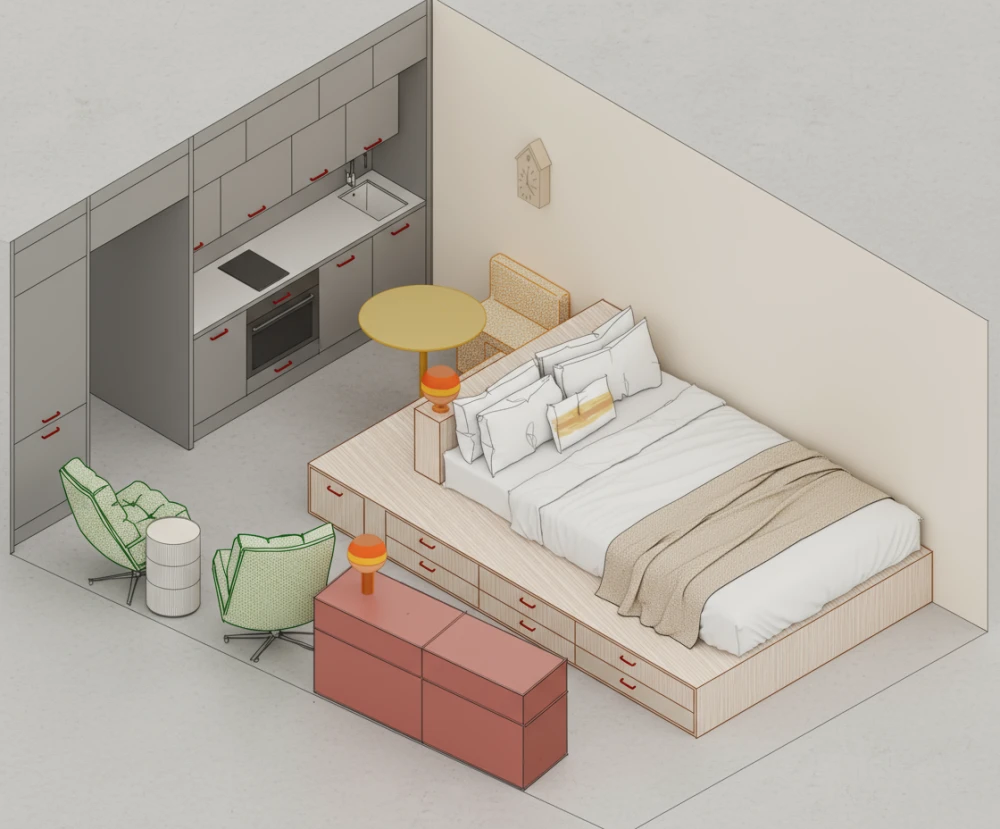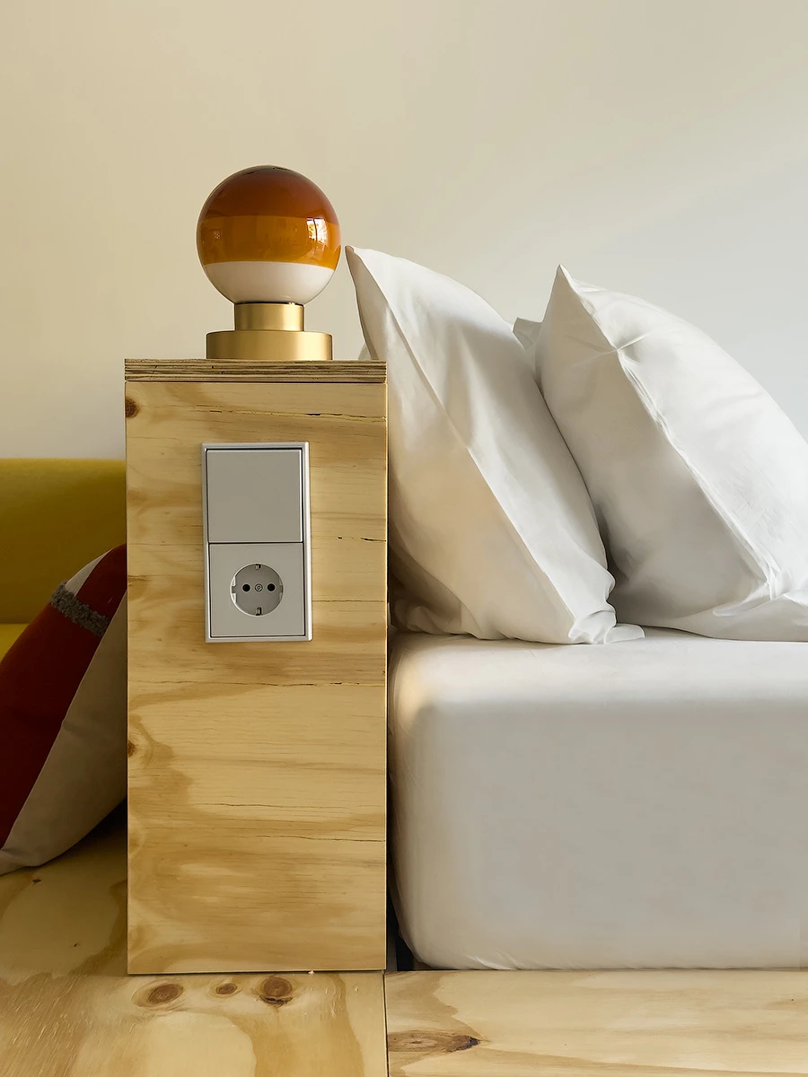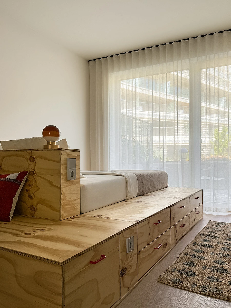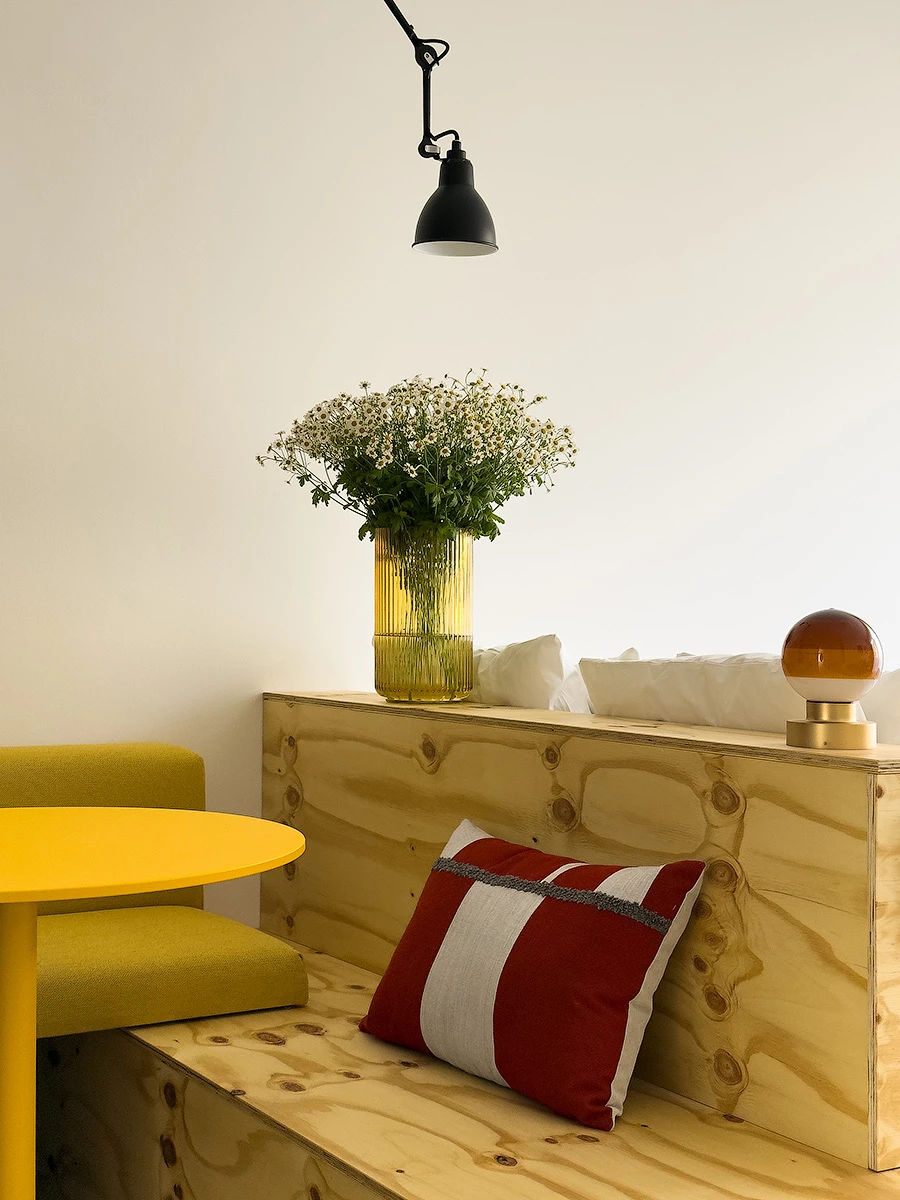 «Центральным элементом интерьера стал многофункциональный подиум из фанеры. Он выполняет сразу несколько ролей: зонирует пространство, служит кроватью, системой хранения и дополнительными посадочными местами. Широкий борт вдоль матраса решает важную задачу — гости не сидят на спальном месте, а изголовье работает как перегородка между спальней и столовой».
