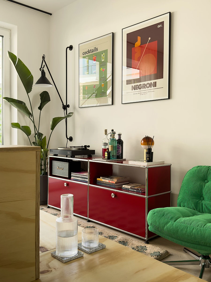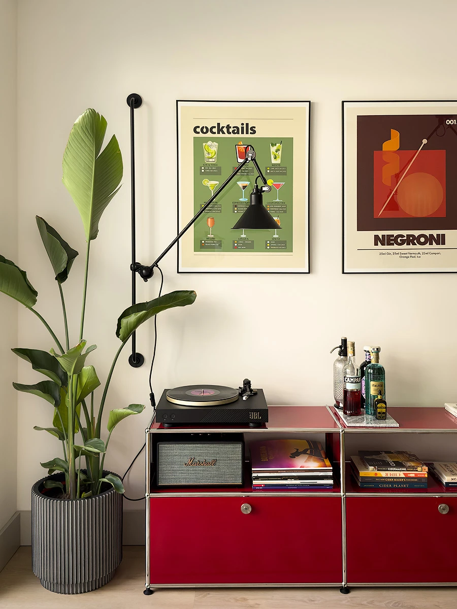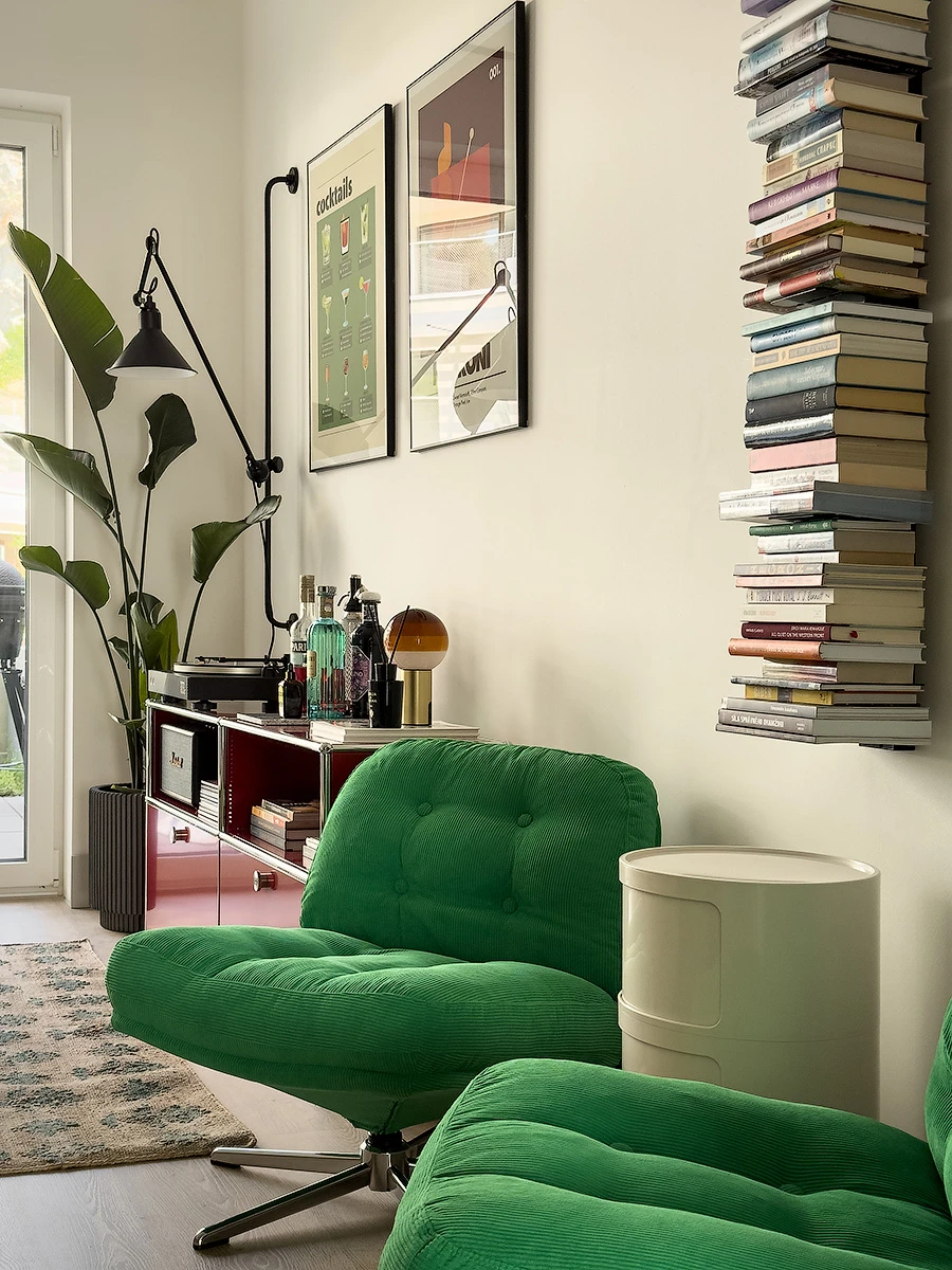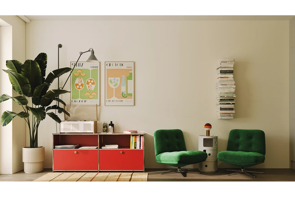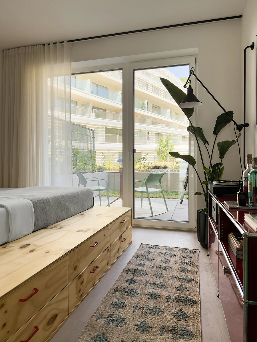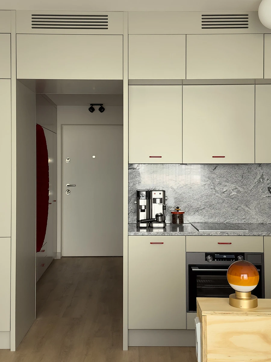 «Главным преимуществом объекта стало панорамное окно с выходом на приватную террасу и в зеленый двор, — рассказывают дизайнеры. — Пространство представляло собой типичный для Европы чистый объем с готовой отделкой санузла и разводкой электрики, но без светильников и мебели. Отсутствие кухонного гарнитура мы восприняли как плюс: это дало возможность спроектировать его с нуля под задачи комфортного пребывания. Поскольку серьезные строительные работы были исключены, мы сосредоточились на мебельном наполнении в эстетике Баухауса и конструктивизма».