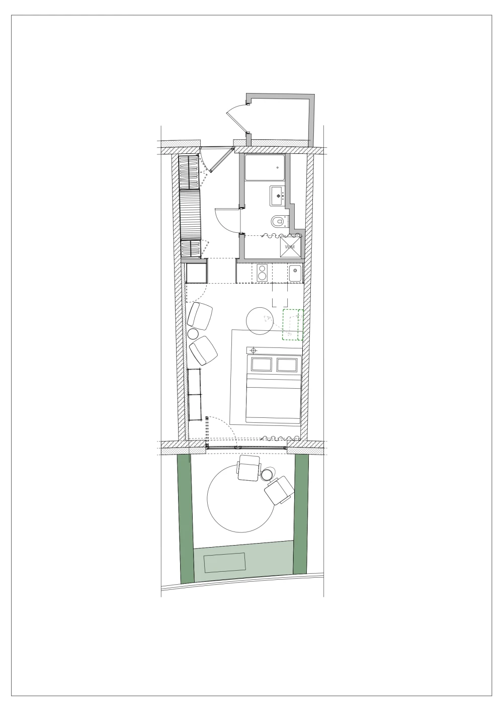 Эта компактная студия площадью 30 кв. метров в Брно — творческий эксперимент архитекторов Петра Лукьянова и Кирилла Устинова из студии ANCconcept. Квартира расположена в закрытом мраморном карьере, в уникальном террасированном доме, первые этажи которого выходят на приватные дворы без заборов. Проект создавался для молодой пары из Праги в качестве альтернативы гостиничному номеру — как место для коротких визитов длиной в 3-4 дня.