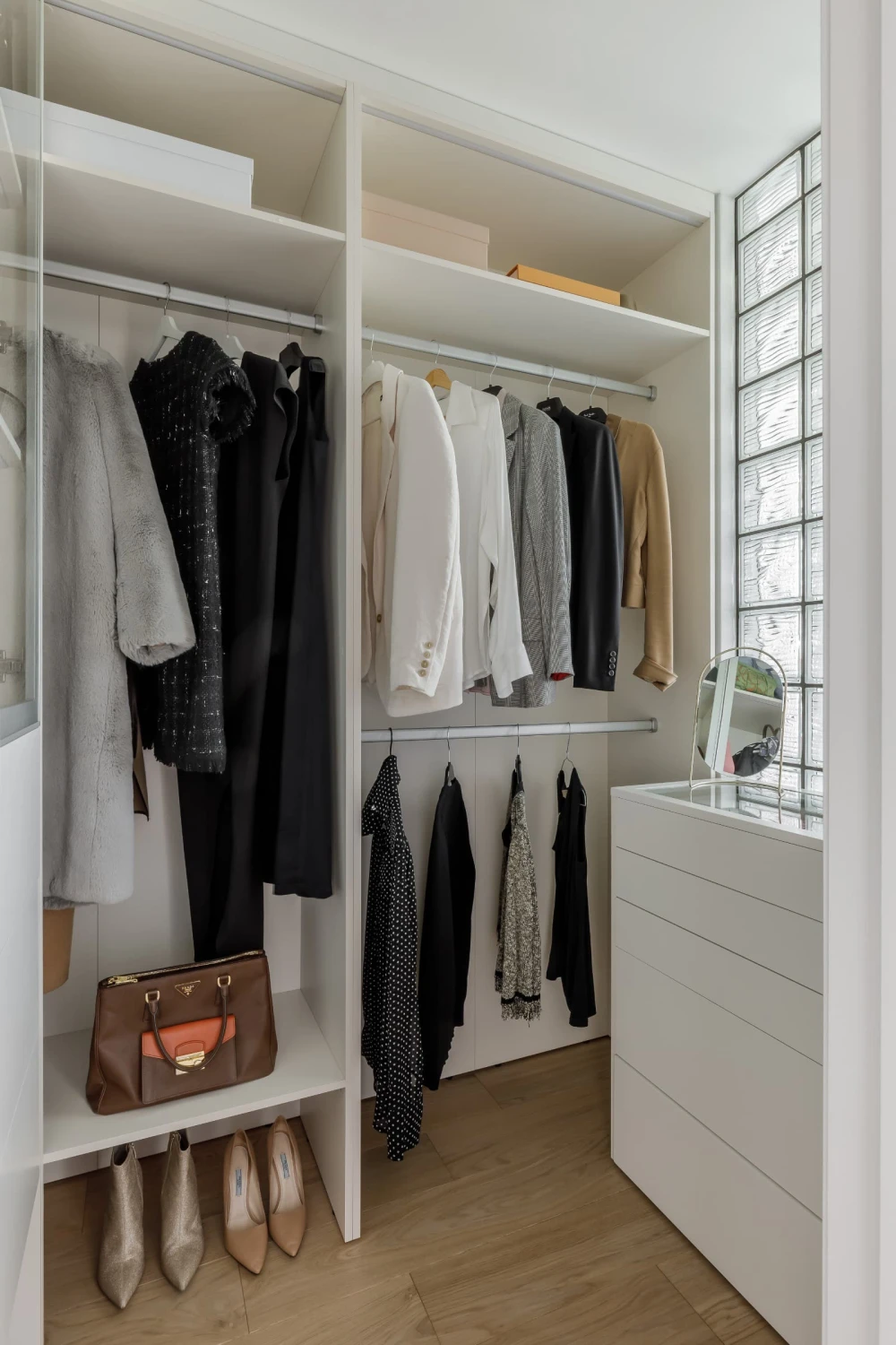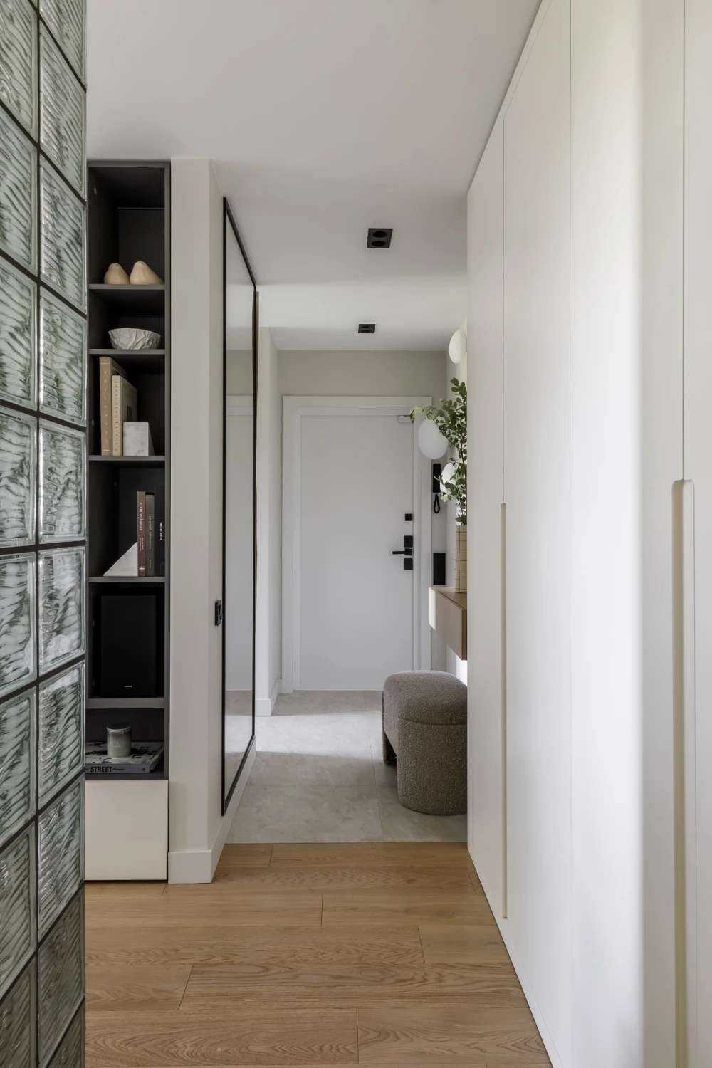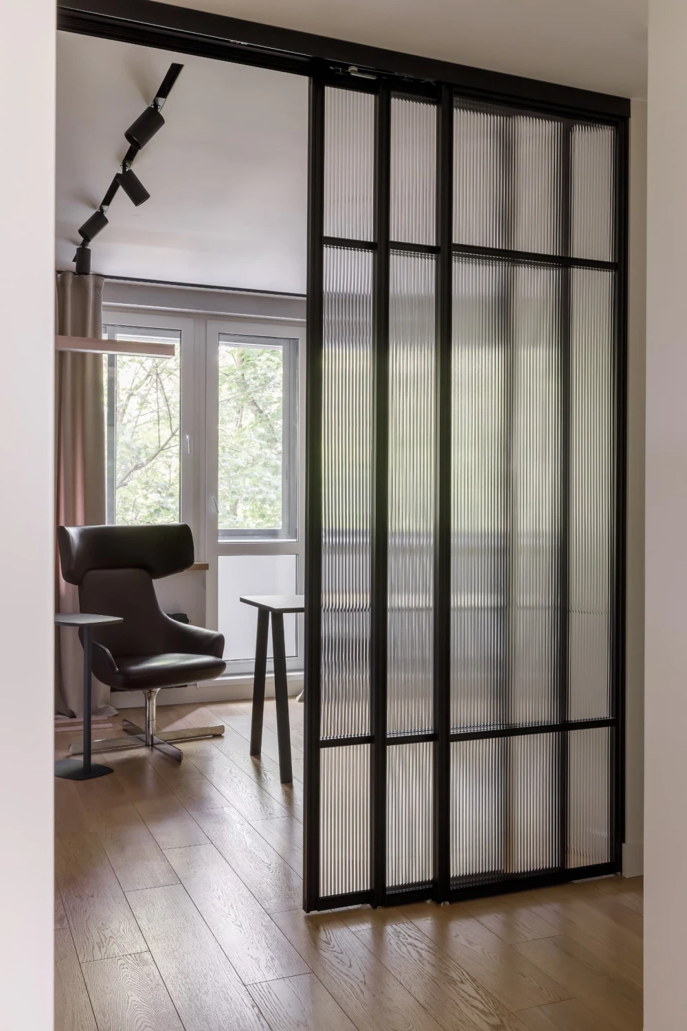 «Мы провели незначительную перепланировку — убрали стену между прихожей и двумя комнатами. Одну из них превратили в гостиную, а вторую — в кабинет со стеклянной перегородкой, которая добавила света в самую темную зону квартиры. Коридор мы сделали многофункциональным, разместили там большой шкаф и хозяйственный блок, скрытый за шторой. Отдельную кладовую отвели под чемоданы и мотоэкипировку».