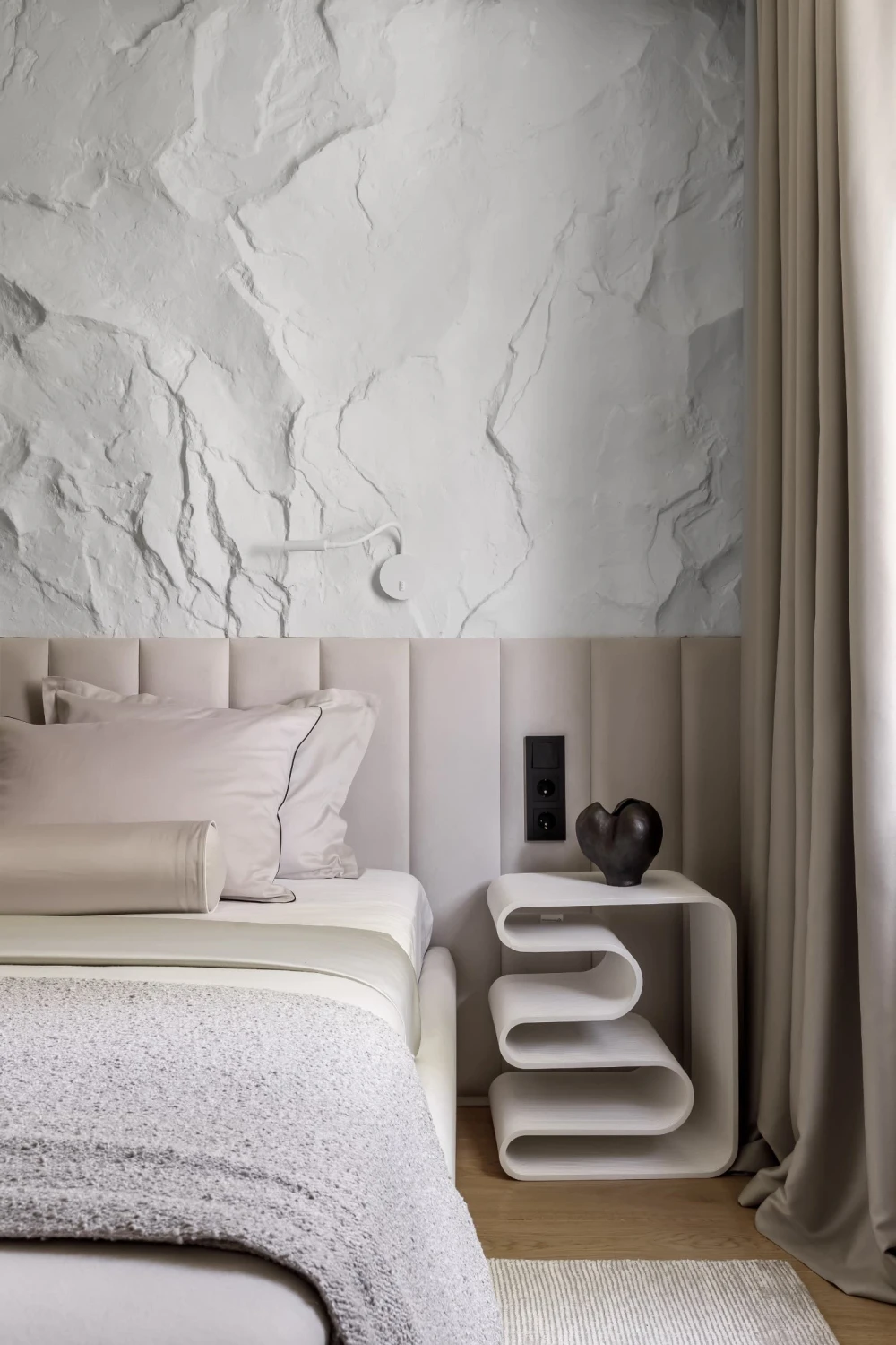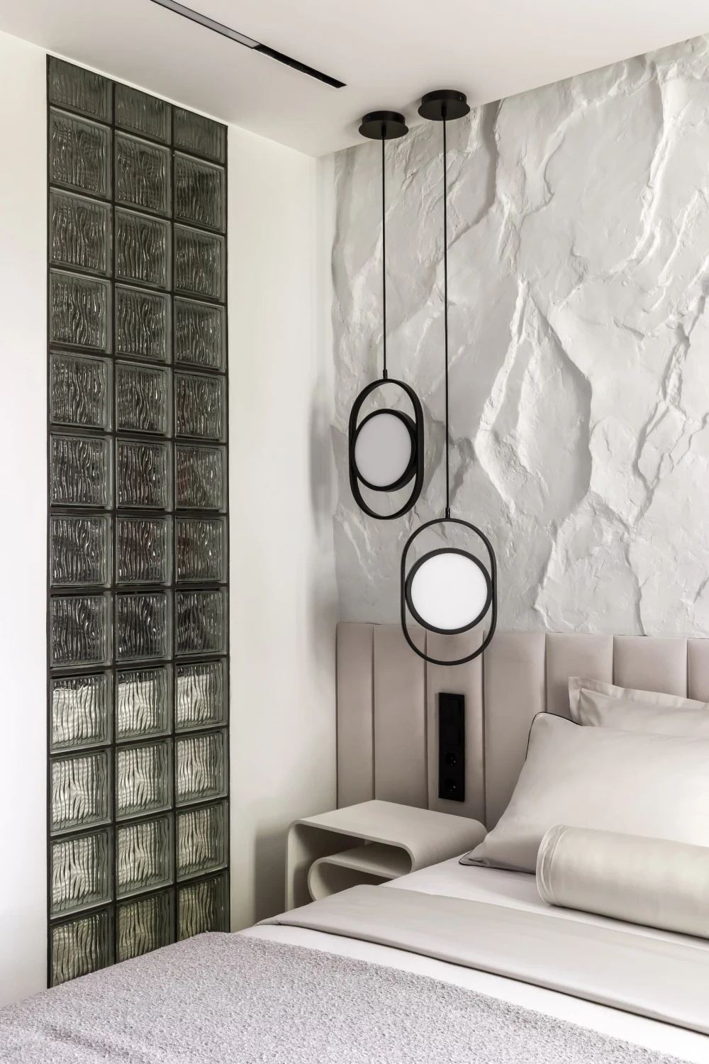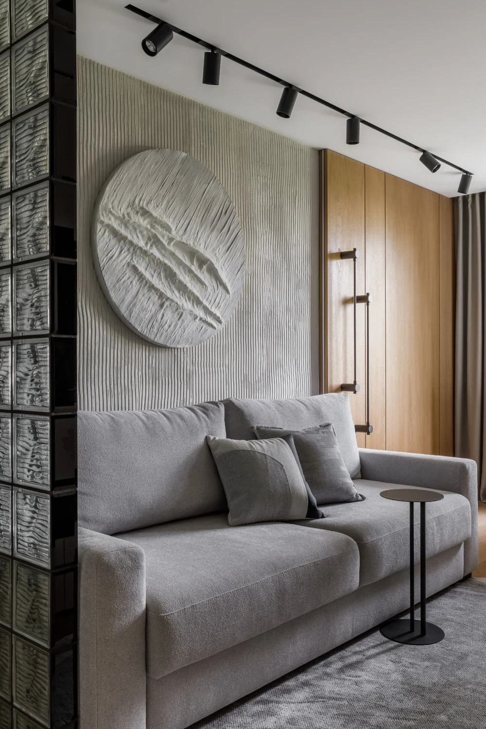 «Так как дом построен в эпоху СССР, мне хотелось сохранить внутри дух эпохи, поэтому я использовала стеклоблоки, которые лаконично интегрированы в эстетику софт-минимализма. Удачным решением стало сочетание грубых фактур с мягкими тканями, шпонированными панелями и теплыми оттенками. Например, декоративная «скала» в спальне не кажется холодной благодаря окружению теплых материалов. В гостиной и на кухне штукатурка с легкой незавершенностью уравновешивается деревом и текстилем, а густая зелень за окном дополняет эту природную палитру».