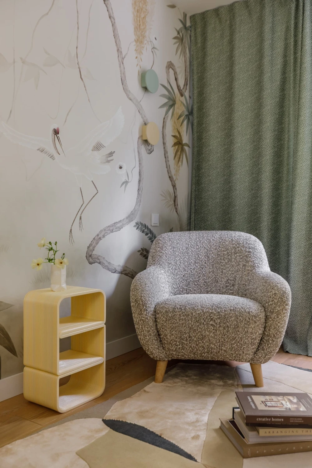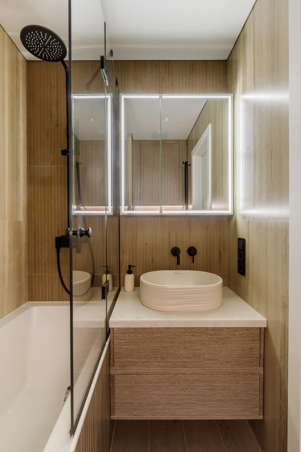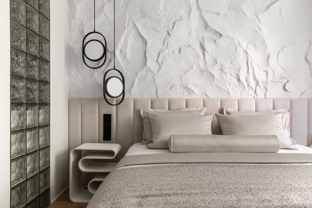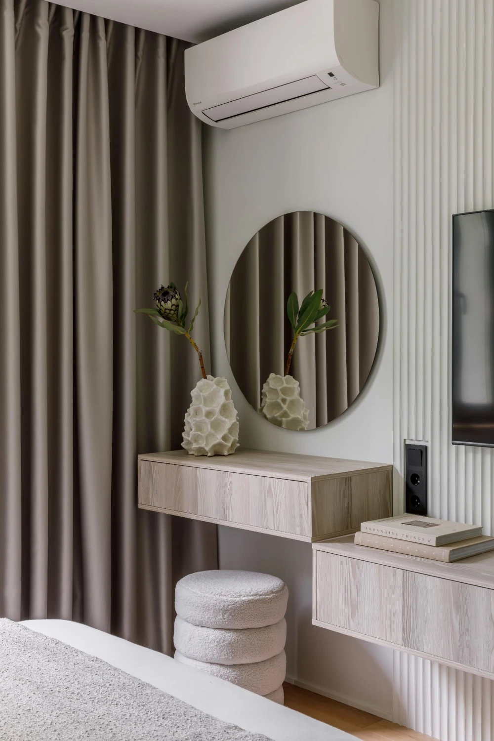 «Так как дом построен в эпоху СССР, мне хотелось сохранить внутри дух эпохи, поэтому я использовала стеклоблоки, которые лаконично интегрированы в эстетику софт-минимализма. Удачным решением стало сочетание грубых фактур с мягкими тканями, шпонированными панелями и теплыми оттенками. Например, декоративная «скала» в спальне не кажется холодной благодаря окружению теплых материалов. В гостиной и на кухне штукатурка с легкой незавершенностью уравновешивается деревом и текстилем, а густая зелень за окном дополняет эту природную палитру».