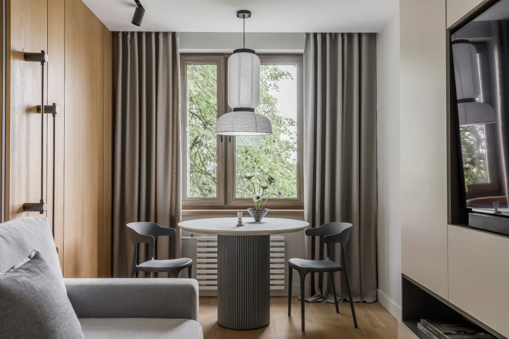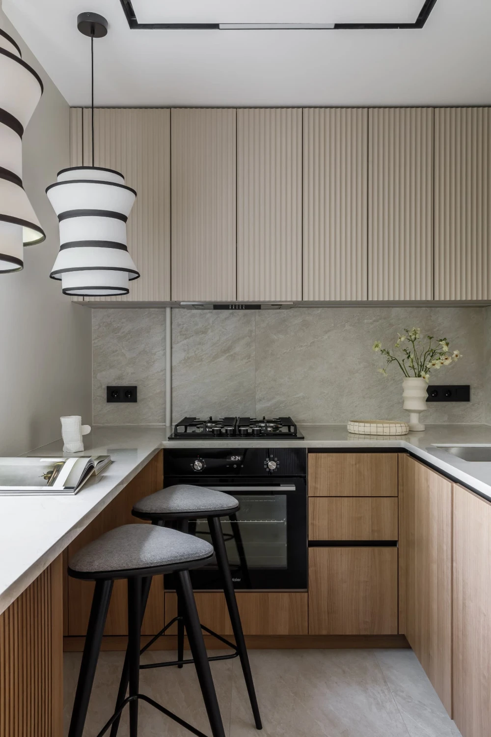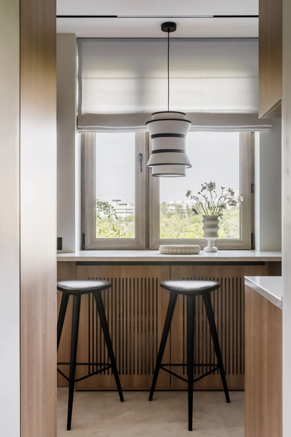 «Первое, о чем я подумала на замерах: «хочу впустить сюда очень много света», — рассказывает автор проекта. — Зелень за окнами была так густа, что буквально поглощала освещение. Сложность усугубляла планировка: квартира угловая и расположена над аркой, кухня маленькая, типичная для панелек, и всего две стены, которые можно было демонтировать. При этом заказчики мечтали об открытом пространстве. Это было настоящим вызовом — создать ощущение простора в таких условиях».