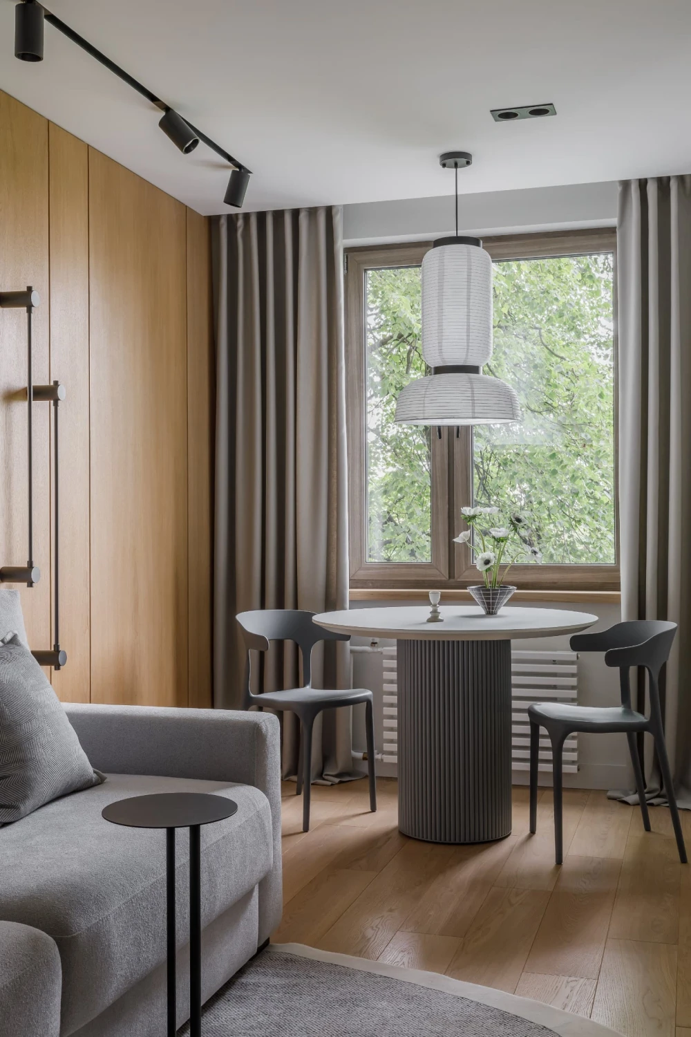 «Заказчики очень гармоничные открытые люди, от которых буквально веет теплом и спокойствием. Заказчица преподает йогу, поэтому в квартире нужно было организовать пространство для проведения онлайн-тренировок. При этом пара любит экстремальную езду на спортивном мотоцикле — потребовалось отдельное хранение для мотоциклетной экипировки».