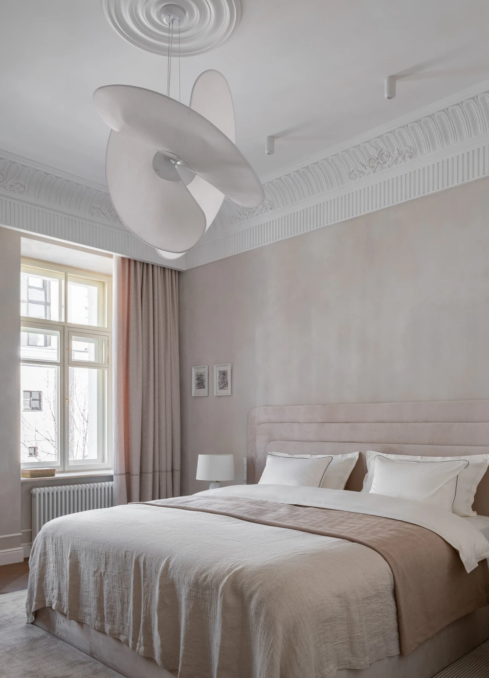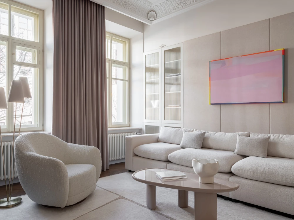 Квартира не предназначалась для постоянного проживания, большую часть времени хозяева проводят заграницей, а здесь планировали останавливаться во время визитов в Москву. Дизайнеру нужно было создать пространство, напоминающее номер в дорогом отеле. По просьбе заказчицы за основу цветовой гаммы взяли бежевые тона и сделали ставку на нюансы. Гостиная отделана мягкими светло-бежевыми панелями, в кухне и коридоре использовали краску близкого оттенка, а в спальне — штукатурку, которая создает легкий эффект состаренных стен. Для ванных комнат выбрали крупноформатный керамогранит, который позволил создать практически бесшовное покрытие.