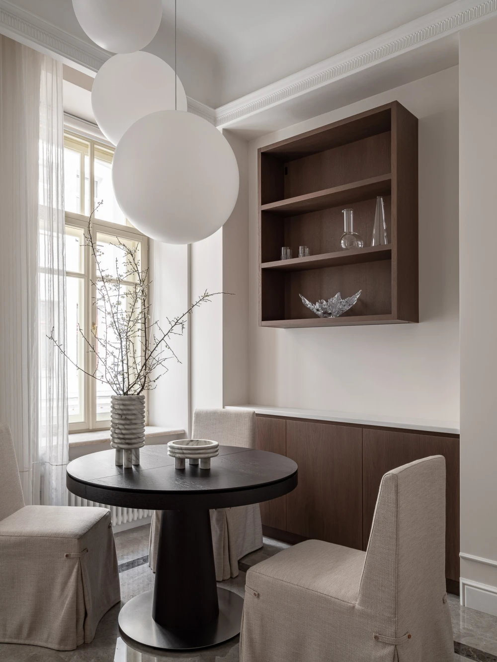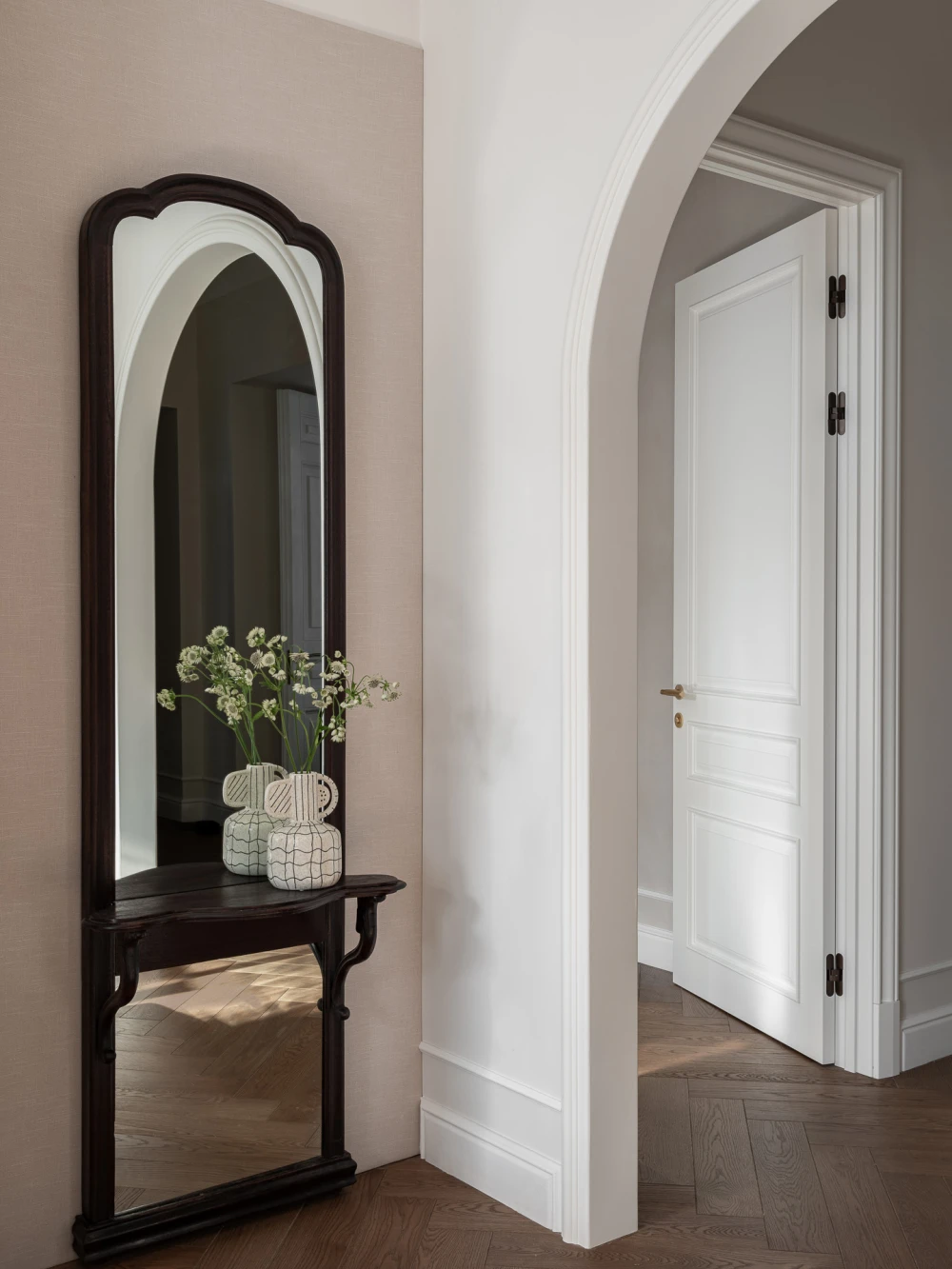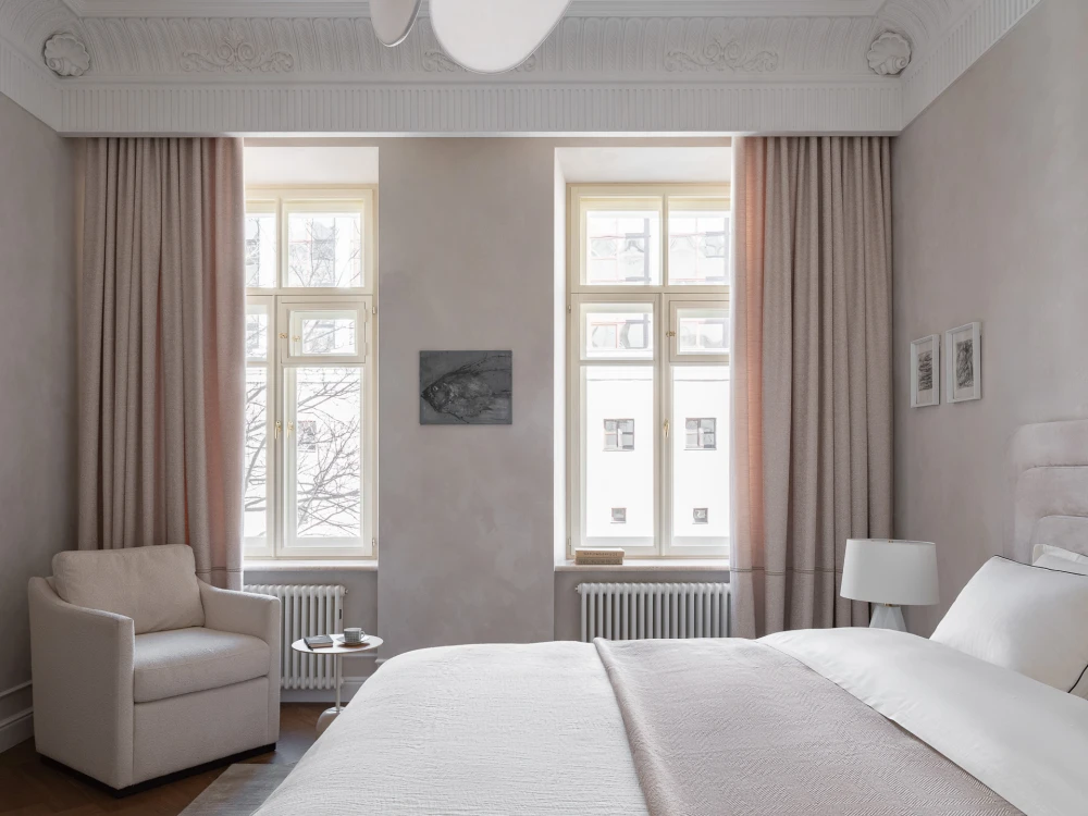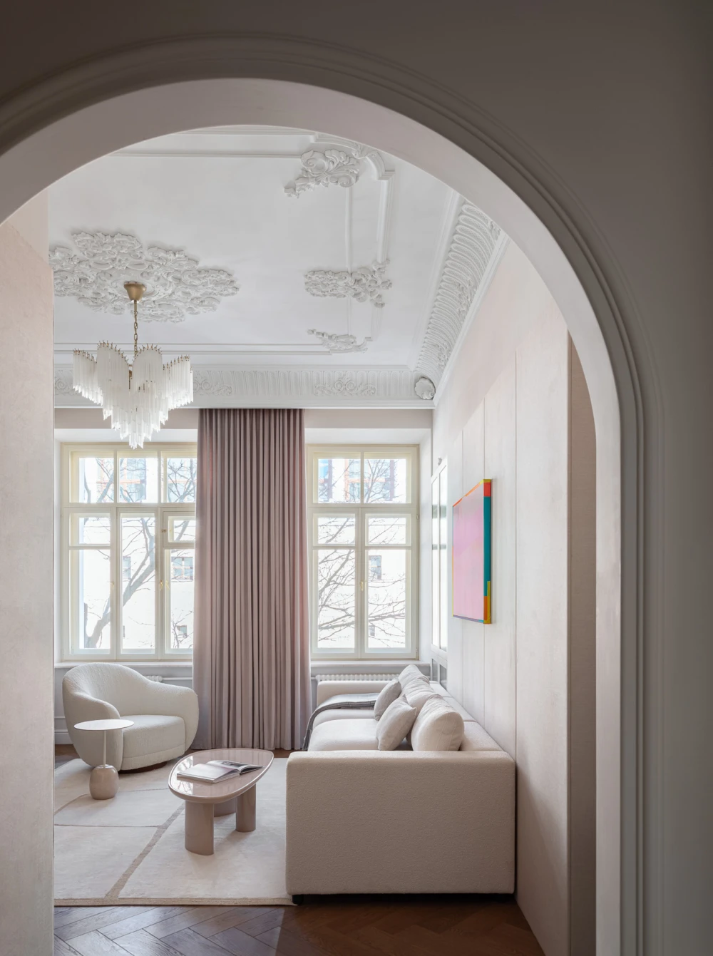 У старого фонда есть своя магия: высокие потолки, лепнина, большие окна с деревянными рамами и артефакты, которые можно случайно найти под скрипящий половицей или полотном обоев, словно переносят в другие эпохи, позволяя почувствовать собственную принадлежность к истории. Квартира, которую оформила Анна Макеева, находится в бывшем доходном доме Бахрушиных. Здание 1901 года постройки отличается характерными для модерна причудливыми ограждениями балконов, которые напоминают тонкие стебли цветов, и капителями с лорелеями.