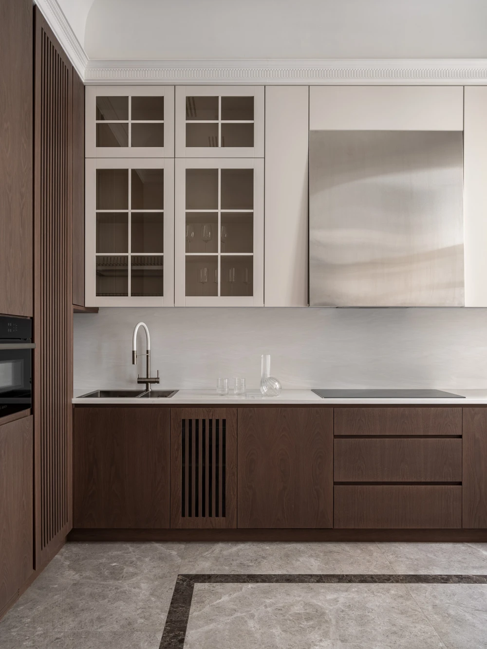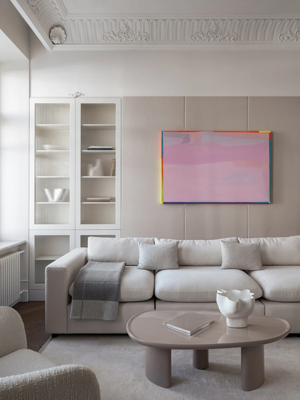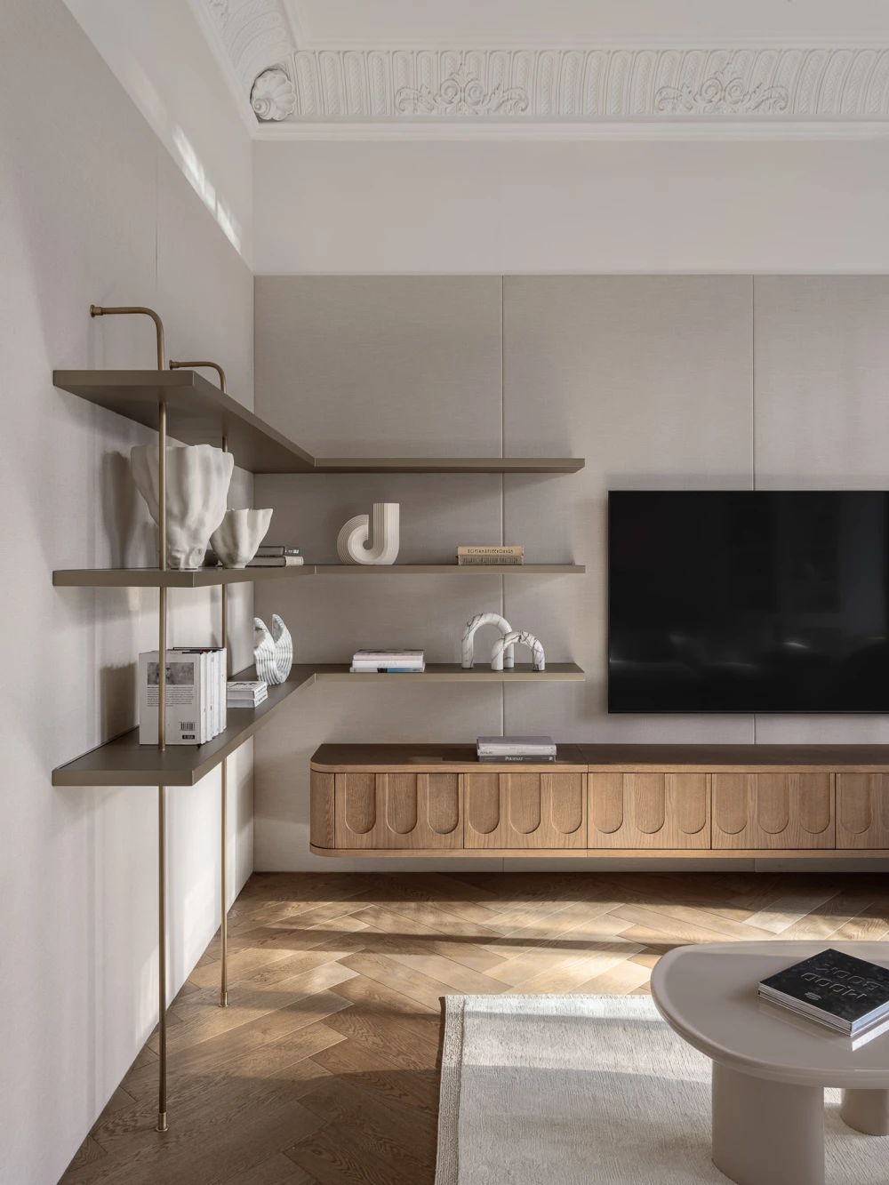 У старого фонда есть своя магия: высокие потолки, лепнина, большие окна с деревянными рамами и артефакты, которые можно случайно найти под скрипящий половицей или полотном обоев, словно переносят в другие эпохи, позволяя почувствовать собственную принадлежность к истории. Квартира, которую оформила Анна Макеева, находится в бывшем доходном доме Бахрушиных. Здание 1901 года постройки отличается характерными для модерна причудливыми ограждениями балконов, которые напоминают тонкие стебли цветов, и капителями с лорелеями.