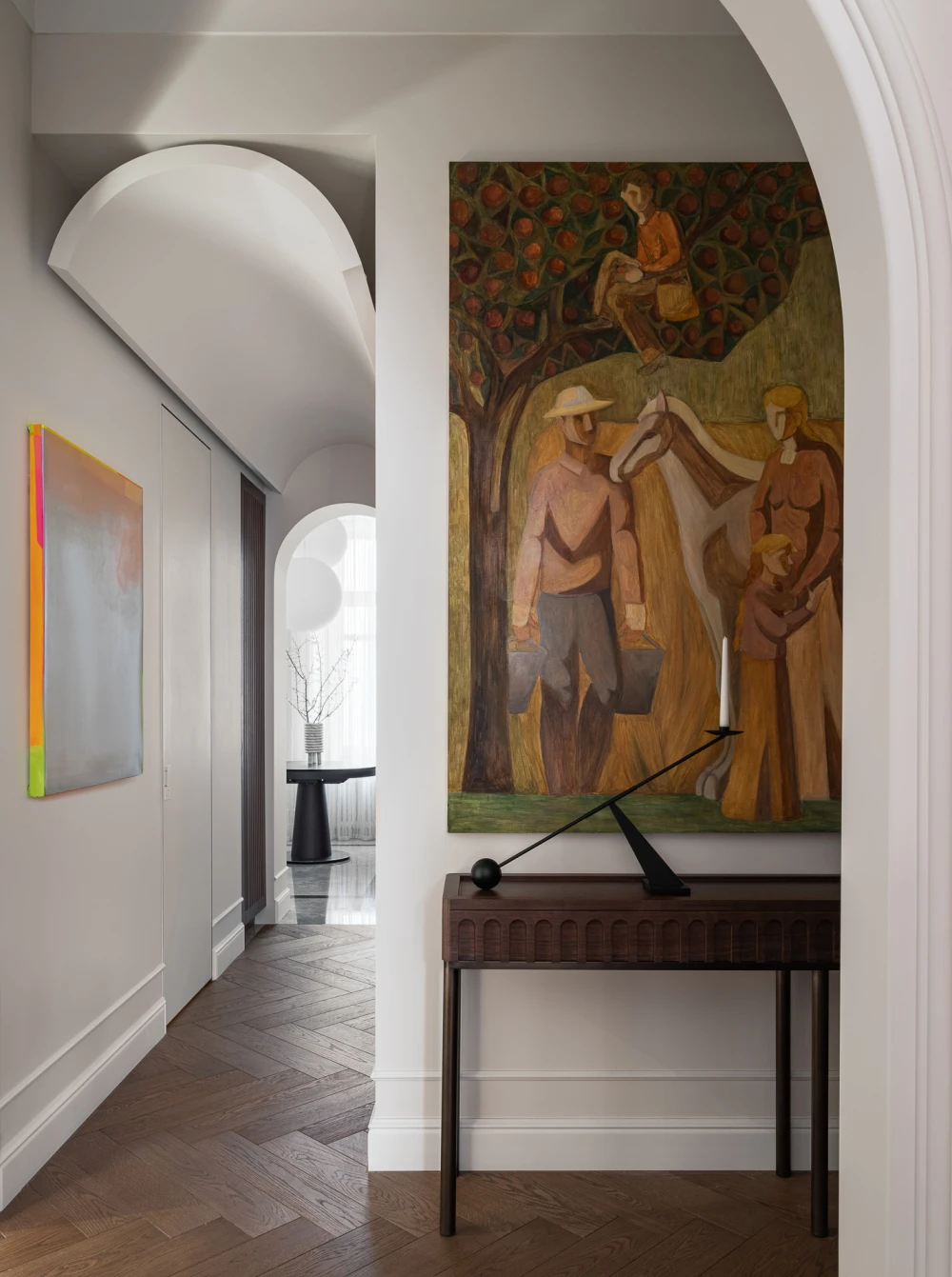 Дополняют бежевую палитру глубокие оттенки дерева, из которого выполнена мебель. «Большая часть предметов создавалась по моим рисункам и чертежам, мне особенно нравится, как получились открытые полки в гостиной, очерчивающие угол комнаты, — говорит Анна, — Картина в прихожей тоже была написана специально для проекта. Заказчица хотела видеть сельскохозяйственный сюжет, а я выбрала колористику и стиль живописи».