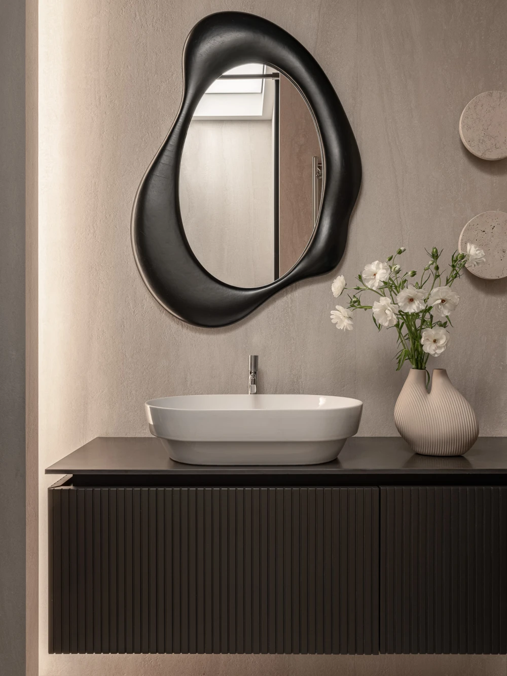 В интерьере дизайнер решила поддержать свойственную стилю плавность линий и декоративность. Так появились богато украшенные карнизы и розетки с растительными мотивами, арочные проемы, ведущие в гостиную и кухню, и полукруглый парящий потолок с подсветкой в коридоре. «По плану БТИ между мокрой точкой и несущей стеной был очень узкий проход, который нельзя было расширить. И чтобы избежать эффекта туннеля, я придумала такое не совсем стандартное решение», — рассказывает Анна.