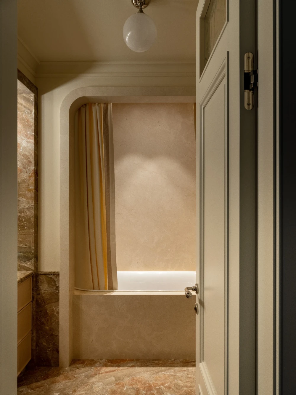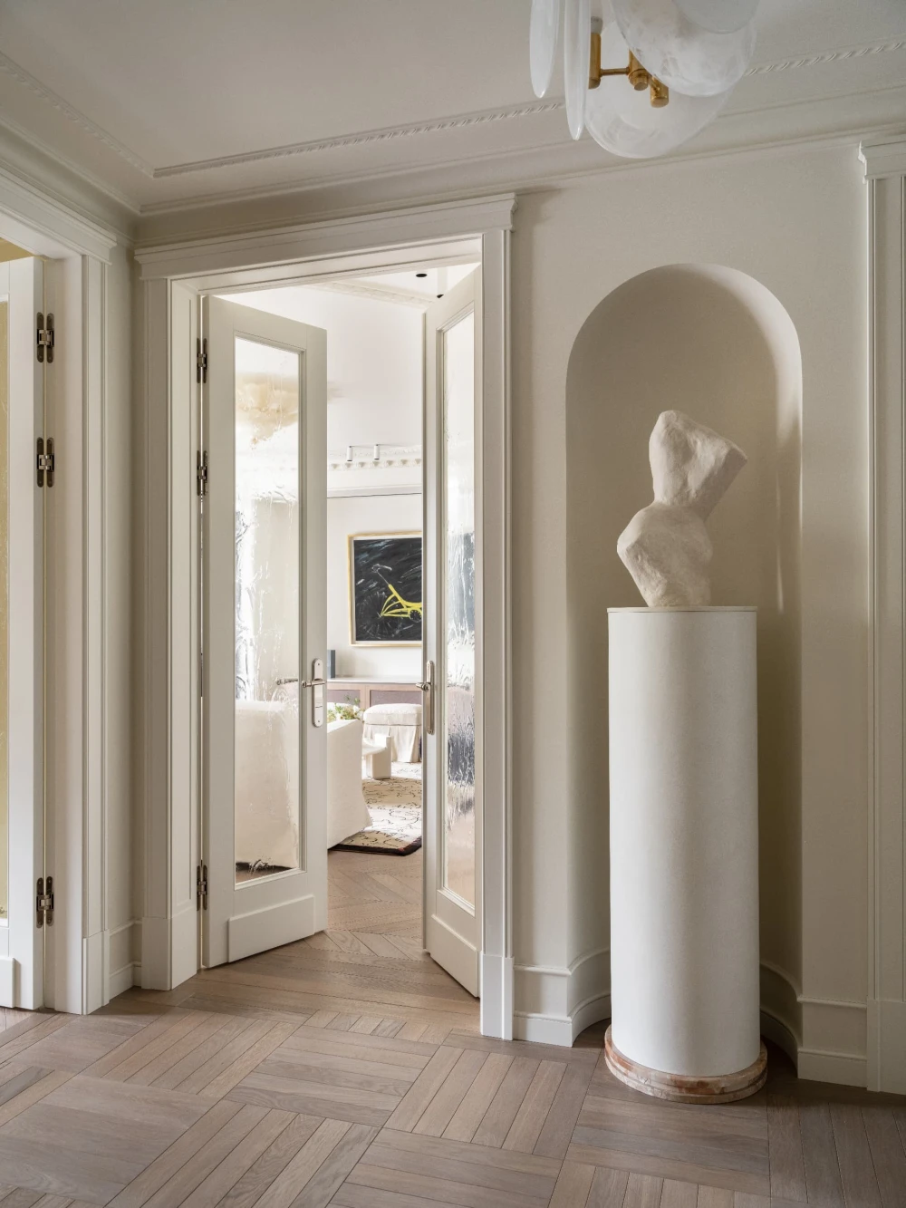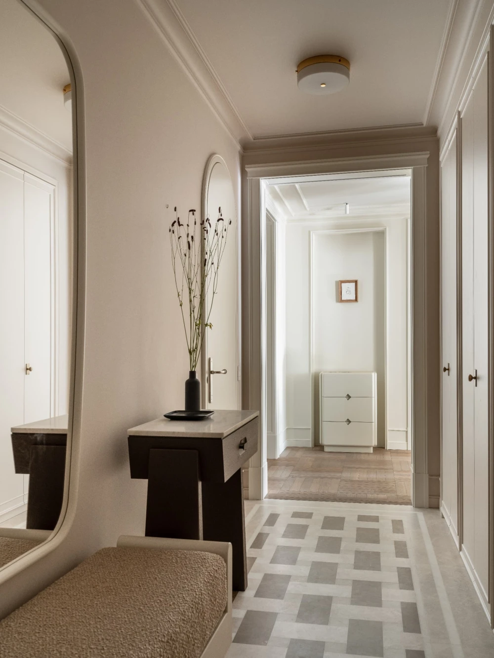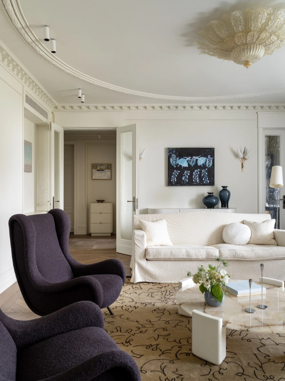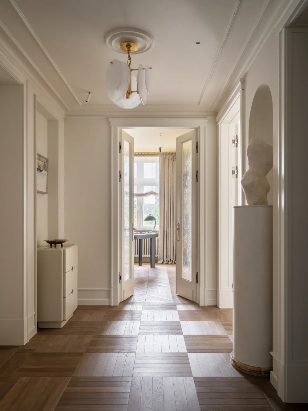 Эта квартира площадью 300 кв. метров на юго-западе Москвы рассказывает историю одной семьи — теплую, наполненную искусством, светом и воспоминаниями. В основе интерьера, над которым работали дизайнеры Снежана Цуцаева и Евгения Дубровская, SE Design Buro, лежит французская эстетика — гипсовая лепнина на потолках, винтажные бра, антикварная мебель и мягкая благородная палитра. Планировочное решение организовано по классическому принципу: есть парадная часть с гостиной и кабинетом, а кухня и столовая разделены нарядным каменным проемом.