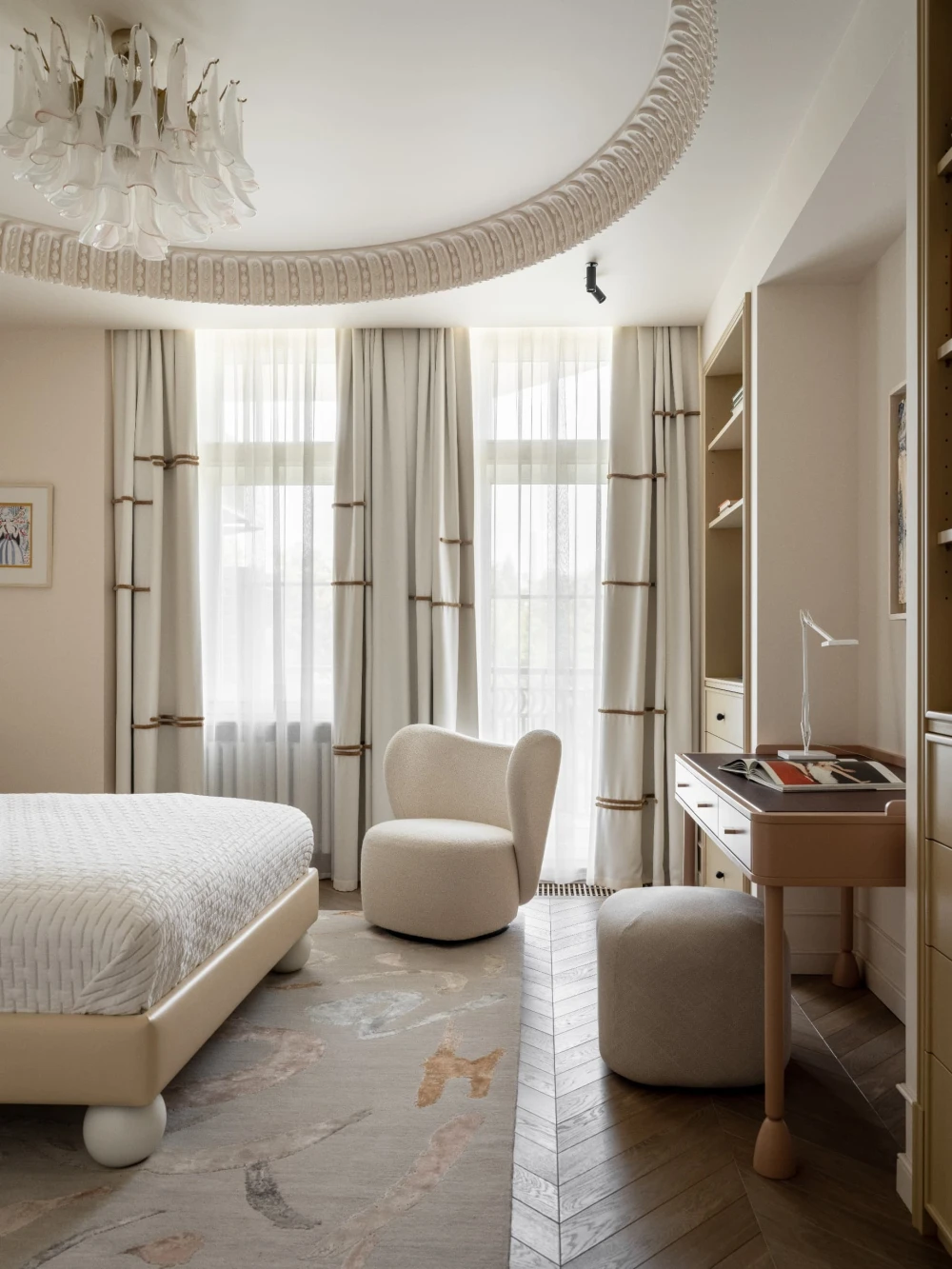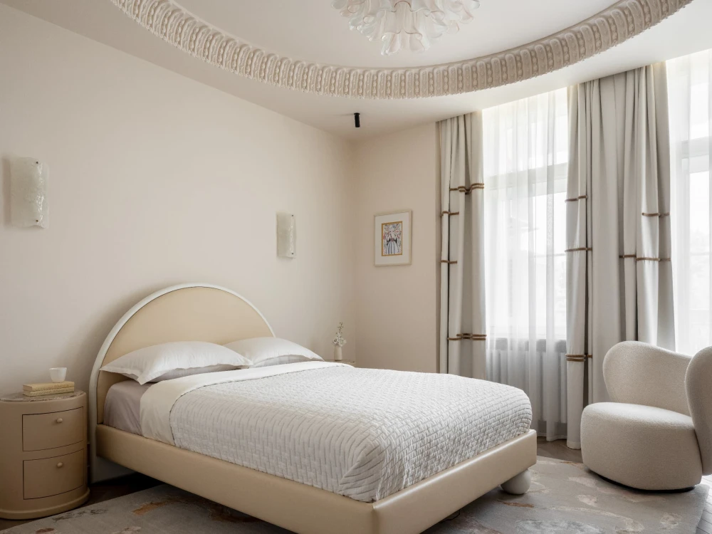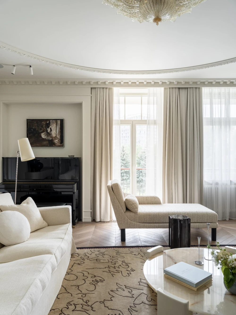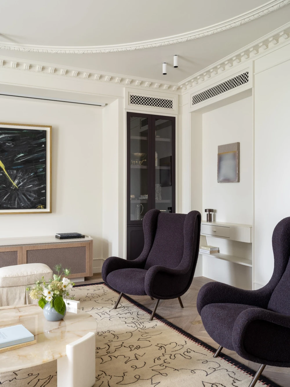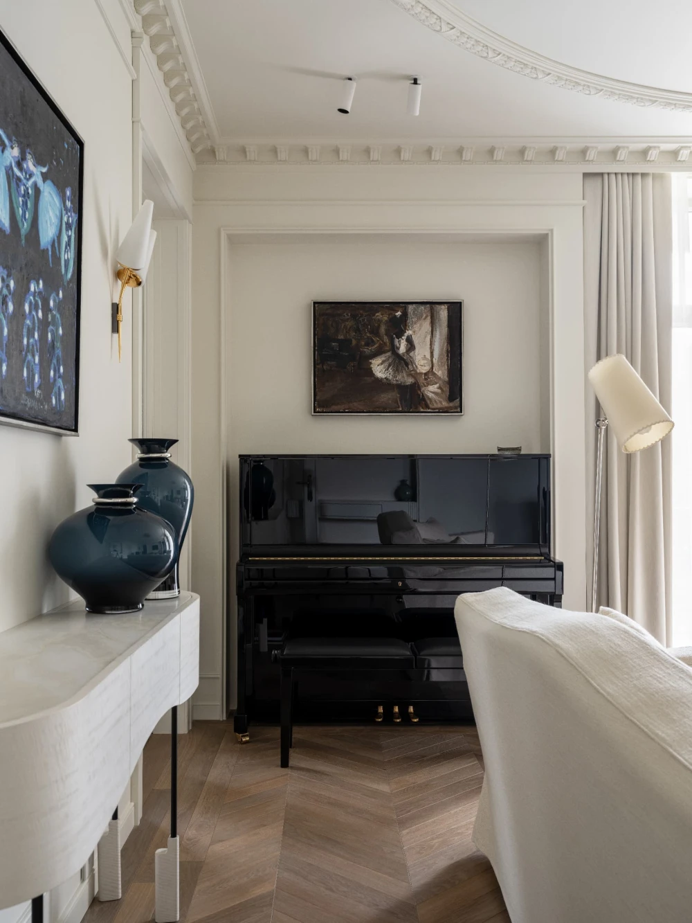 «Каждая деталь в этом интерьере рассказывает о характерах людей, живущих здесь, — говорят авторы проекта. — Вечерами дети музицируют за пианино, наполняя дом звуками любимых мелодий, а семейные фото, обычно украшающие полки, рассказывают историю нескольких поколений. Этот интерьер создан для большой интересной семьи, которая бережно хранит традиции, но живет в ногу со временем. Здесь классические молдинги и элегантная лепнина органично соседствуют с современными произведениями искусства, а стены превращаются в живую летопись благодаря коллекции картин и фотографий, пополняемой годами. Пространство живет в ритме своих хозяев: книги и картины, настольные лампы и торшеры, включенные даже днем, создают атмосферу уюта и уединенности».