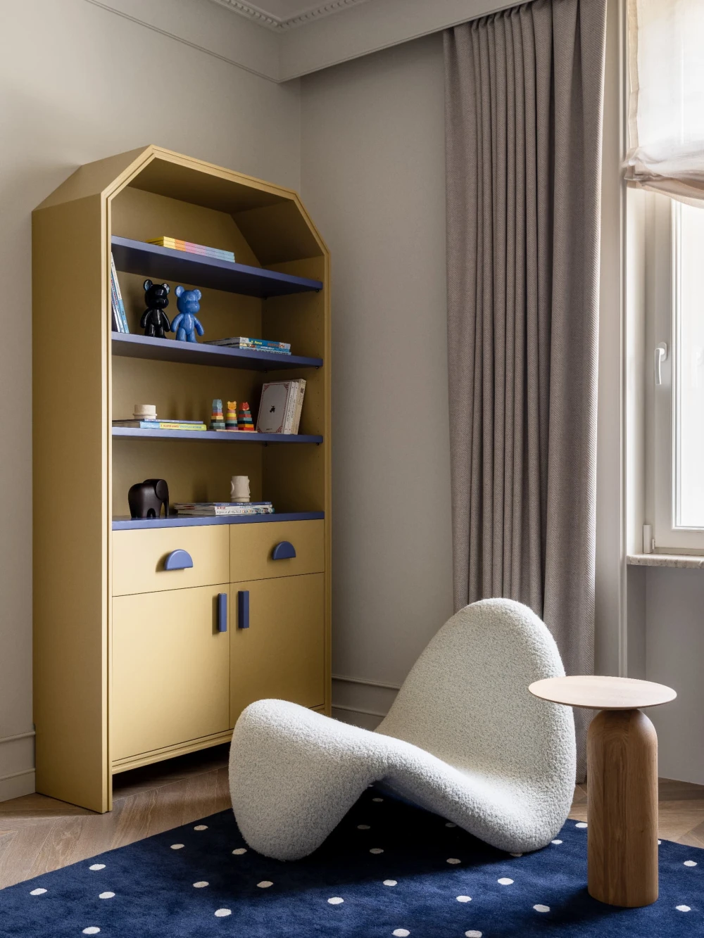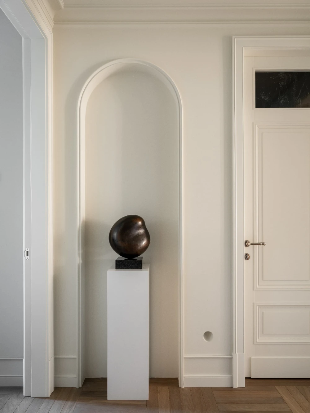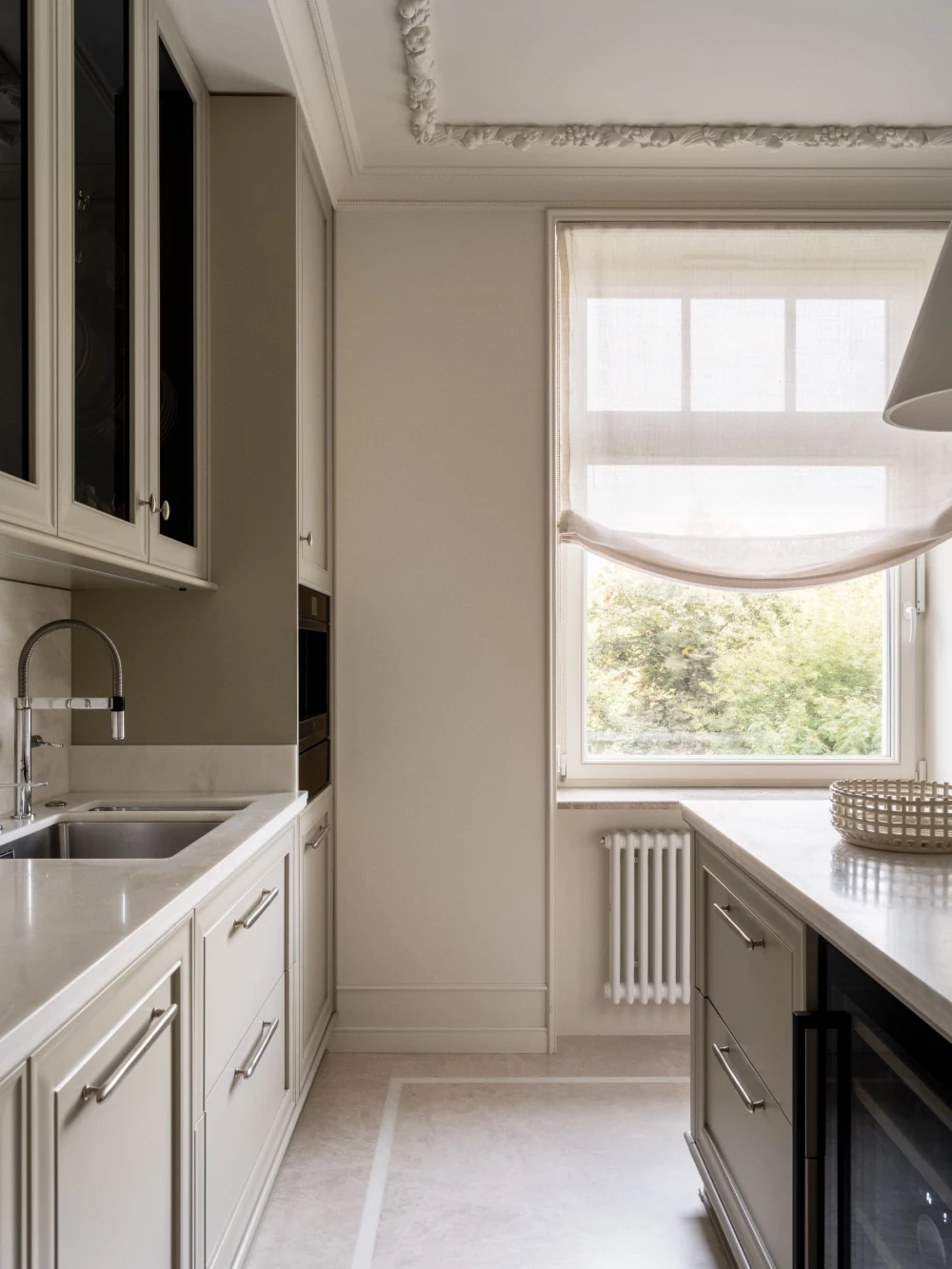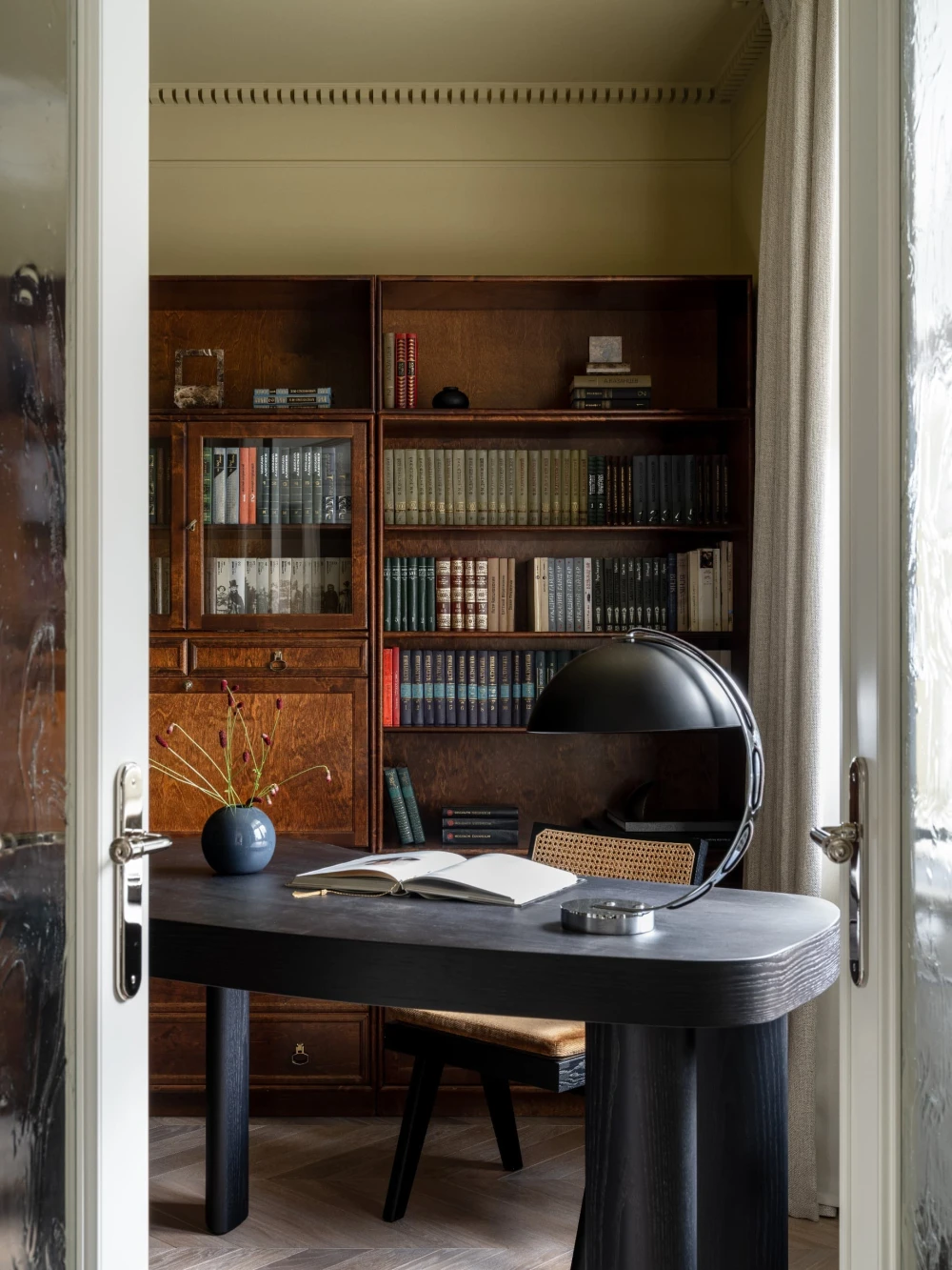 «Каждая деталь в этом интерьере рассказывает о характерах людей, живущих здесь, — говорят авторы проекта. — Вечерами дети музицируют за пианино, наполняя дом звуками любимых мелодий, а семейные фото, обычно украшающие полки, рассказывают историю нескольких поколений. Этот интерьер создан для большой интересной семьи, которая бережно хранит традиции, но живет в ногу со временем. Здесь классические молдинги и элегантная лепнина органично соседствуют с современными произведениями искусства, а стены превращаются в живую летопись благодаря коллекции картин и фотографий, пополняемой годами. Пространство живет в ритме своих хозяев: книги и картины, настольные лампы и торшеры, включенные даже днем, создают атмосферу уюта и уединенности».