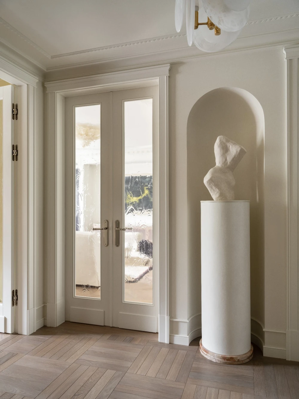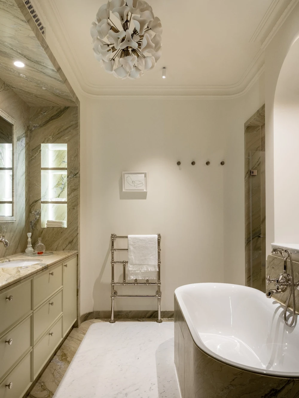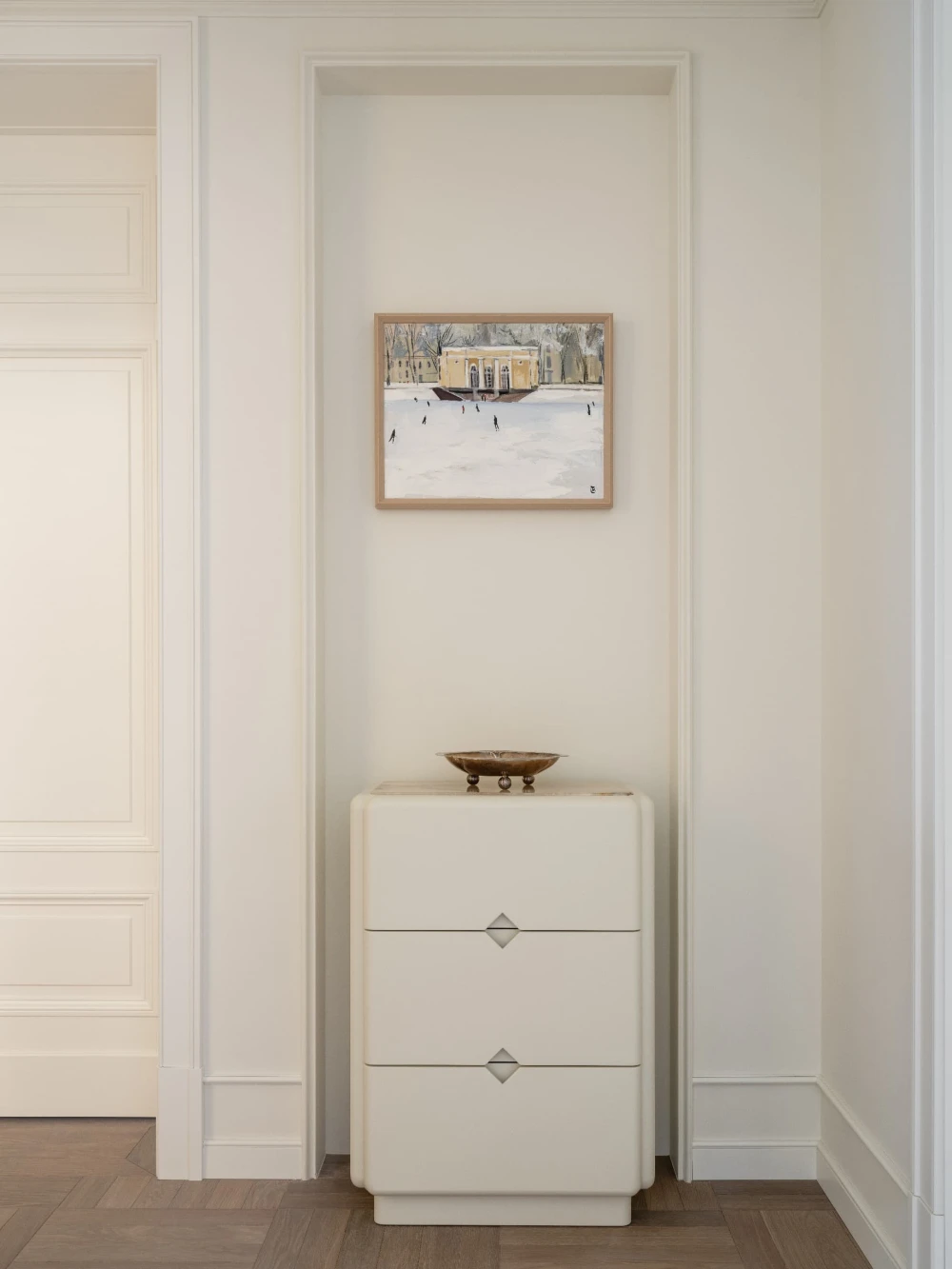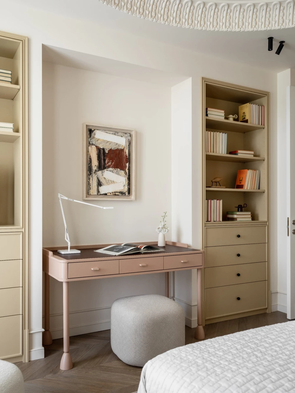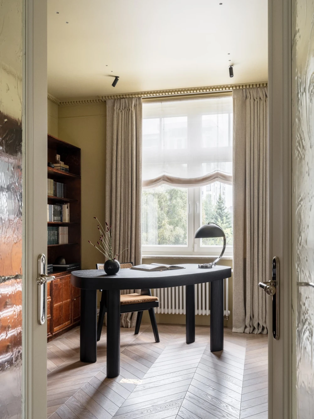 «Каждая деталь в этом интерьере рассказывает о характерах людей, живущих здесь, — говорят авторы проекта. — Вечерами дети музицируют за пианино, наполняя дом звуками любимых мелодий, а семейные фото, обычно украшающие полки, рассказывают историю нескольких поколений. Этот интерьер создан для большой интересной семьи, которая бережно хранит традиции, но живет в ногу со временем. Здесь классические молдинги и элегантная лепнина органично соседствуют с современными произведениями искусства, а стены превращаются в живую летопись благодаря коллекции картин и фотографий, пополняемой годами. Пространство живет в ритме своих хозяев: книги и картины, настольные лампы и торшеры, включенные даже днем, создают атмосферу уюта и уединенности».