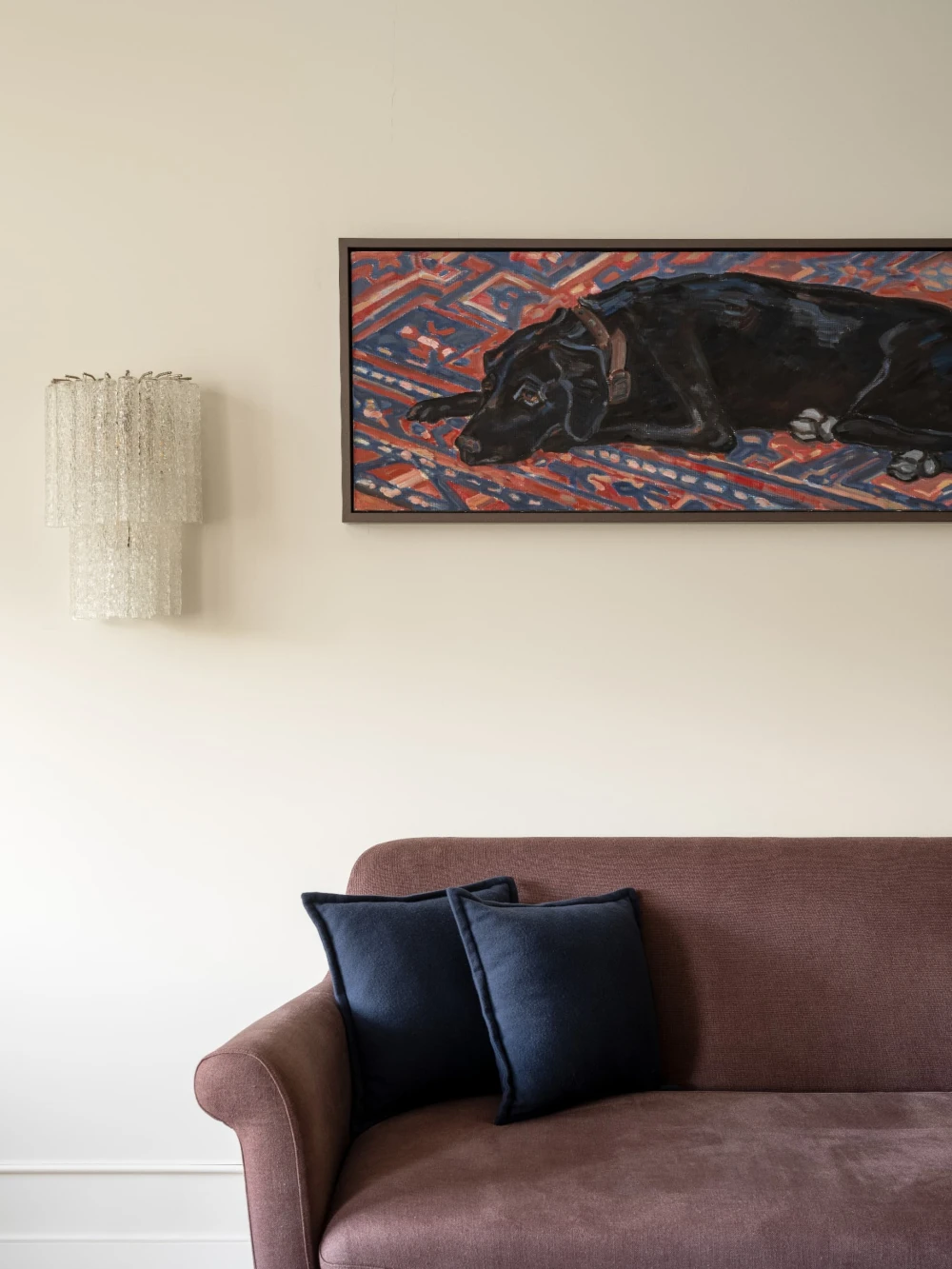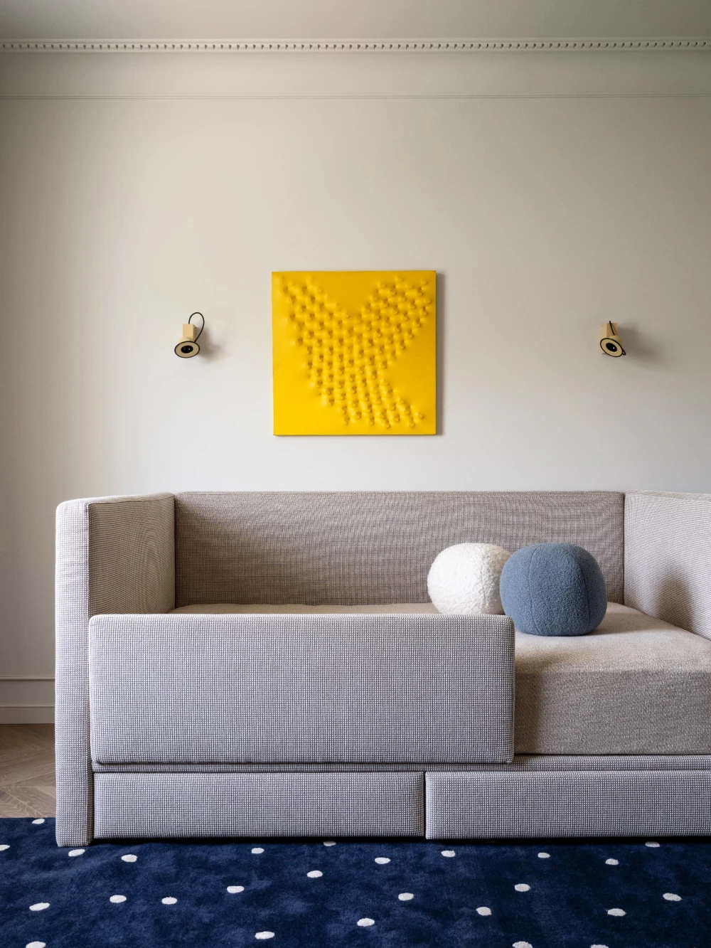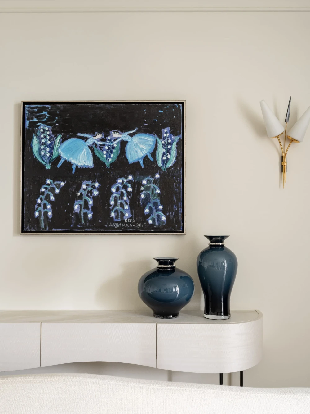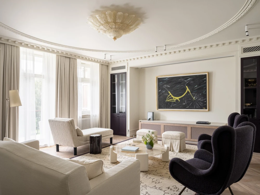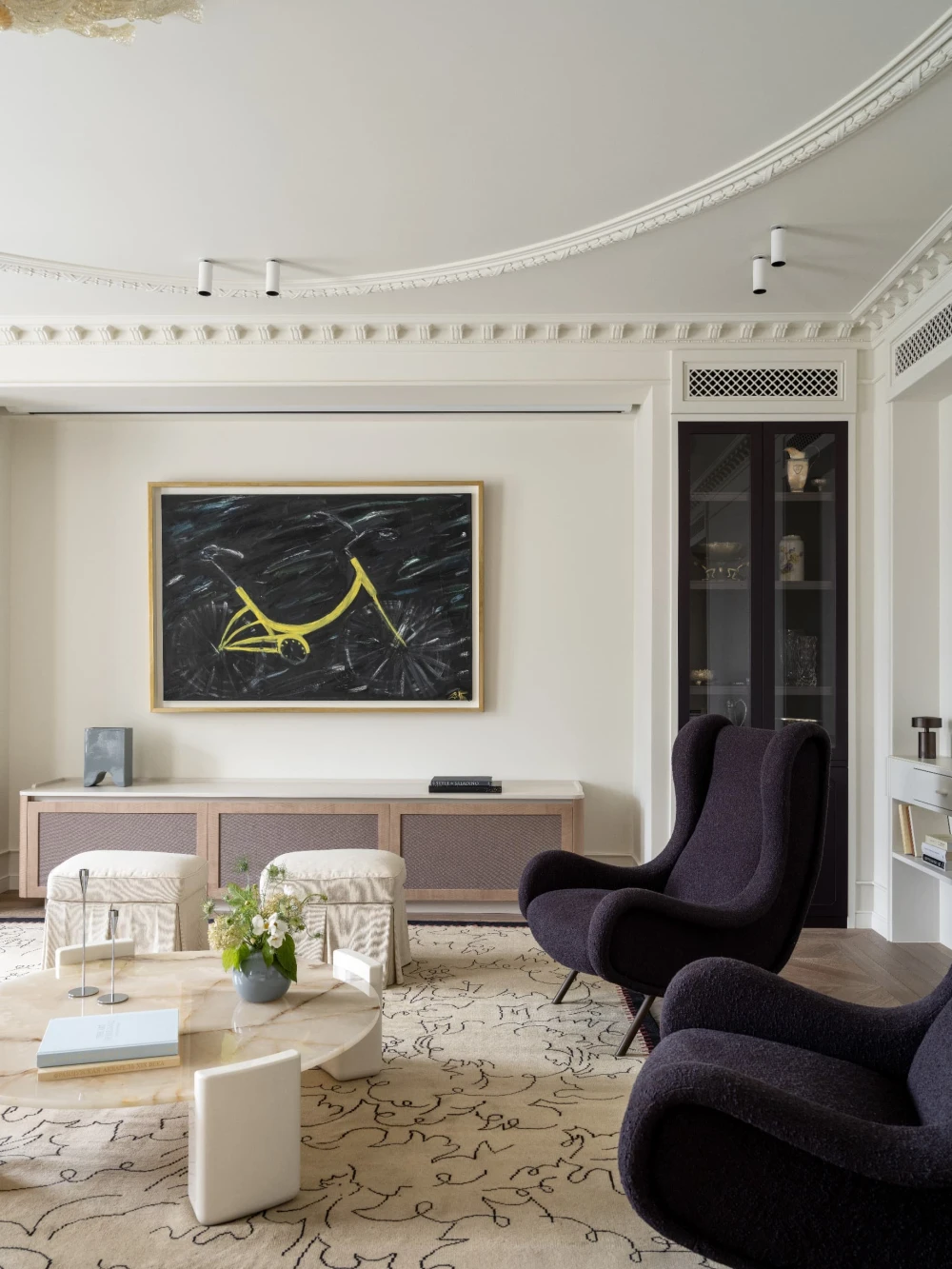 «Все члены семьи являются настоящими киноманами, поэтому в гостиной предусмотрено все необходимое: удобный диван, стильные кресла и просторная лежанка, идеально подходящая для просмотра фильмов. По команде клавиши режима «Кино» из потолочной ниши опускается экран, а шторы автоматически закрываются, создавая идеальные условия для погружения в сюжет. В те моменты, когда экран не используется, гостиную украшает великолепная работа Анны Бирштейн «Велосипед» — неожиданный, но гармоничный акцент в таком классическом интерьере».