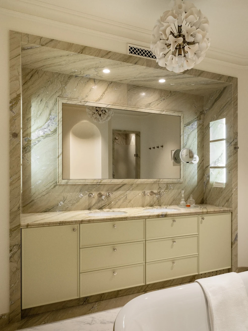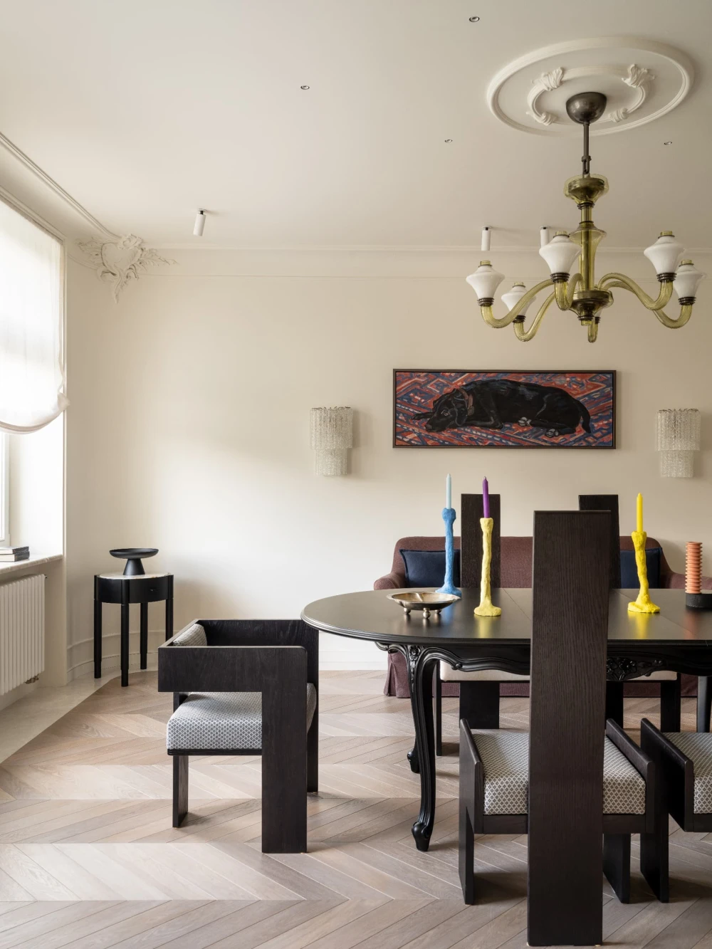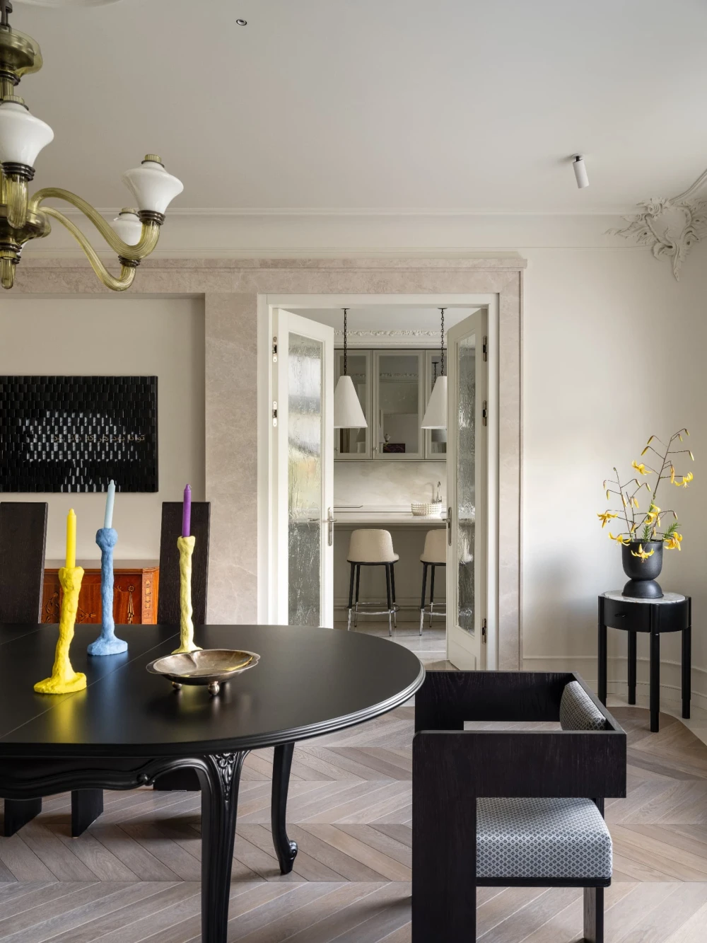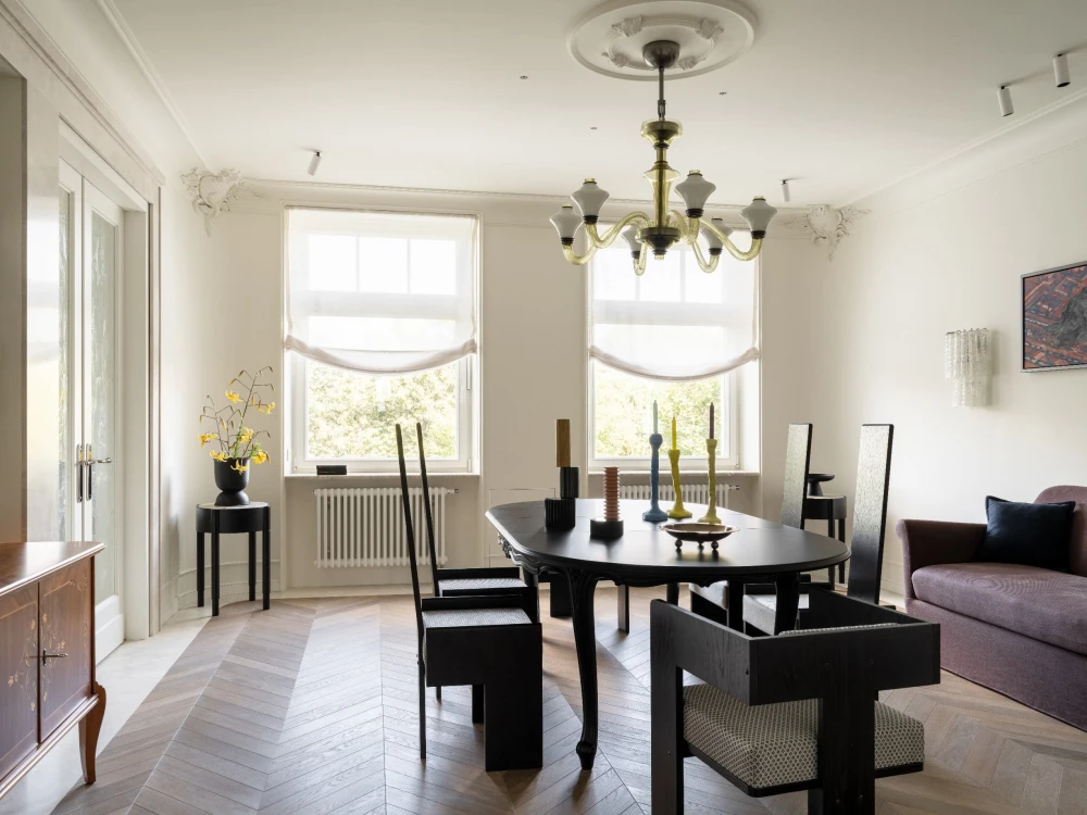«Особого внимания заслуживает изолированная столовая — редкость для современных квартир, где царит мода на открытые планировки. Здесь зонирование становится данью уважения семейным традициям, позволяет сохранить атмосферу торжественности и уюта. За большим столом собираются родные и друзья, чтобы насладиться беседами и неспешными вечерами. Некоторые предметы мебели и освещения переехали сюда из прошлого — они служат уже третьему поколению, соединяя историю с настоящим. Здесь каждый предмет — отражение вкуса и характера его владельцев, а каждый вечер превращается в маленький праздник жизни».