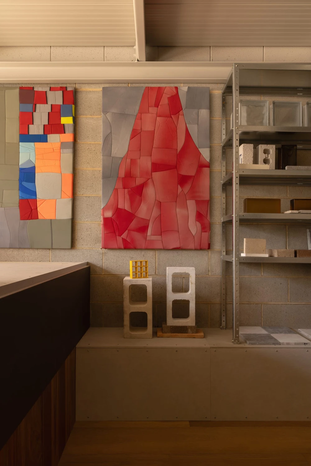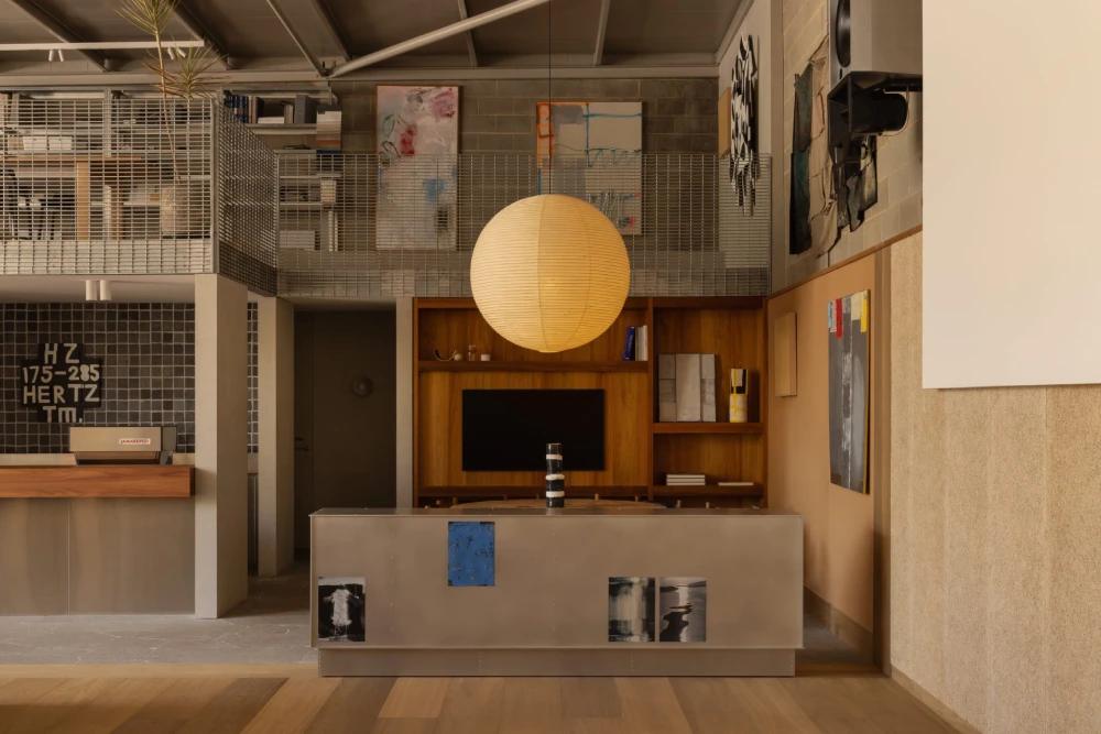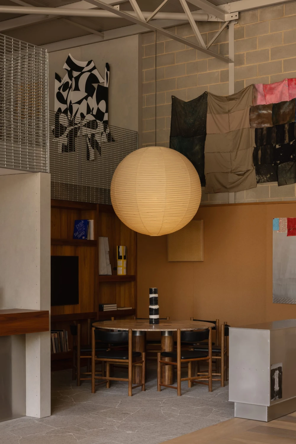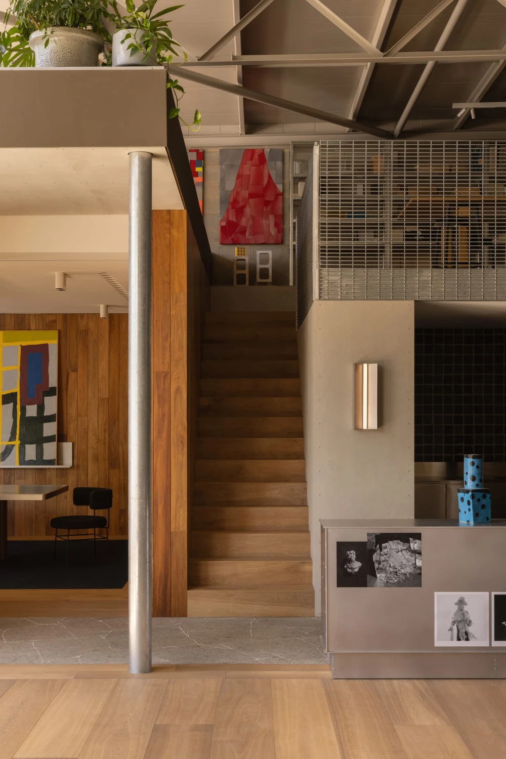 Художественная экспозиция, куратором которой стал Джеймс Браун, объединяет работы Нико Крайно, Эммалин Занелли, Мадлен Коллопи, Хари Кутлакиса и Генри Джока Уокера, а также самого Брауна. Их произведения служат акцентами в интерьере, эффектно контрастируя с бетонной и деревянной фактурой стен. Монохромная сдержанная основа превращается в сцену для ярких визуальных жестов — будто само пространство вдохновляет художников на диалог.