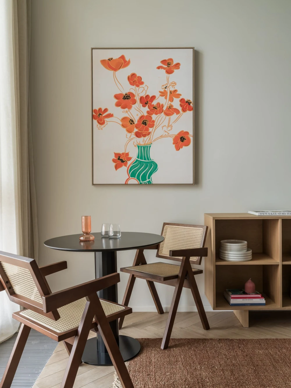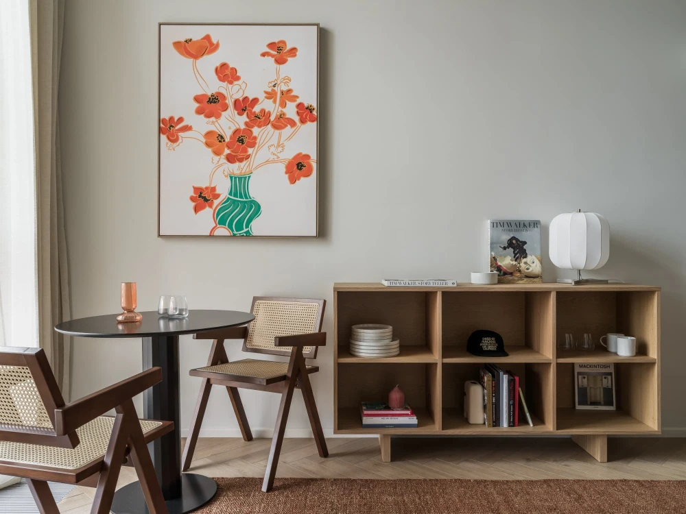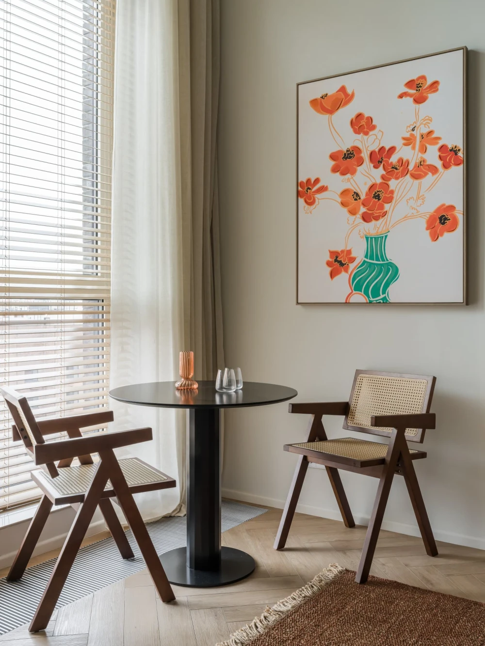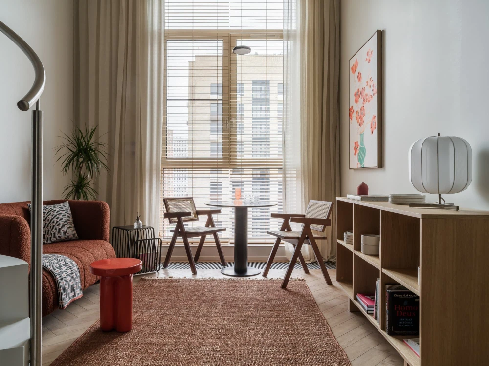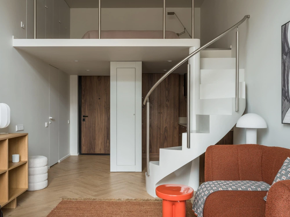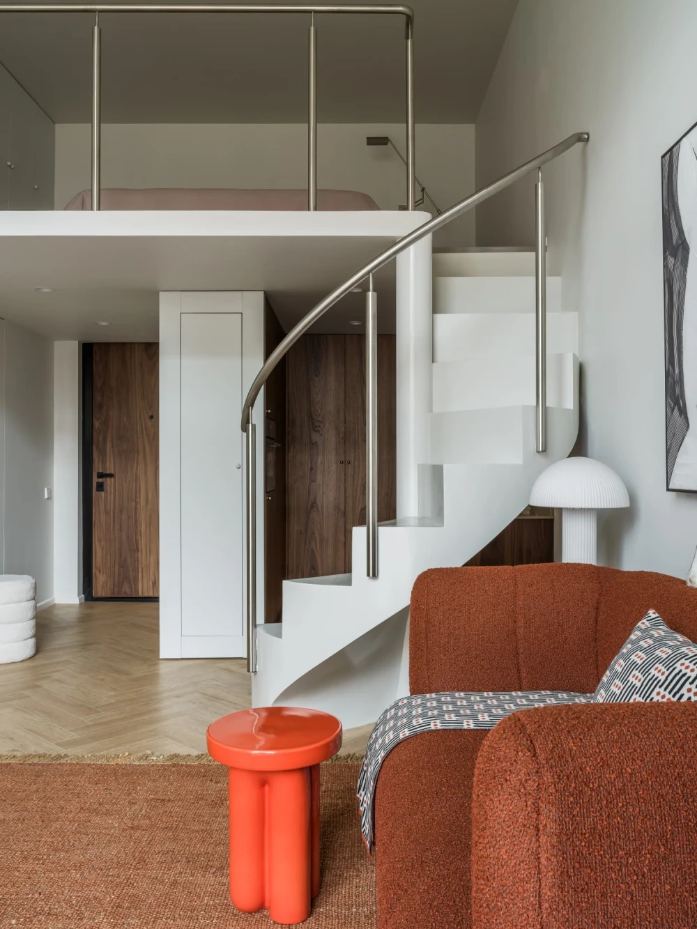 Михаил Шишкин спроектировал в новостройке на севере Москвы интерьер, который выстроен на балансе архитектурной строгости и тактильного уюта. На площади 28 кв. метров дизайнеру предстояло создать современное европейское пространство в теплых тонах, которое в будущем будет сдаваться в аренду. Высота потолков — 3,8 метра — задала главный вектор планировочного решения: антресольный уровень позволил вынести приватные зоны — спальню и гардероб — наверх, полностью освободив первый этаж для гостиной и столовой.