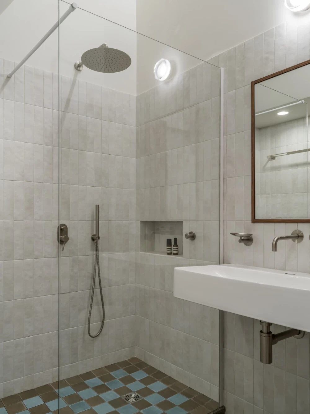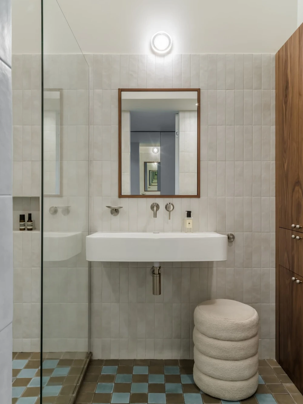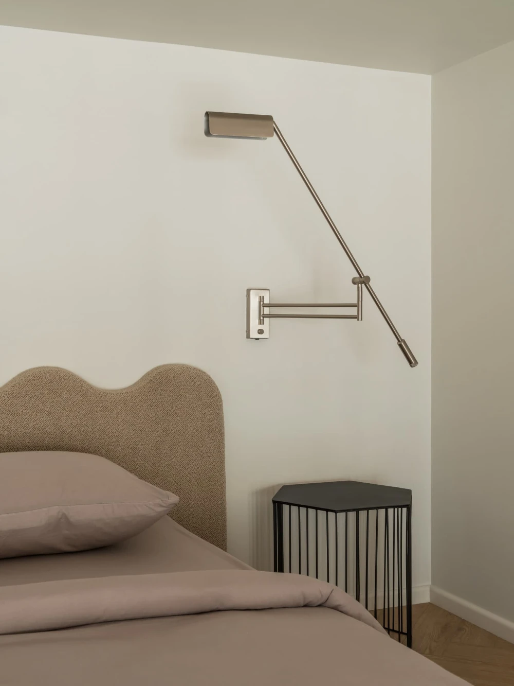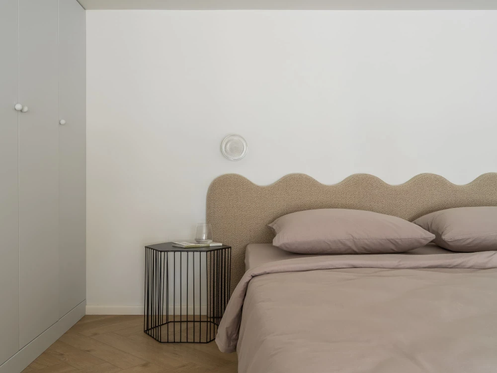 «Мебель, как и всегда, подбиралась исходя из габаритов помещения и функционала. В этом проекте нам удалось найти практически все в одном магазине — индивидуально изготовили только кровать. Благодаря высоте потолка мы смогли использовать часть верхнего пространства для гардероба, а часть оставить открытой. Особого внимания заслуживает санузел — здесь за счет скошенного потолка и тщательно выстроенного освещения удалось добиться эффекта второго света: мягкого, рассеянного, архитектурного».
