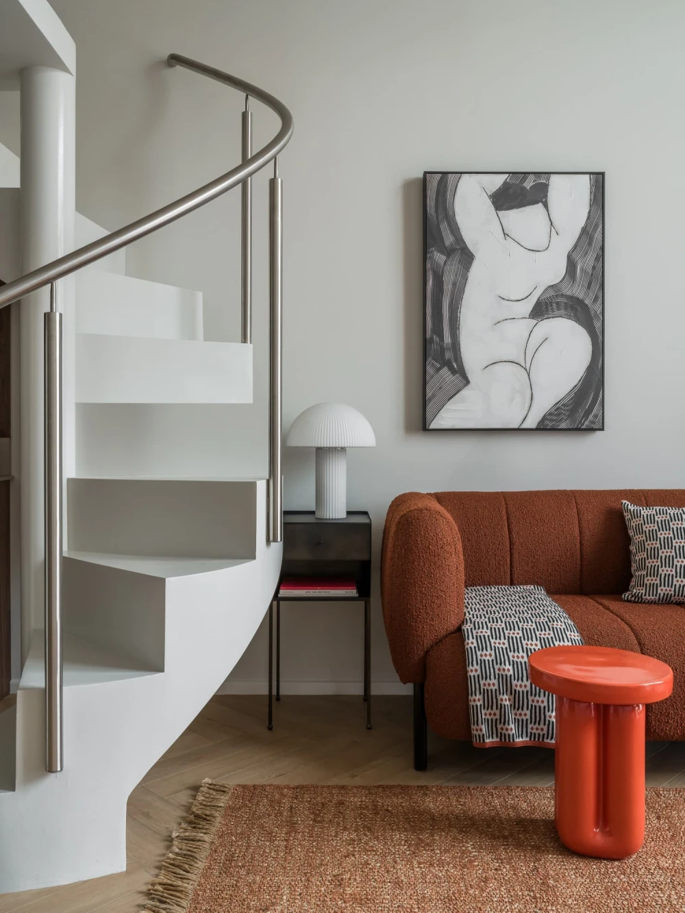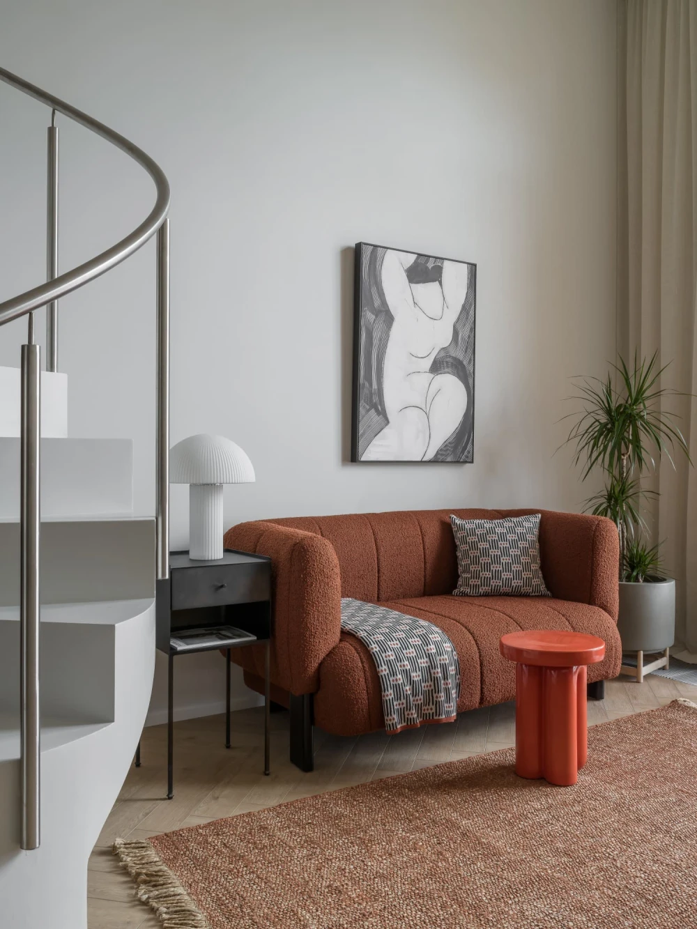 «Основной задачей стало найти решение для доступа на второй уровень — нам была нужна лестница, которая, оставаясь легкой и элегантной, одновременно служила бы декоративным элементом. Ее образ родился из общей концепции: я предпочитаю светлые, насыщенные фактурами пространства, где каждый элемент, обладая собственной выразительностью, работает на общую идею. Включенная в техзадание осенняя палитра гармонично объединила весь интерьер».