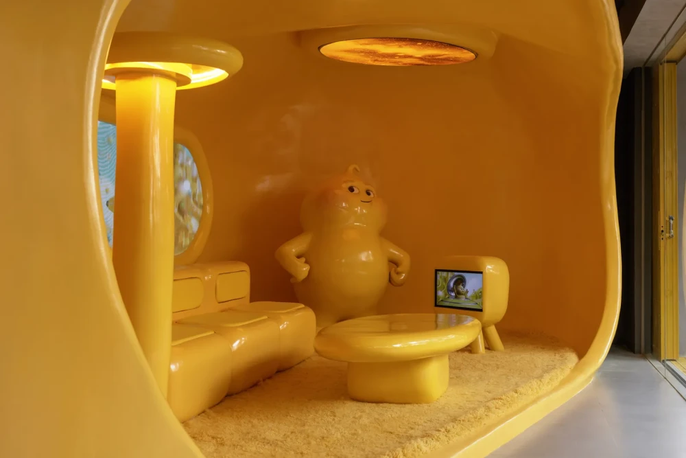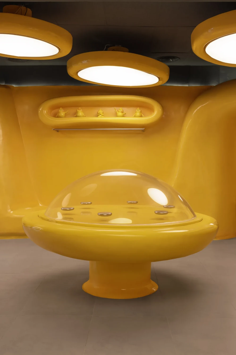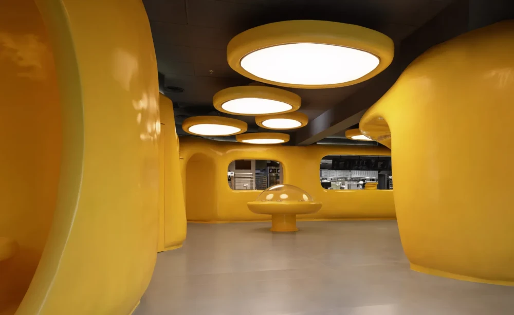 За интерьер отвечала команда Crosby Studios, которая хотела создать место, где посетители смогут выйти за рамки обыденности и погрузиться в другую реальность. Пространство формирует серия желтых объемов с обтекаемыми формами, которые блестят в свете таких же причудливых ламп. В объемах, как в брикете сливочного масла, вырезаны полки, банкетки и столики. В центре магазина разместилась витрина, похожая на летающую тарелку, со стеклянным куполом и парящими хромированными подставками для десертов.