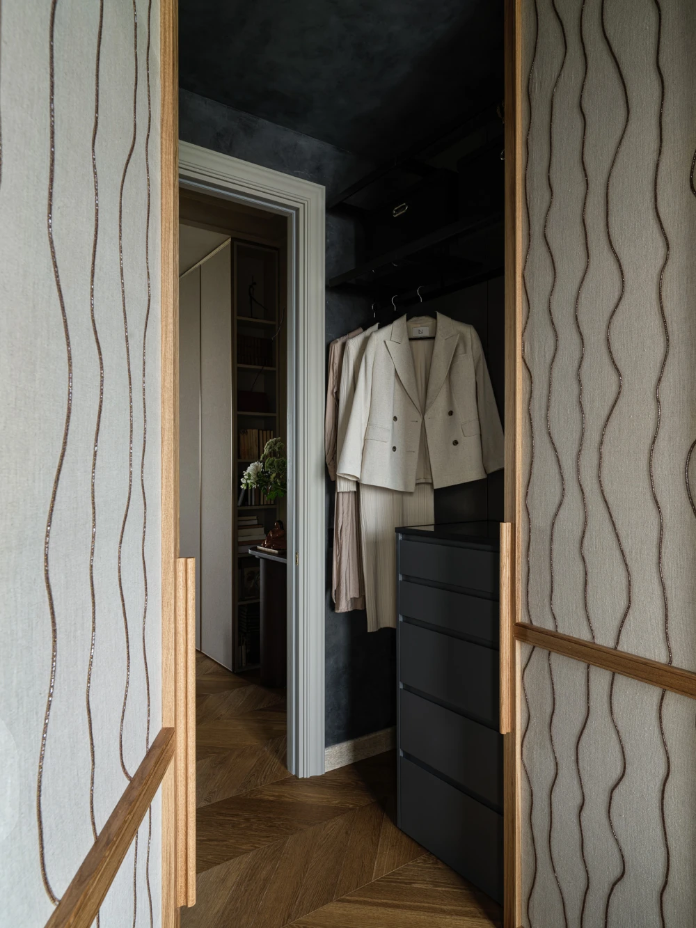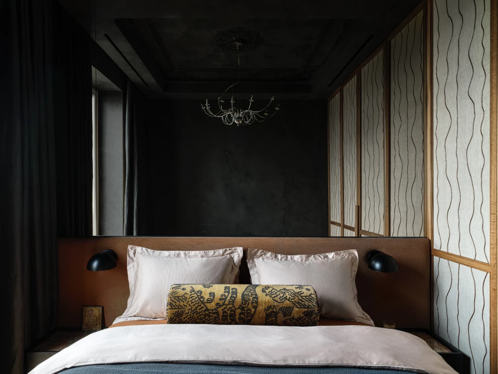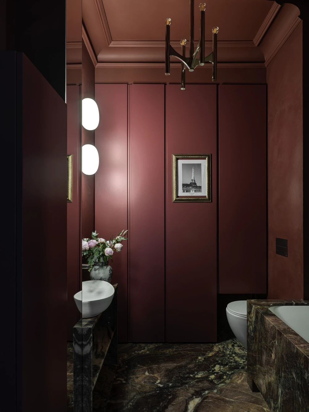 «Палитра подчеркивает настроение каждого пространства: умиротворенный золотой зал, бодрящая винная ванная и черная спальня-шкатулка. Технологические решения органично вписаны в интерьер: канальные кондиционеры интегрированы в гипсовую лепнину, вместо телевизора — лазерный проектор, а полноценная постирочная скрыта за фасадами ванной».