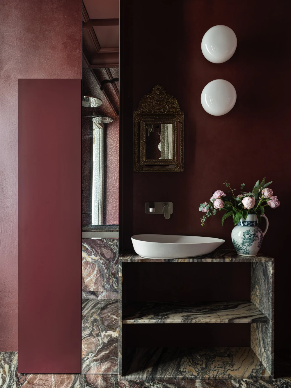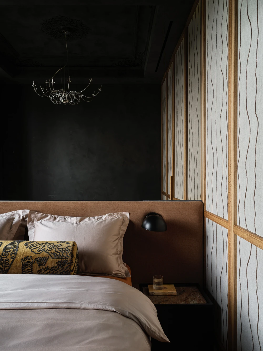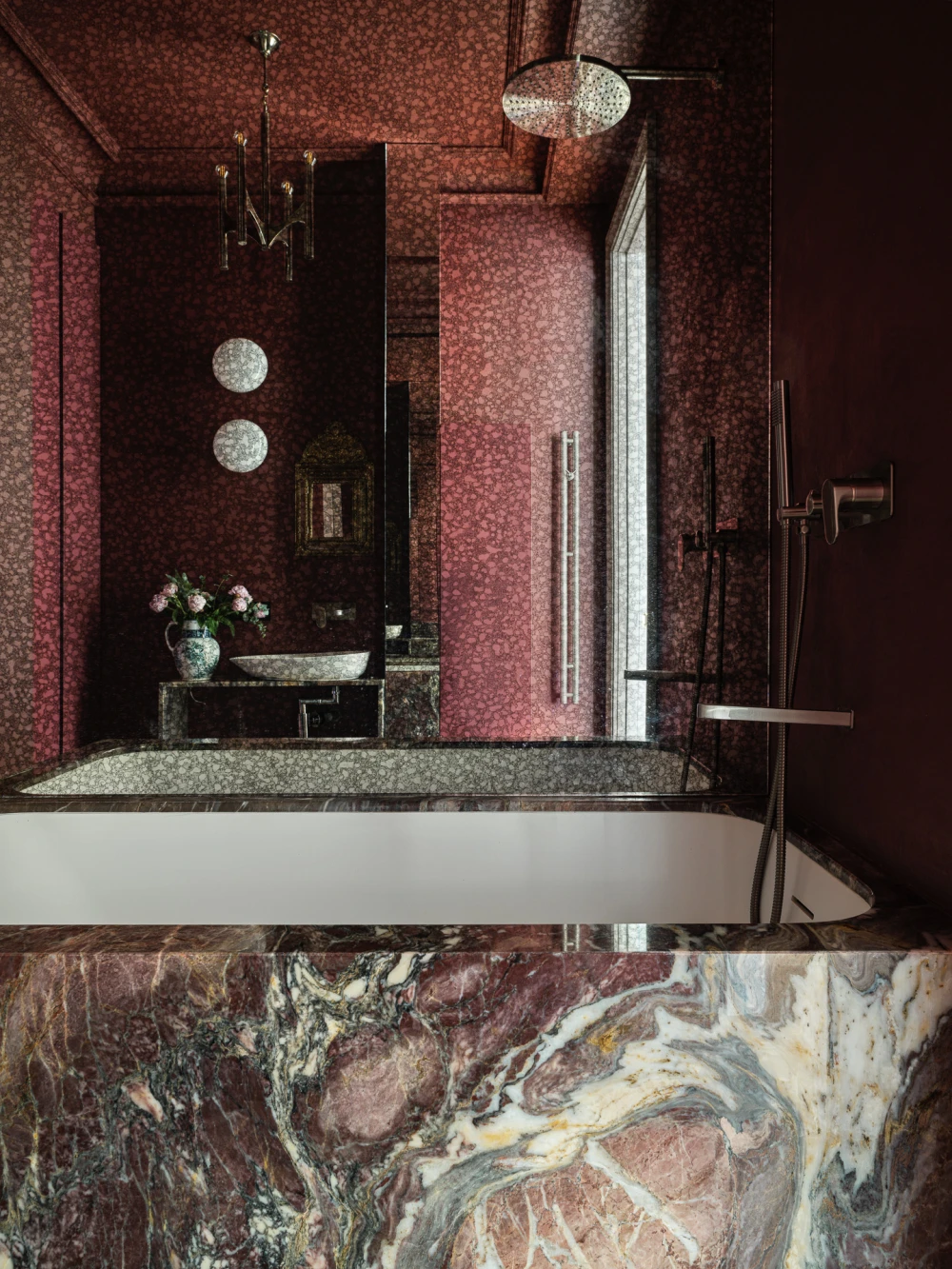 «Палитра подчеркивает настроение каждого пространства: умиротворенный золотой зал, бодрящая винная ванная и черная спальня-шкатулка. Технологические решения органично вписаны в интерьер: канальные кондиционеры интегрированы в гипсовую лепнину, вместо телевизора — лазерный проектор, а полноценная постирочная скрыта за фасадами ванной».