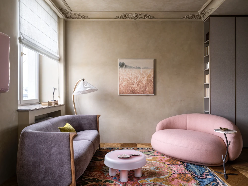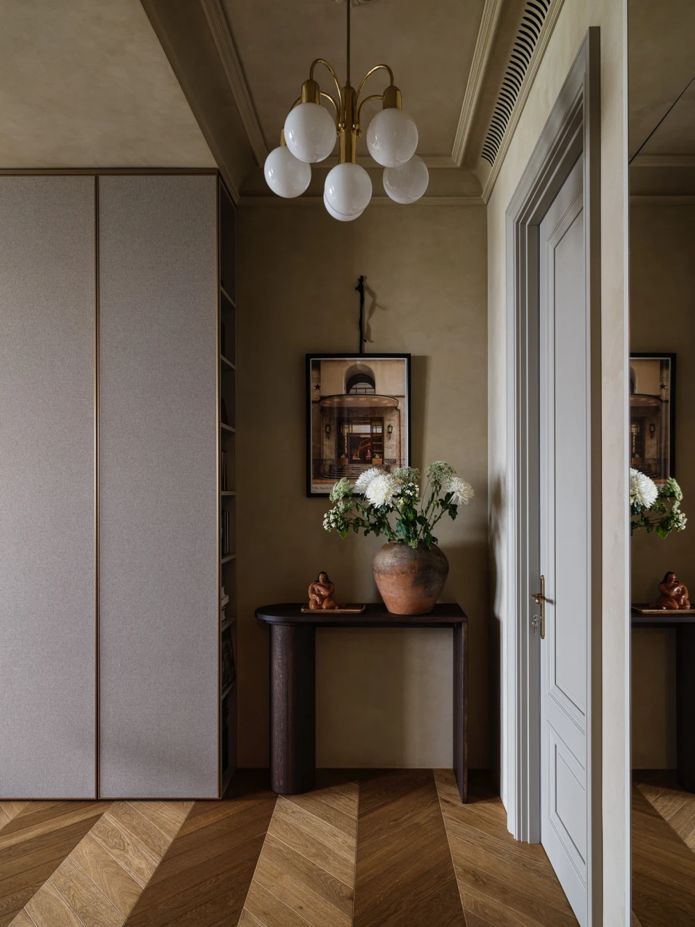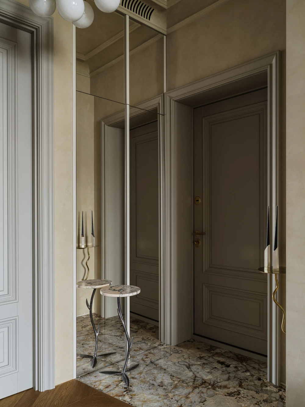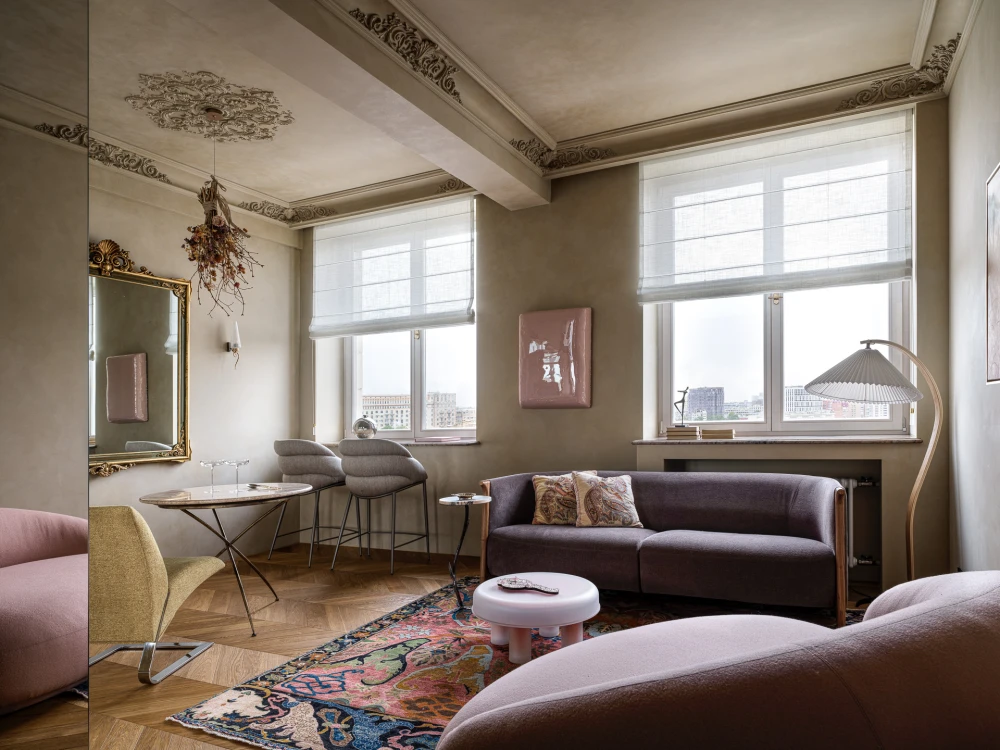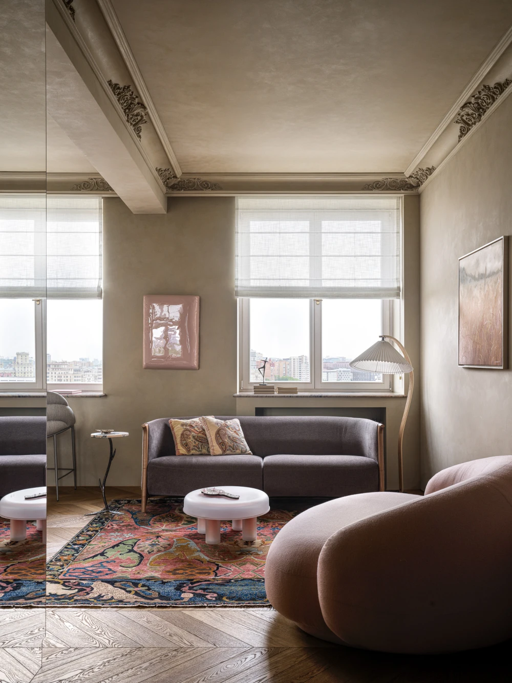 «К сожалению, предыдущие владельцы не сохранили историческое наследие квартиры, поэтому было принято решение создать интерьер на стыке современности и античности. Для меня как для заказчика и автора проекта было важно раскрыть тот потенциал, который скрывался в этом пространстве. Меня вдохновили большие окна с массивными откосами, высота потолка и, конечно, вид на город, который открывается из каждой комнаты. Это было большим подарком — найти уникальное здание с историей и с завораживающим динамичным видом на город».