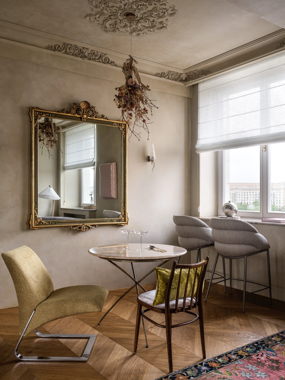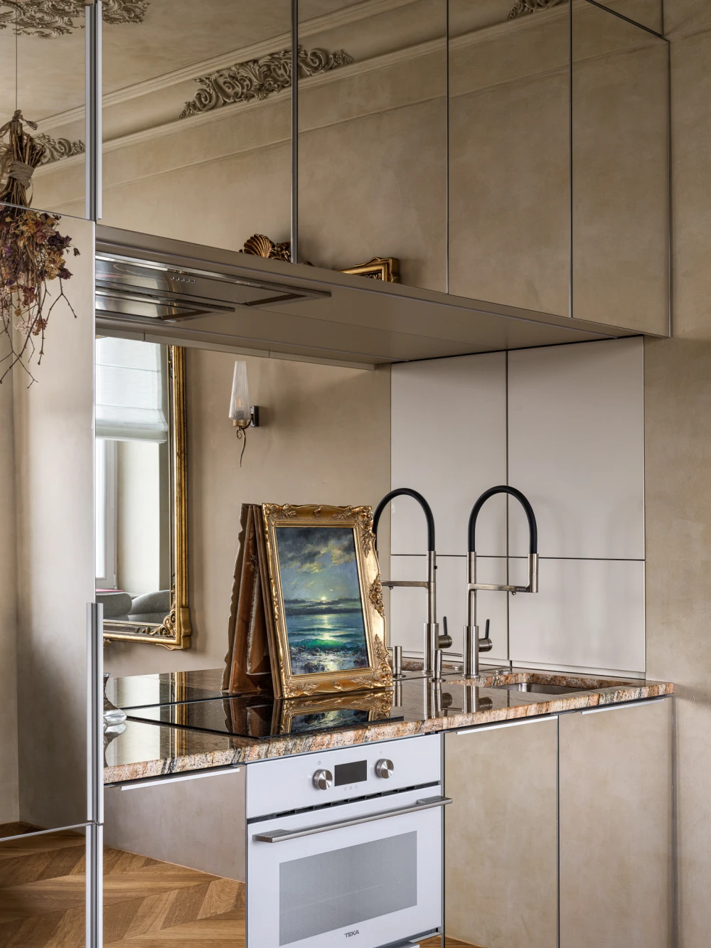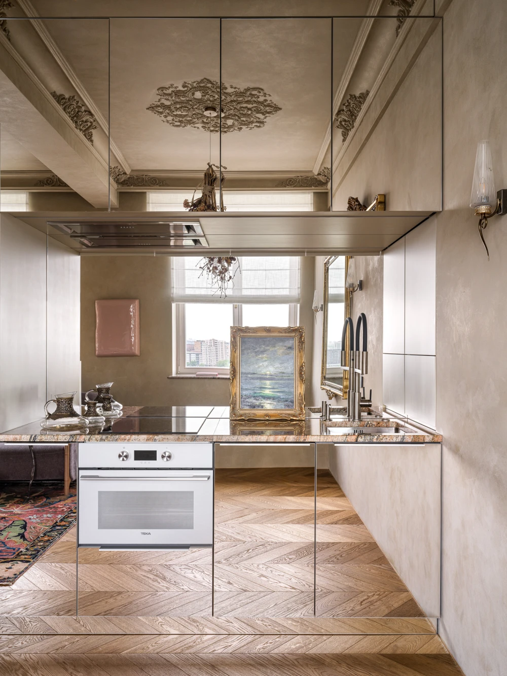 «Одно из самых дерзких решений, которое удалось реализовать, — кухня, созданная полностью из зеркал. Мне хотелось, чтобы в кухне-гостиной не осталось места для бытовых предметов, а утилитарные функции растворились в пространстве. Так кухня исчезла — вместо нее открылся шикарный вид на набережную Москвы-реки. Хотя в моем портфолио много минималистичных проектов, для себя я создала нечто иное: тонкая эстетика старины, любовь к антиквариату и уважение к истории сочетаются в этом интерьере с технологичными решениями».