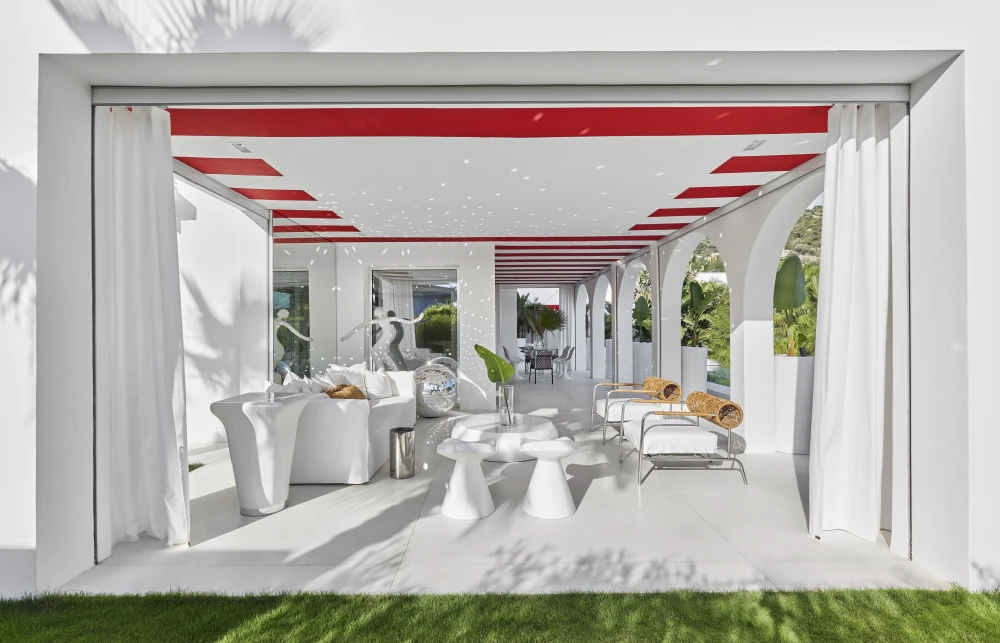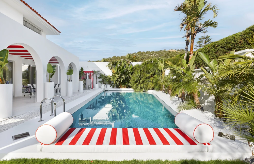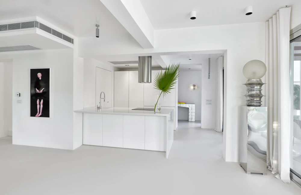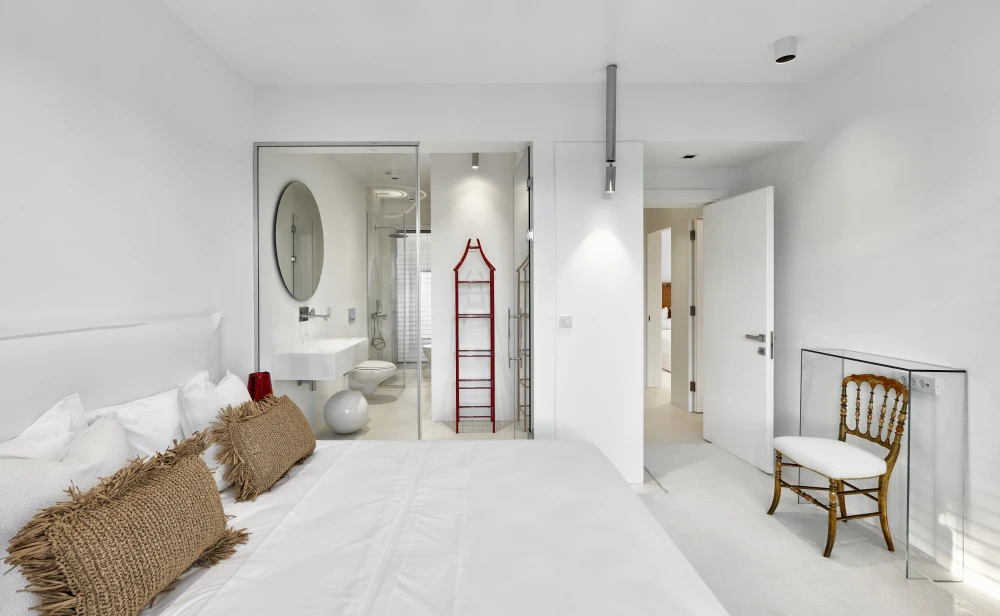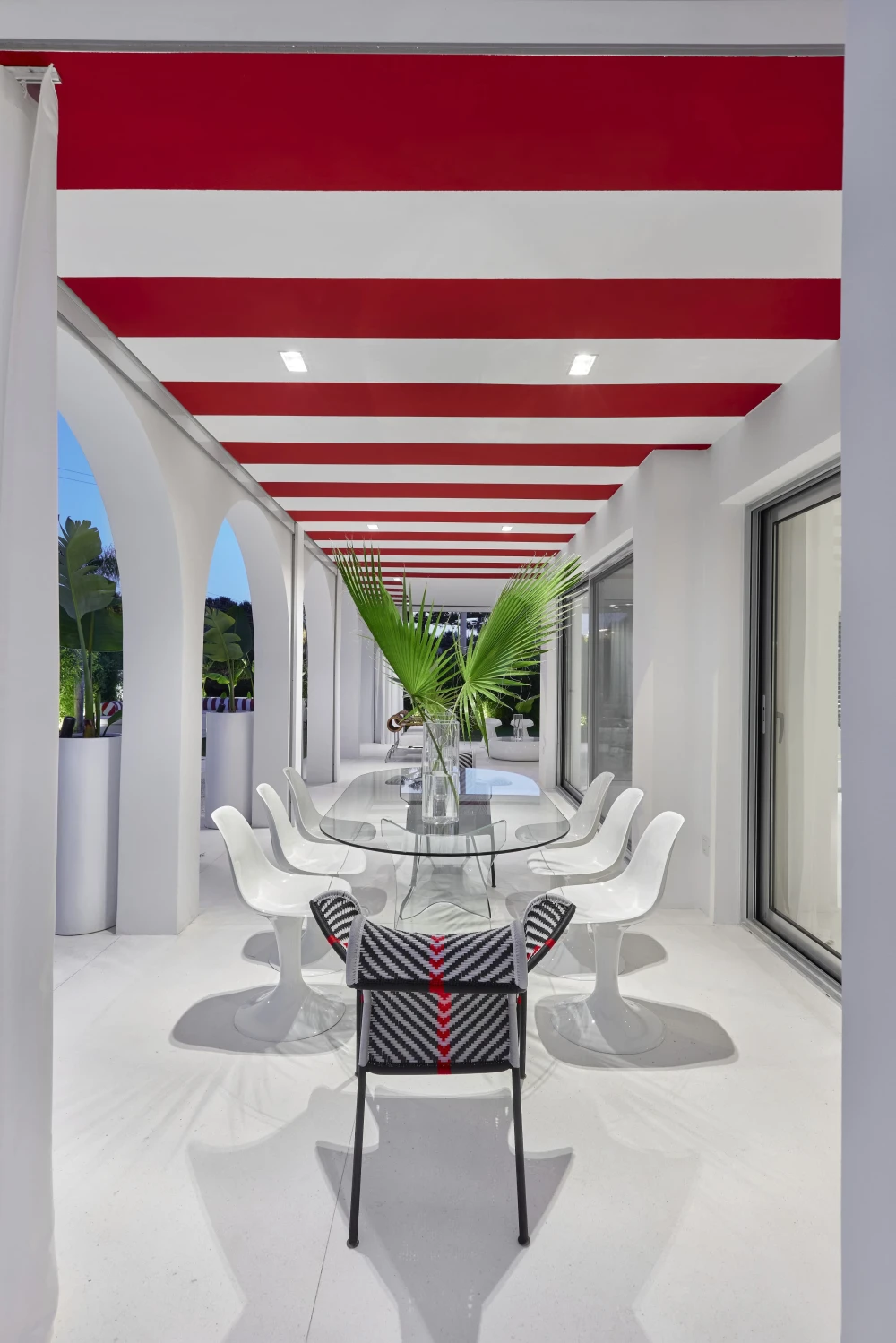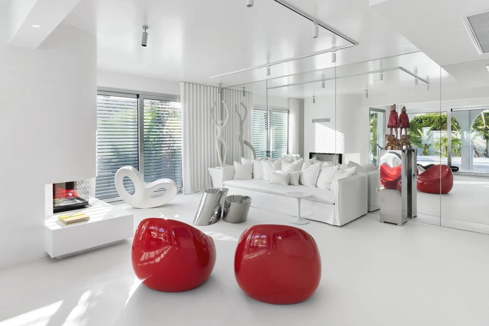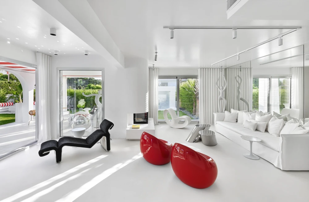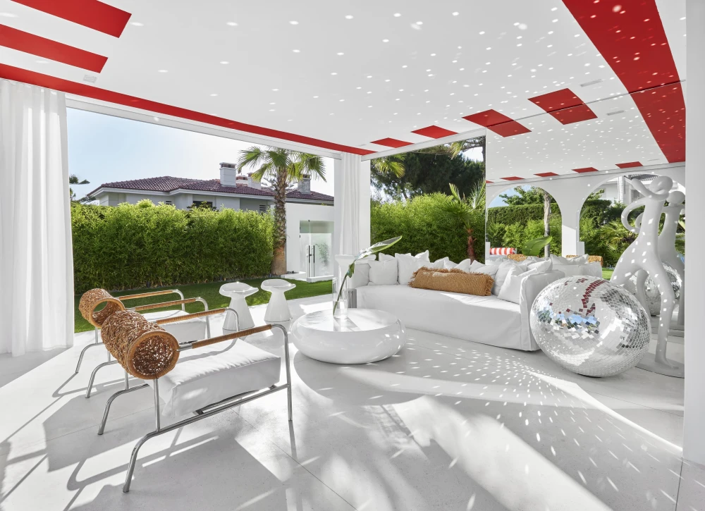 Основой интерьера стала белая штукатурка, усиливающая ощущение простора. Белый цвет работает здесь как архитектурный элемент — он поглощает и отражает интенсивный средиземноморский свет. Энергию в пространство привносят красные акценты: полосатые текстильные элементы, лакированные стулья и скульптурные детали.