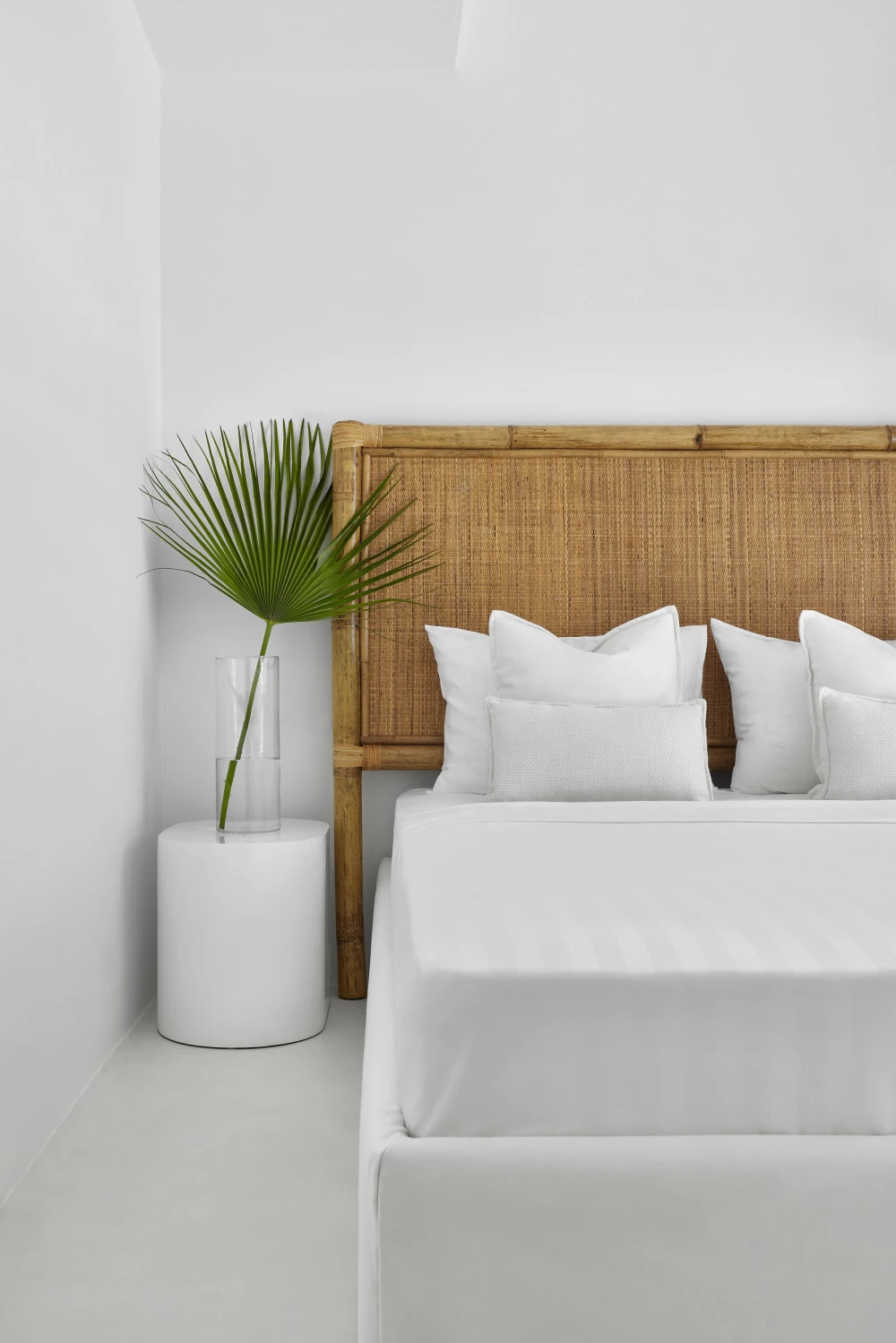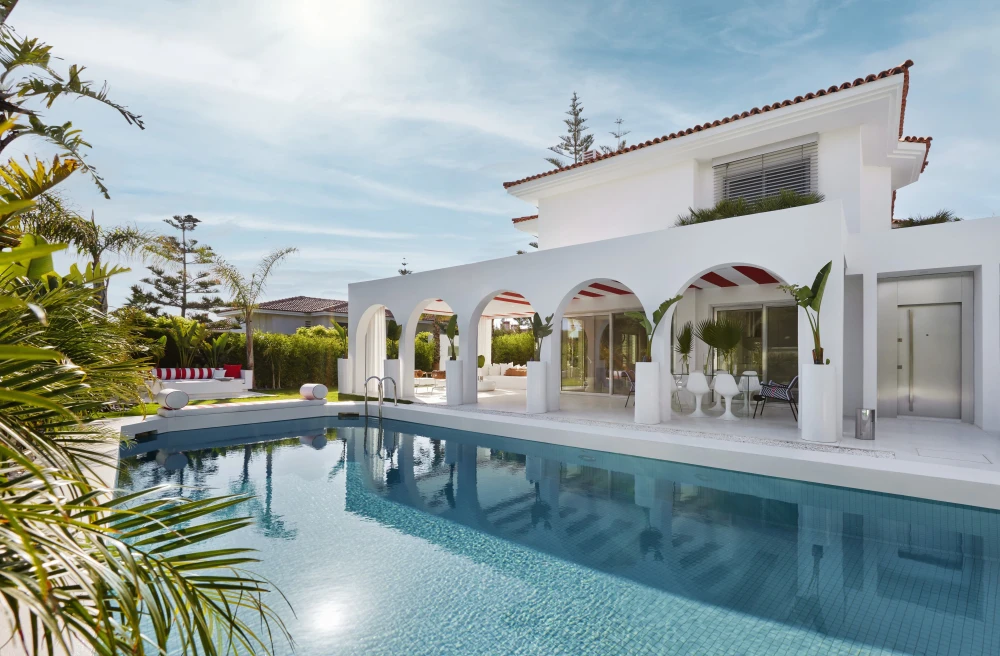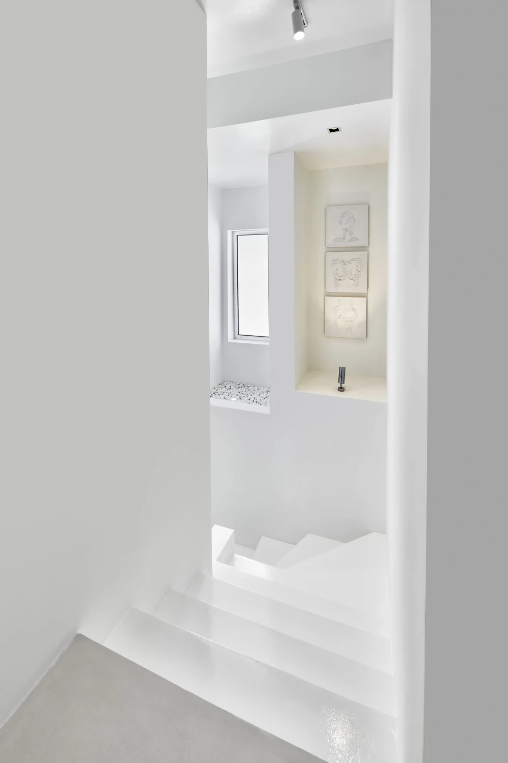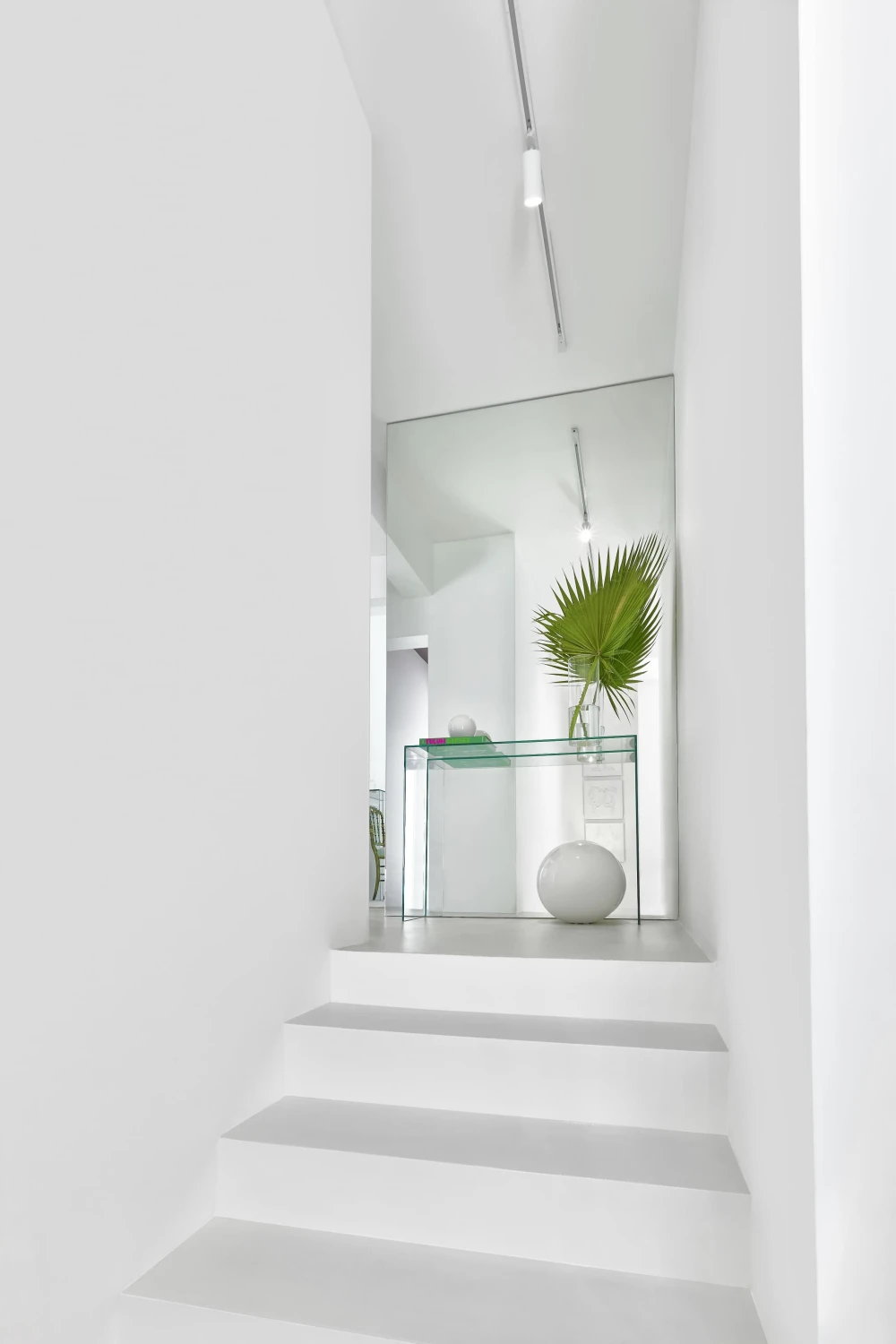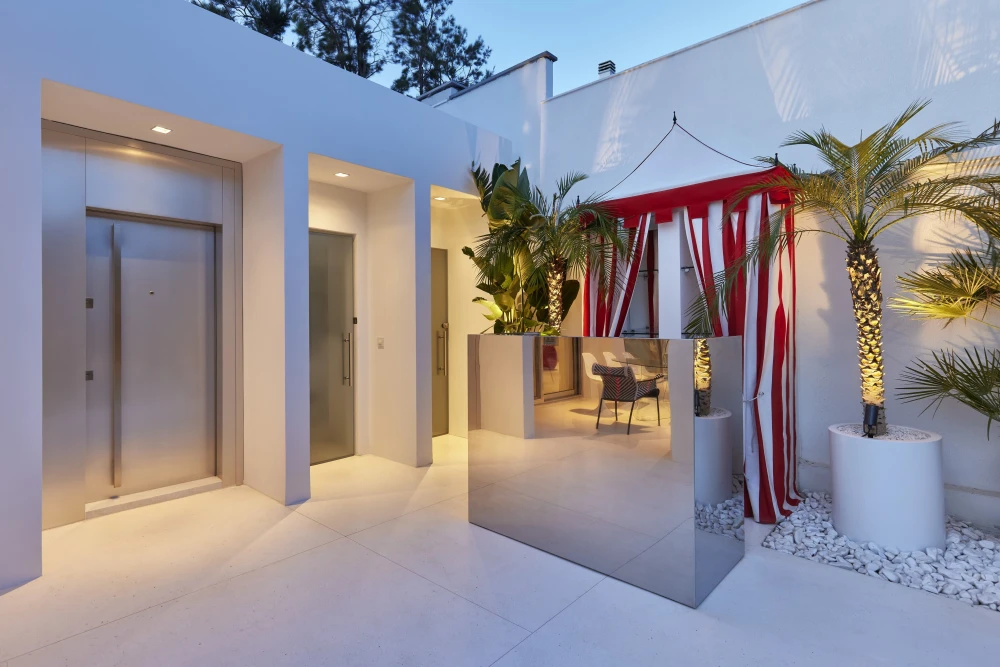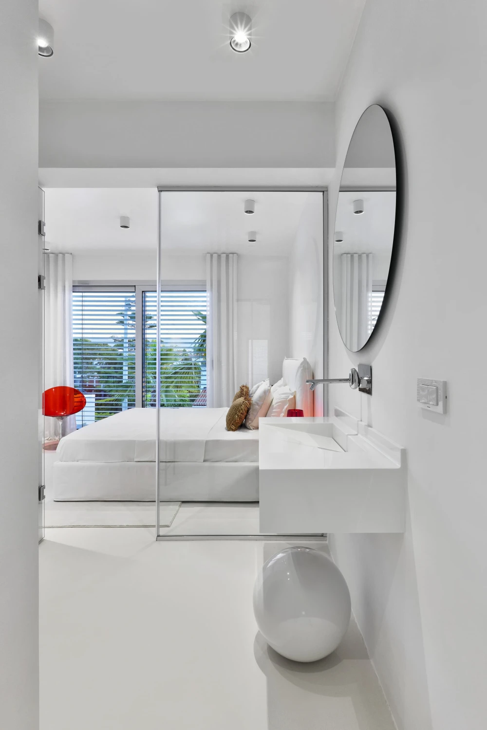 Основой интерьера стала белая штукатурка, усиливающая ощущение простора. Белый цвет работает здесь как архитектурный элемент — он поглощает и отражает интенсивный средиземноморский свет. Энергию в пространство привносят красные акценты: полосатые текстильные элементы, лакированные стулья и скульптурные детали.