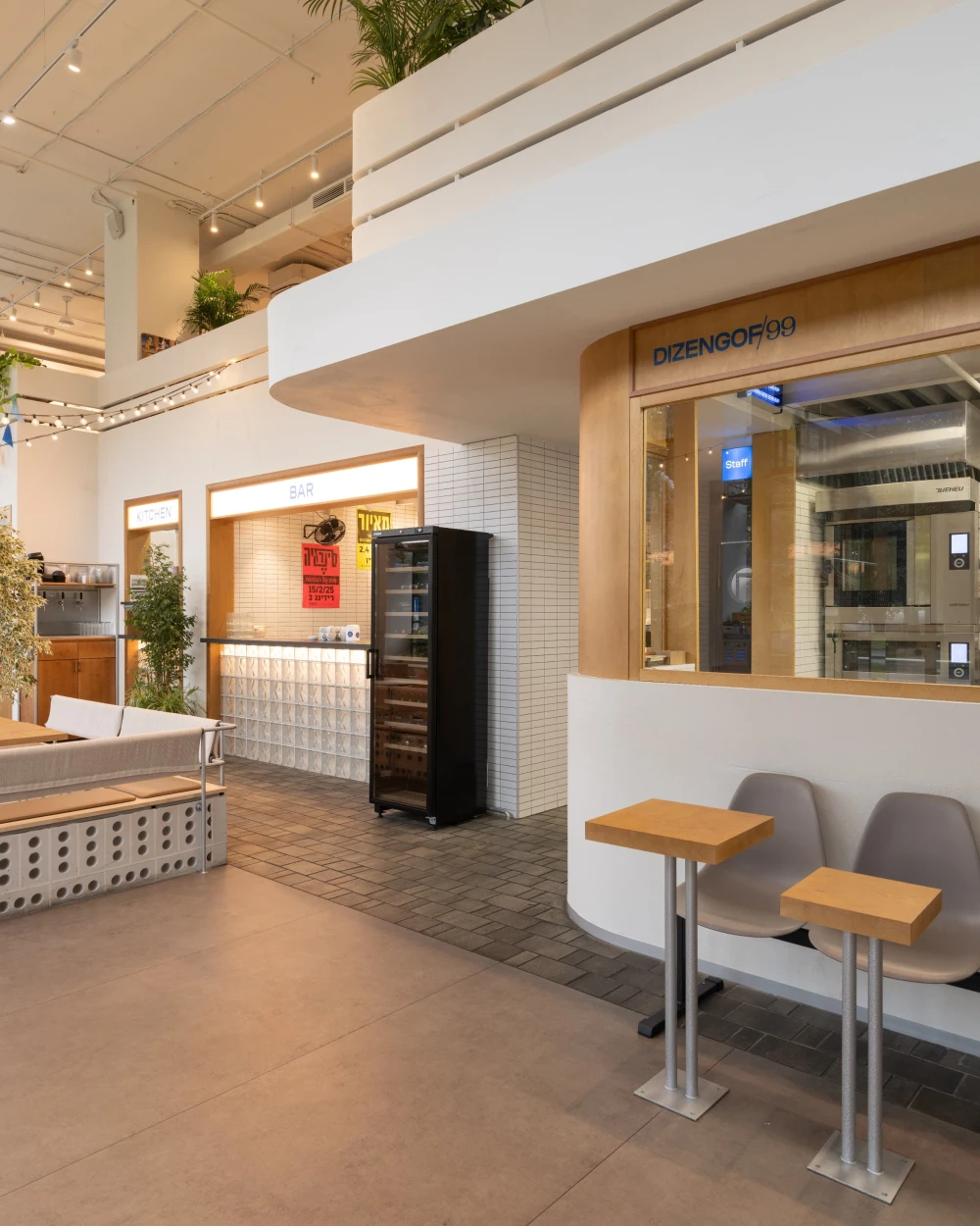 «Изучая город и саму улицу Дизенгоф, мы обратили внимание на характерное для Тель-Авива стирание границ между интерьером и улицей, а также на архитектуру конкретного района «Белый город», который полностью построен в стиле Баухаус: белые фасады со стеклоблоками, округлыми углами и террасами, — рассказывают авторы проекта. — Так родилась идея создать в Москве пространство, где посетитель, попадая внутрь, оказывается на «улице» Тель-Авива».