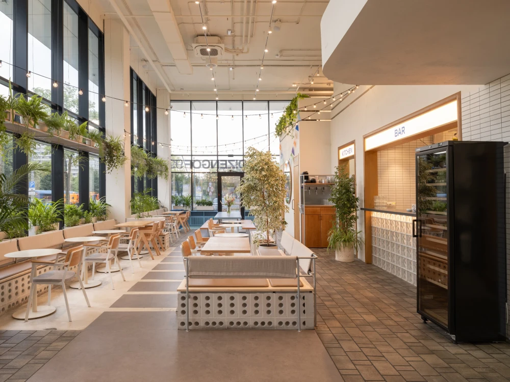 «Особенность этого ресторана — его объемность и многослойность. Второй этаж с интегрированным фасадом создает эффект городского квартала, где пространство воспринимается как сцена с множеством ракурсов. Интерьер задумывался как живая среда, обрастающая деталями со временем: плакаты, винтажные лампы, керамика появились уже в процессе эксплуатации. Неслучайно фотосессию провели сознательно после открытия, когда ресторан наполнился подлинной атмосферой улицы».
