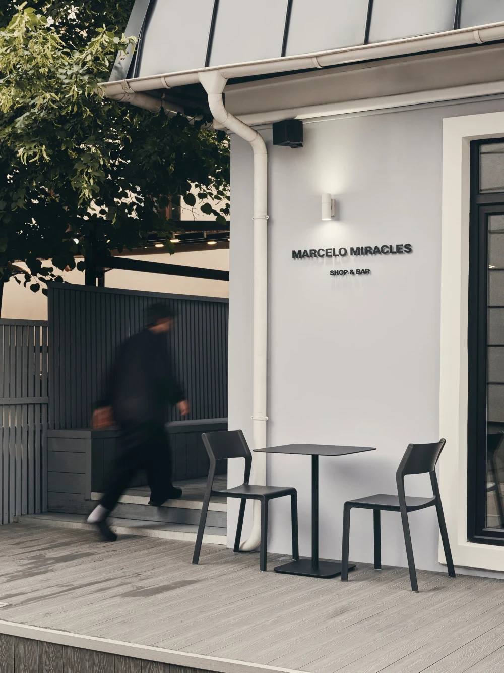 «Для зоны магазина мы выбрали яркий белый свет — он выгодно подчеркивает фактуры материалов и товаров. Бар же погружен в теплую красную гамму. Этот цвет — сознательная отсылка к парижским угловым барам, где именно такое освещение создает интимную атмосферу. Для нас это была принципиальная деталь: ведь у Marcelo Miracles уже есть магазин в Париже, и красный свет в московском проекте — не просто эффект, а осознанное продолжение визуального кода бренда, рожденного в атмосфере парижских баров».