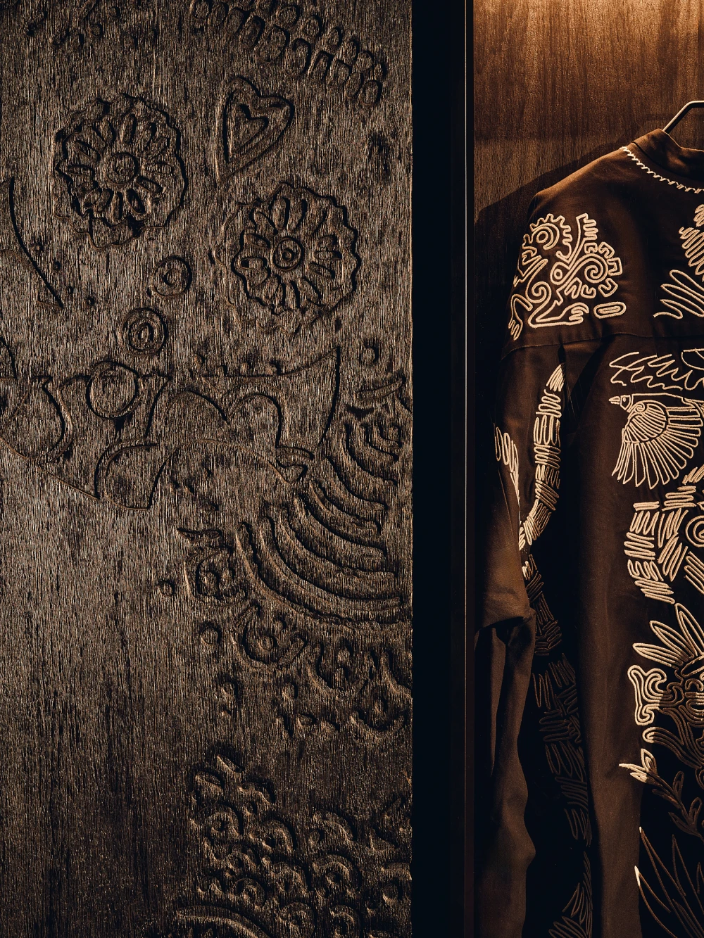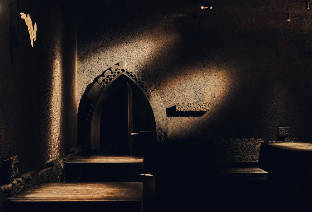 «В основном зале, погруженном в полумрак, мы развернули барную стойку и организовали посадку по периметру, но сохранили главный символ — бетонный коммунальный стол прежней формы. Через следующую арку гости попадают во второй зал с открытой кухней, резным шкафом со встроенной мини-теплицей для коктейльных цветов и уменьшенной версией бетонного стола. Мистическую атмосферу поддерживают отсылки к мексиканской культуре. Портрет Фриды Кало теперь проявляется на стене тонким контуром, подобно лику Девы Хукилы из легенды. Ацтекские орнаменты и символы украшают бетонные стены и спинки лавок, а в уборных появились гравировки, рассказывающие об искусстве создания текилы».