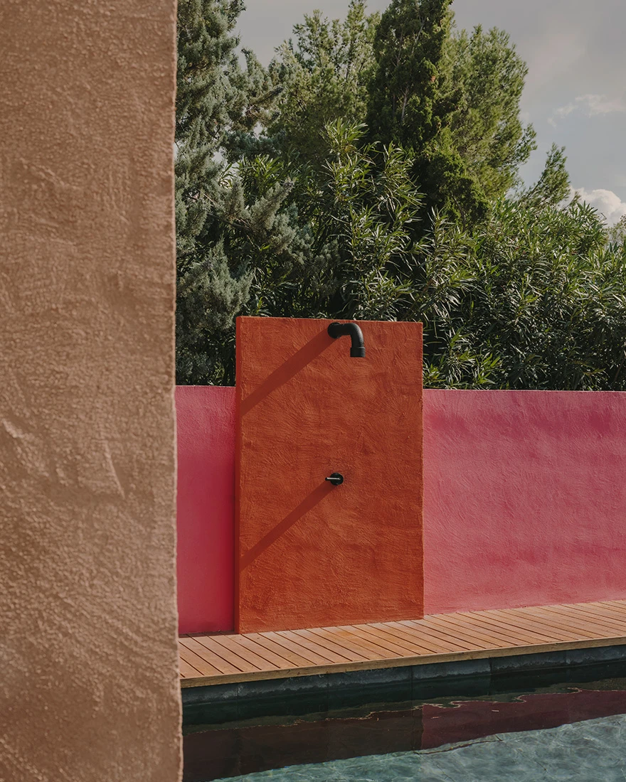Внешний вид виллы тоже был тщательно продуман. Весь натуральный камень на фасадах заменили текстурированной цветной штукатуркой, что создало ощущение целостности. Вместо обычных окон поставили панорамные, чтобы растворить границу между домом и садом. Со стороны бассейна дизайнеры добавили ярко-розовую стену, которая скрывает техническое оборудование. Цвет был выбран неспроста. Хозяин дома — большой фанат мексиканского архитектора Луиса Баррагана, и эта стена отсылает к поместью La Cuadra San Cristóbal, которое он спроектировал в конце 1960-х.