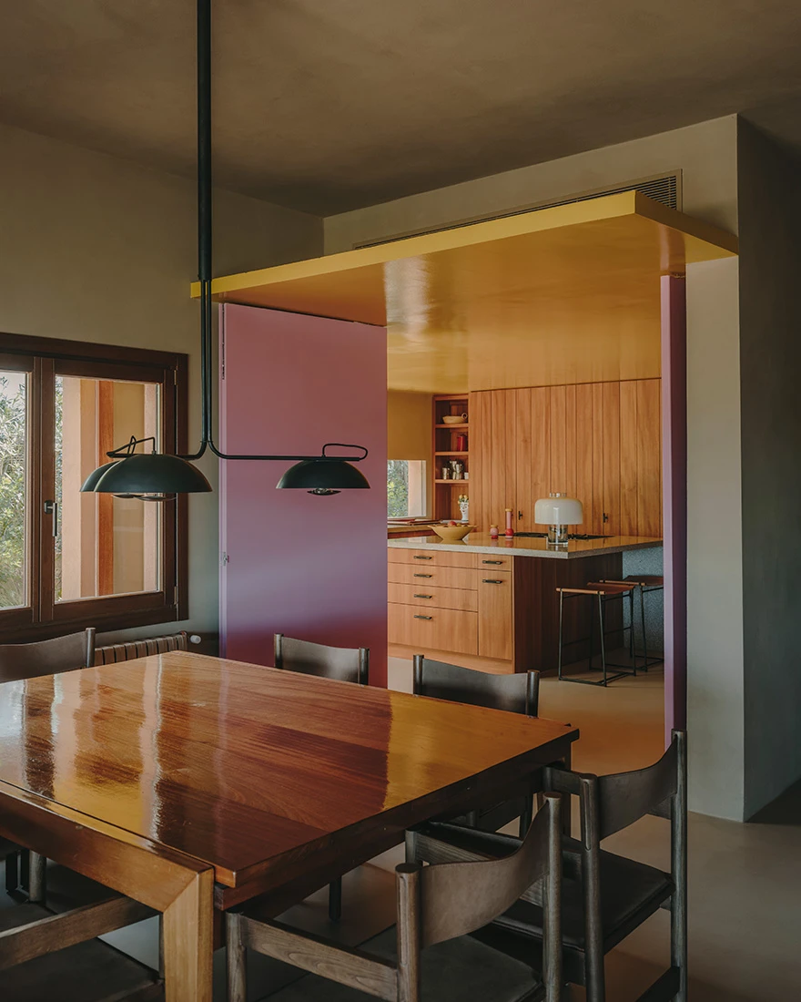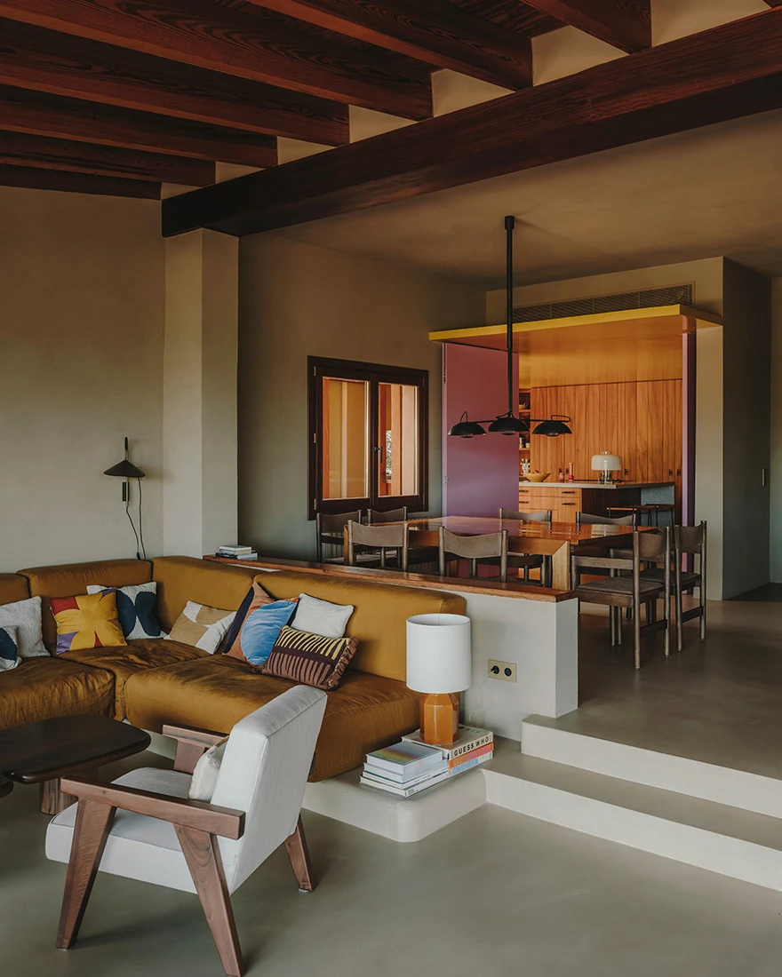 Команда сохранила характерные балки из сосны на наклонном потолке гостиной. Деревянные панели в спальнях, характерные для 1970-80-х, тоже остались на своем месте и дополнили новые детали из тика. Стены и потолки оформили светлой штукатуркой, а пол покрыли микроцементом. Кухню переделали полностью, теперь она радует хозяев жизнерадостными желтыми и сиреневыми тонами. Яркие краски также привносит плитка ручной работы в ванных комнатах и раковины из терраццо. Сейчас в доме есть четыре спальни и столько же санузлов, общая площадь составила 250 кв. метров, половину из которых занимает терраса.
