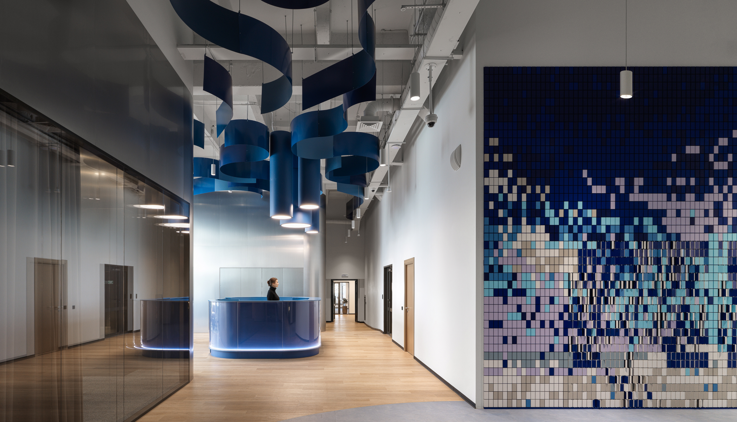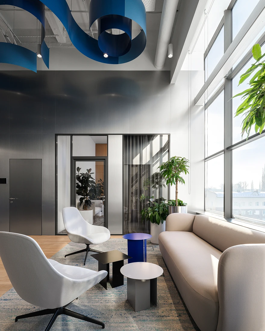 Концепция вдохновлена уникальными особенностями Башкортостана: его природными ландшафтами, традиционными нарядами, обычаями, которые переплелись с узнаваемой голубой палитрой и графическими элементами из брендбука компании. За основу взят образ реки, которая протекает через все пространство и органично связывает его основные зоны. Фирменный голубой дополнен зеленью, теплым деревом и металлическими поверхностями, отсылающим к области деятельности компании.