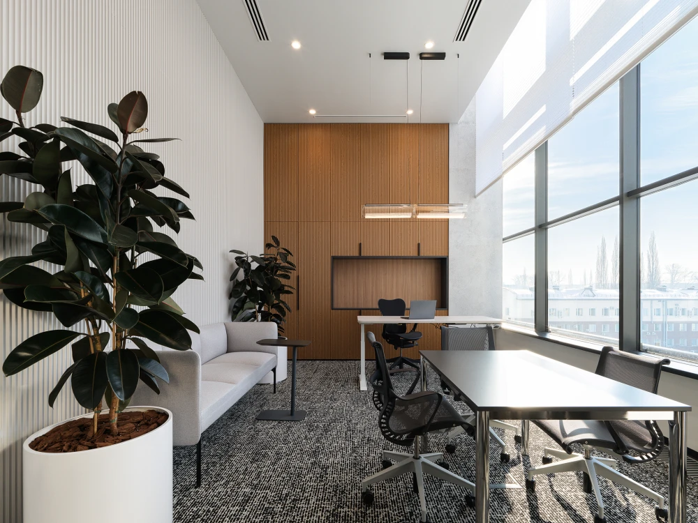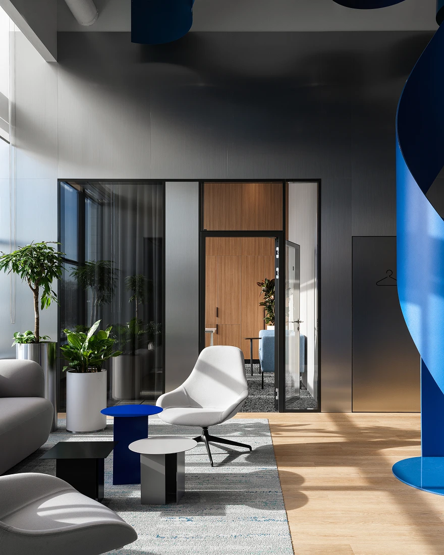 В проекте присутствует большое количество разнообразных переговорных зон: телефонные будки на 1-2 человека, малые переговорные на 3-4 человека, большие переговорные на 15 человек. Такая планировка обусловлена разнообразием форматов взаимодействия и легко адаптируется под разное количество человек. Большая часть пространства является открытым, однако выделено четыре кабинета для руководителей компании. Для представительских задач в зоне кабинета генерального директора была оборудована обособленная зона со смарт-стеклом: с VIP-переговорной, собственным ресепшеном и зоной ожидания.
