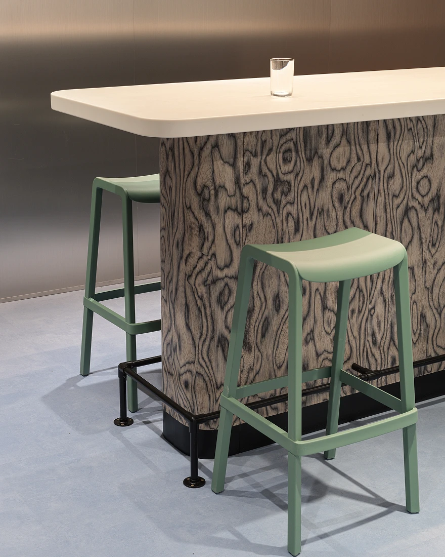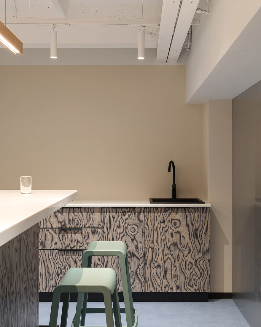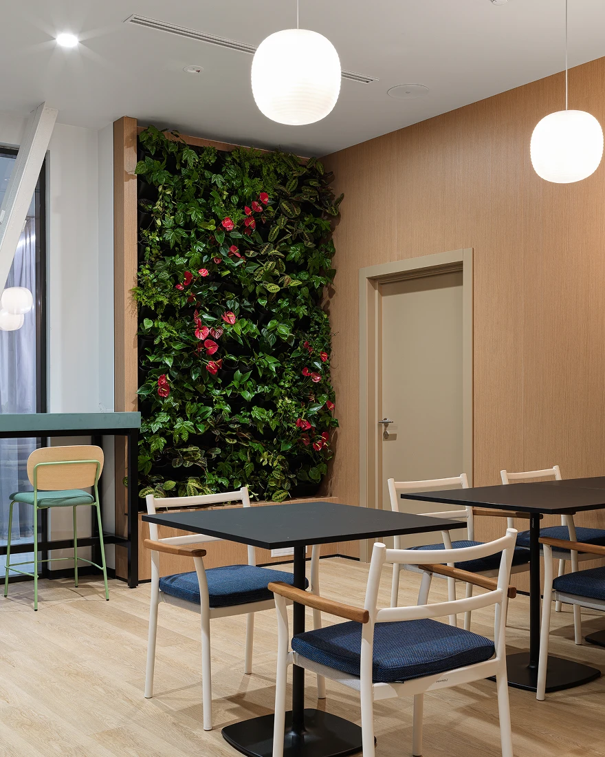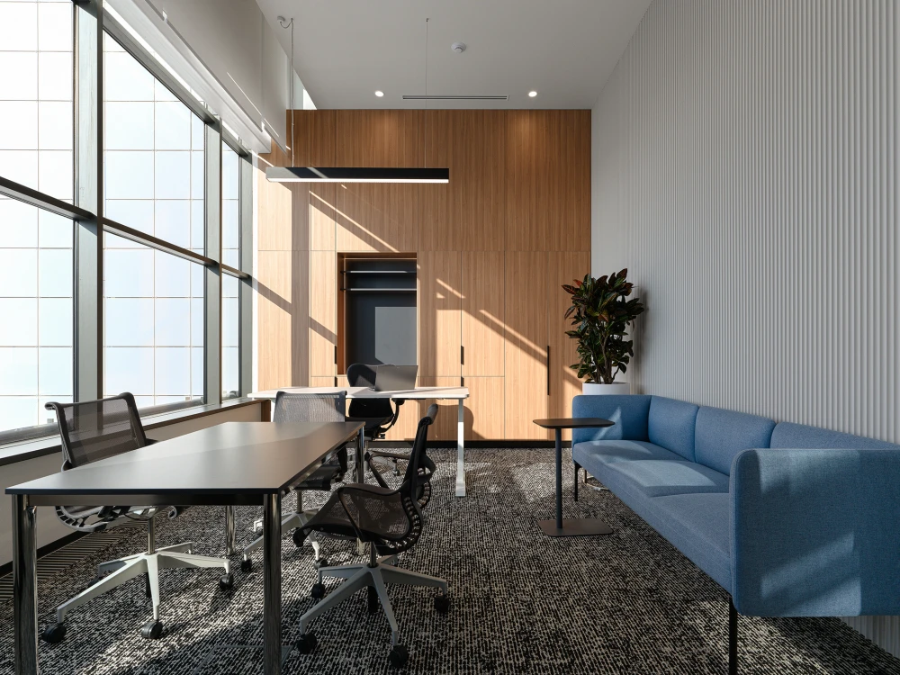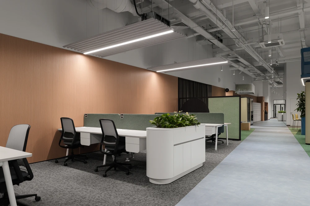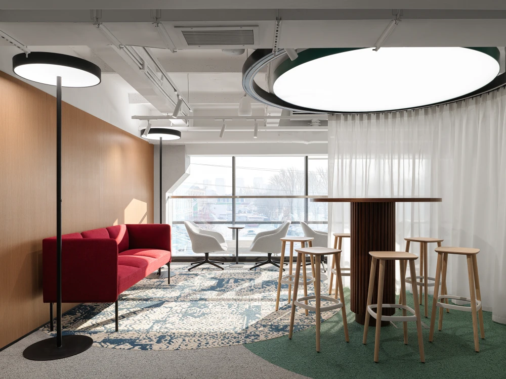 В новом офисе общей площадью 3639 кв. метров на постоянной основе размещается девять отделов, большая часть из которых ответственна за финансовую и кадровую политику. Поэтому даже в открытых пространствах учтены решения, способствующие конфиденциальности и акустическому комфорту. Кроме того, в компании реализуется гибридный режим работы, и в офис регулярно прибывают командировочные руководители и сотрудники, поэтому в проекте предусмотрены гостевой кабинет и незакрепленные рабочие места.