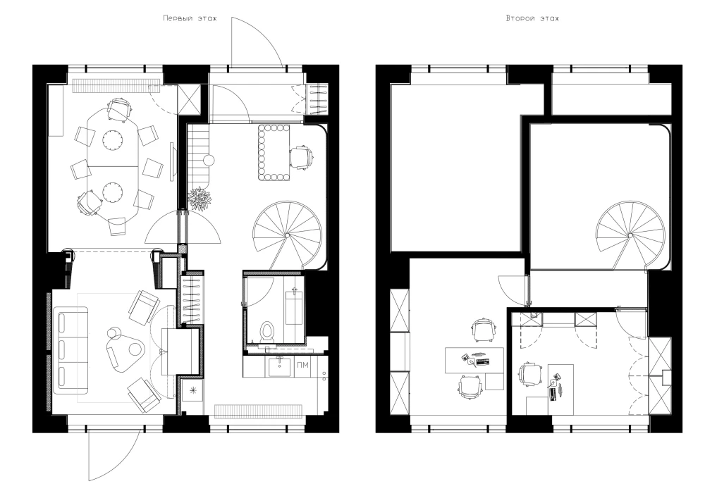 На первом уровне разместили зону ресепшен с эффектной винтовой лестницей, компактную кухню и санузел. Мощные черные трубы и шлифованный металл стойки ресепшен подчеркивают индустриальную тему деятельности компании.