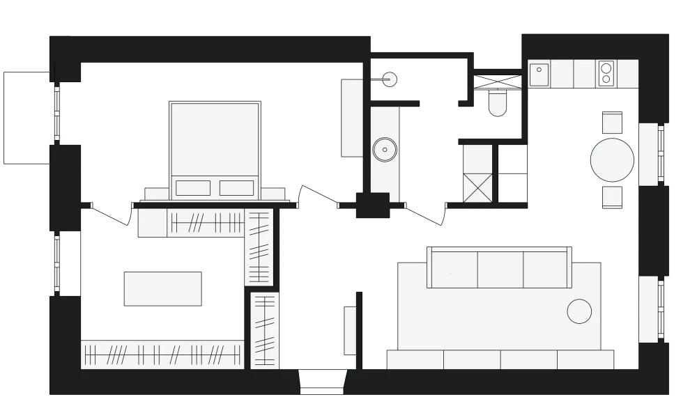 Типовую сталинскую планировку полностью перекроили. Чтобы сделать основную зону максимально просторной, команда объединила гостиную и кухню, ради чего пришлось перекрыть газ, и убрала перегородку, отделявшую прихожую. Стену между входной зоной и гардеробной сделали зигзагообразной, чтобы сформировать ниши для шкафов. Санузел увеличили за счет коридора, чтобы выделить место для хозблока.