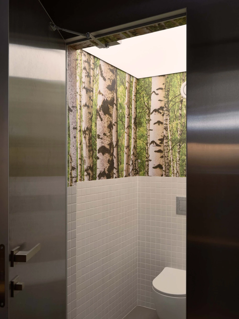 «Невероятная находка ожидала нас, когда мы добрались до проектирования санузла, — добавляют дизайнеры. — Была найдена совершенно новая плитка для тамбур-шлюза, которая дожидалась своего часа в подвале на протяжении 30 лет! А на стенах кабинок санузла мы наклеили фотообои с березовой рощей».