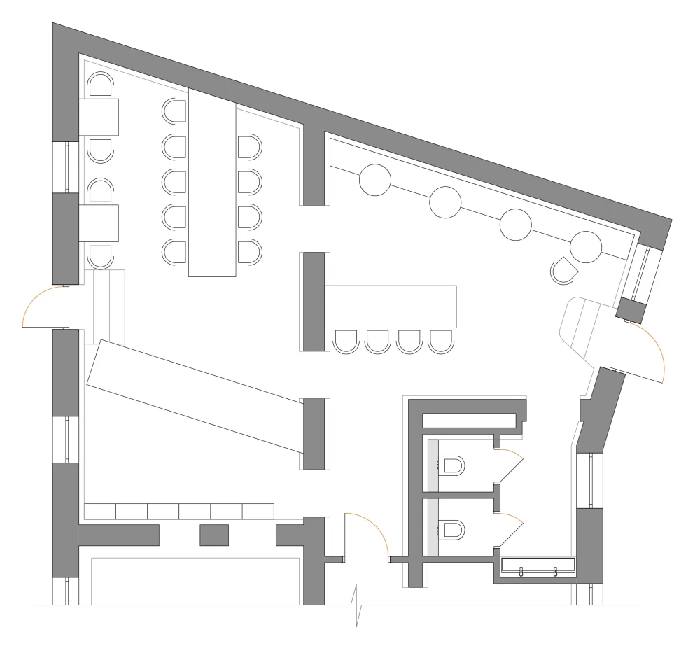 «Бар расположился в старом довоенном немецком доме Калининграда, помещения которого пережили многое. Обнажив эту структуру, мы лишь добавили одну линию нового объема, за которым спрятали подсветку по периметру, тем самым полностью избавив интерьер от верхнего света. Так как потолок в подвальном помещении довольно невысокий, мы решили затянуть его зеркальным полотном».