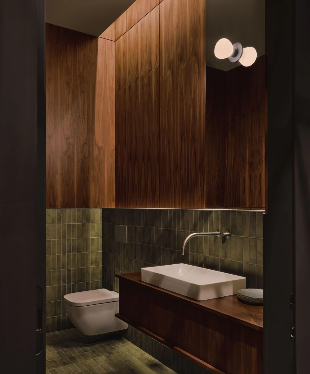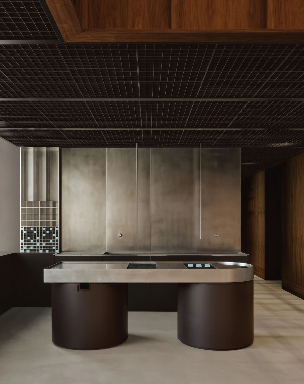 С противоположной стороны от кафе расположился косметический бутик, где можно выбрать и протестировать уходовые средства. Он выполнен в похожем стиле, но отличается цветовой гаммой: вместо зеленых оттенков использован глубокий шоколадно-коричневый. Эти три помещения вместе образуют единую общественную зону, обеспечивая плавный переход к процедурным кабинетам.