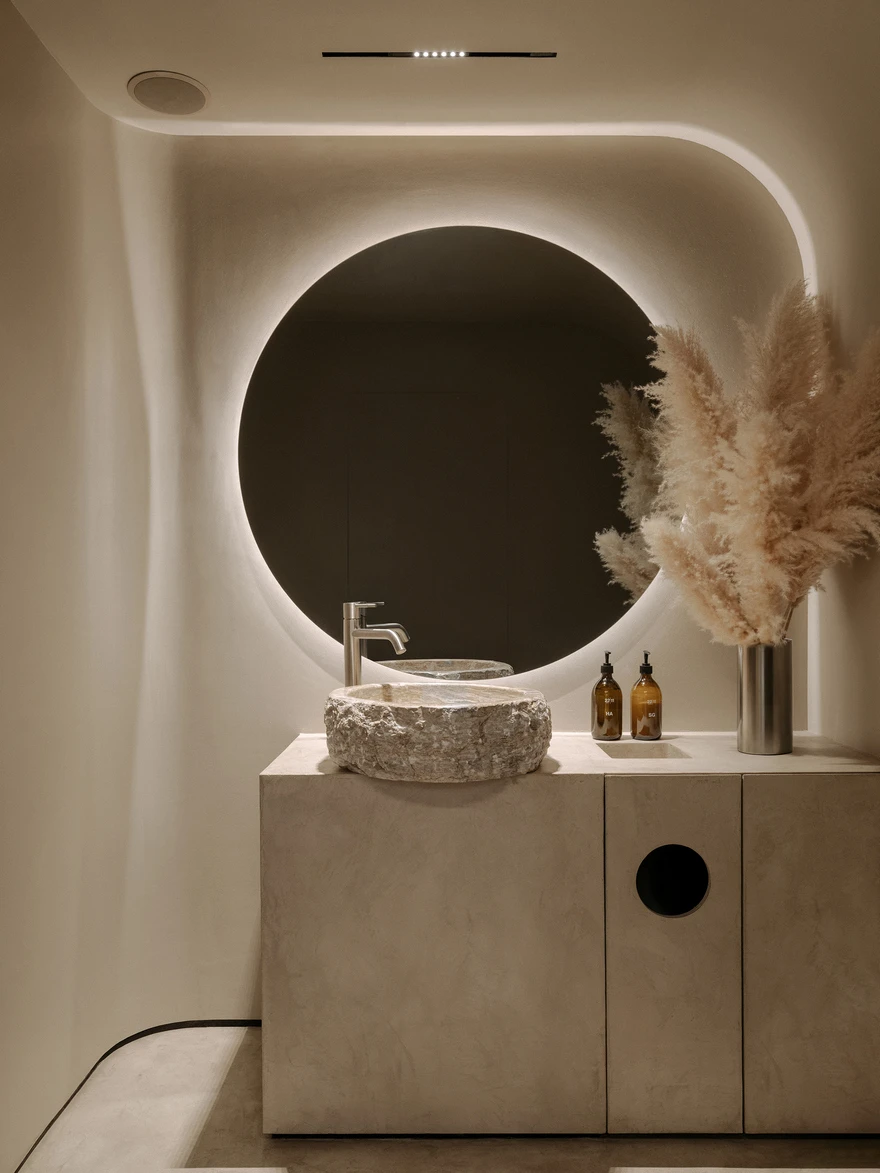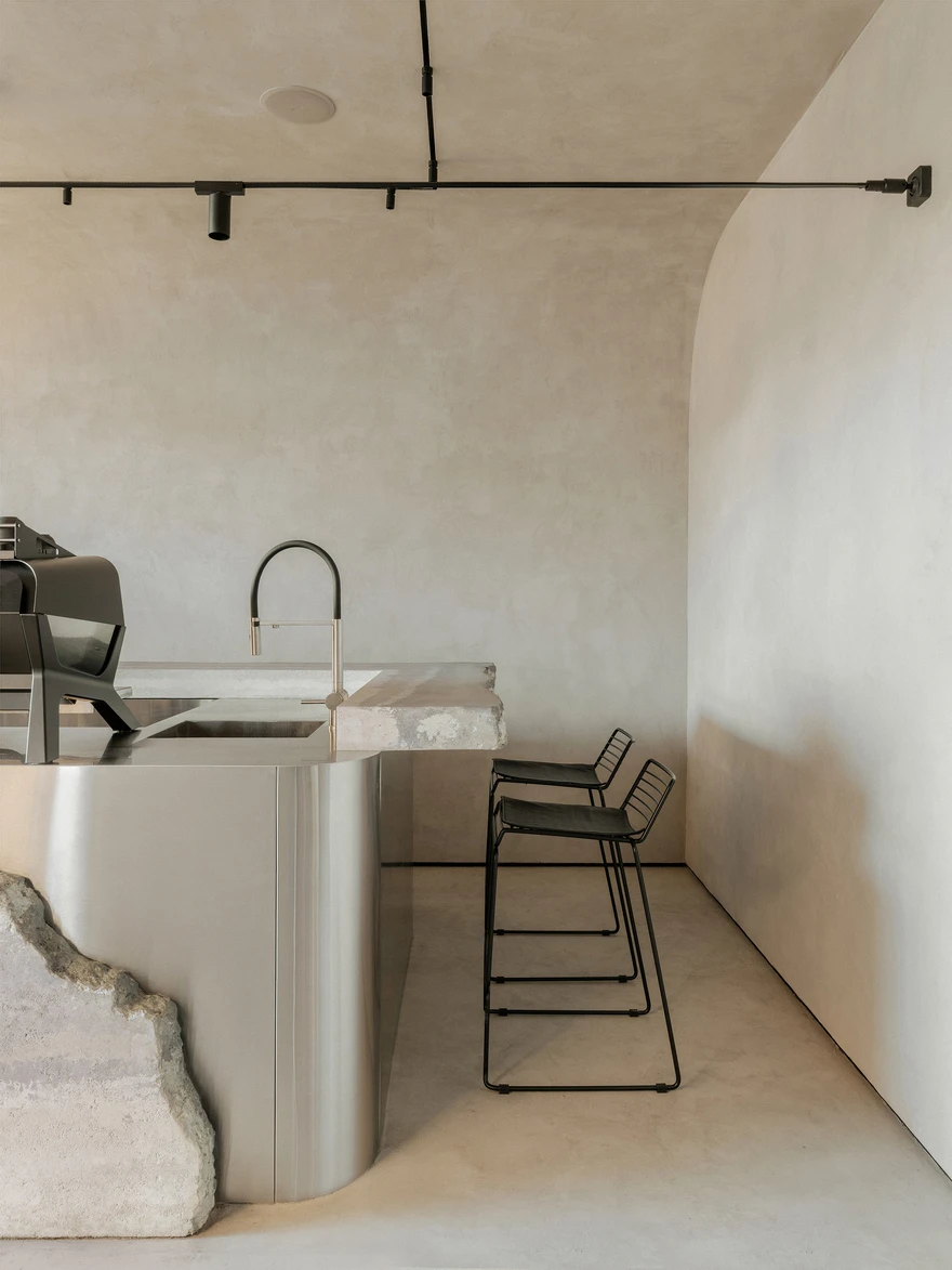 Интерьер кофейни отсылает к архитектуре скейт-парков, поэтому основным материалом стал микроцемент, напоминающий бетон рамп. «Его дополняют фрагменты состаренного дерева, нержавеющая сталь и фактура разрушенного бетона под травертин, — отмечает дизайнер. — Все элементы вместе создают образ городской среды, но при этом пространство остается теплым и дружелюбным». В проекте использовались свет Aledo и Centrsvet; изготовление авторской мебели из МДФ, нержавеющей стали и бетона — Monsoon concrete; отделка микроцементом MicroDec.