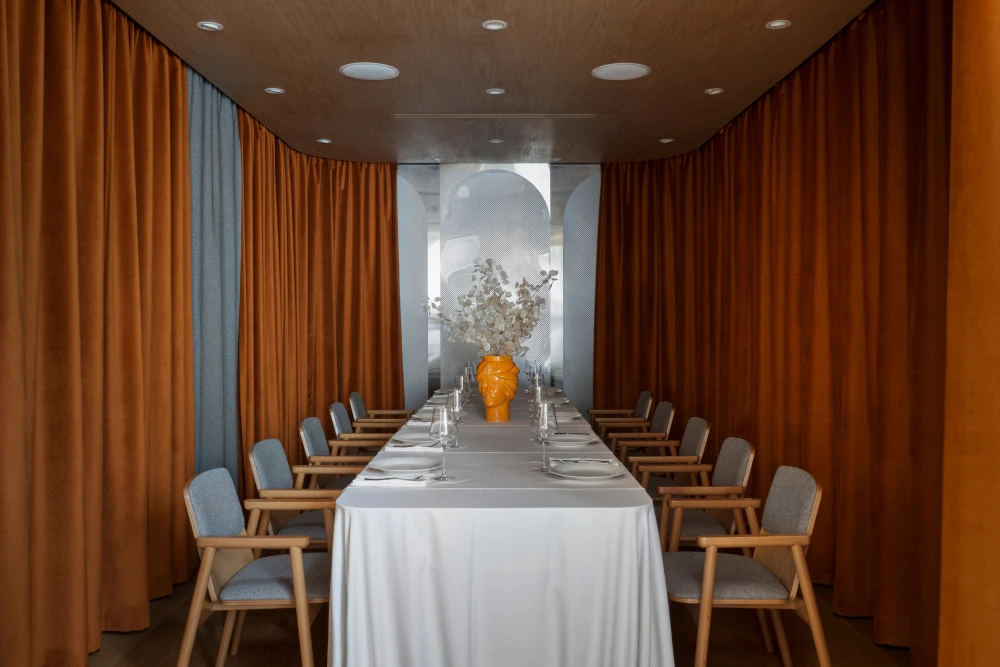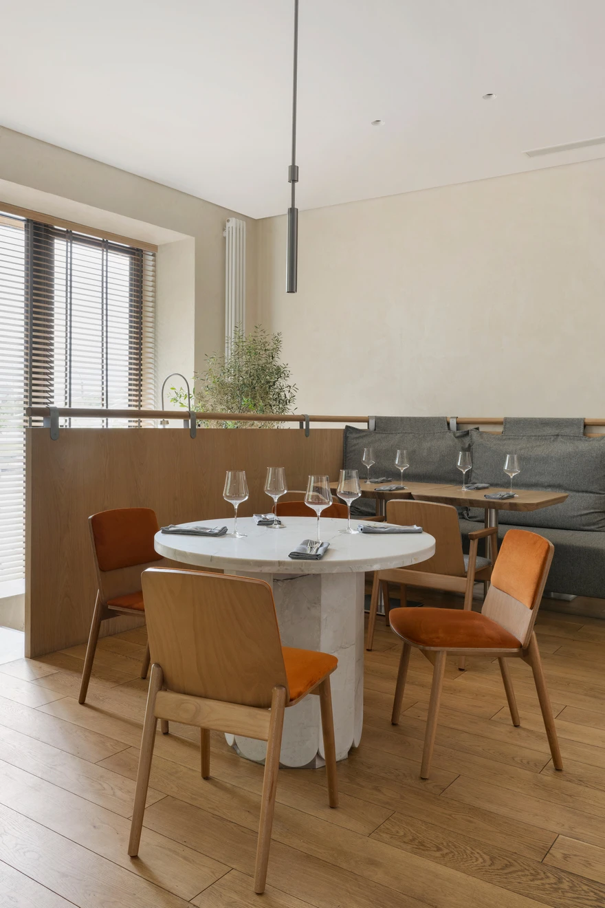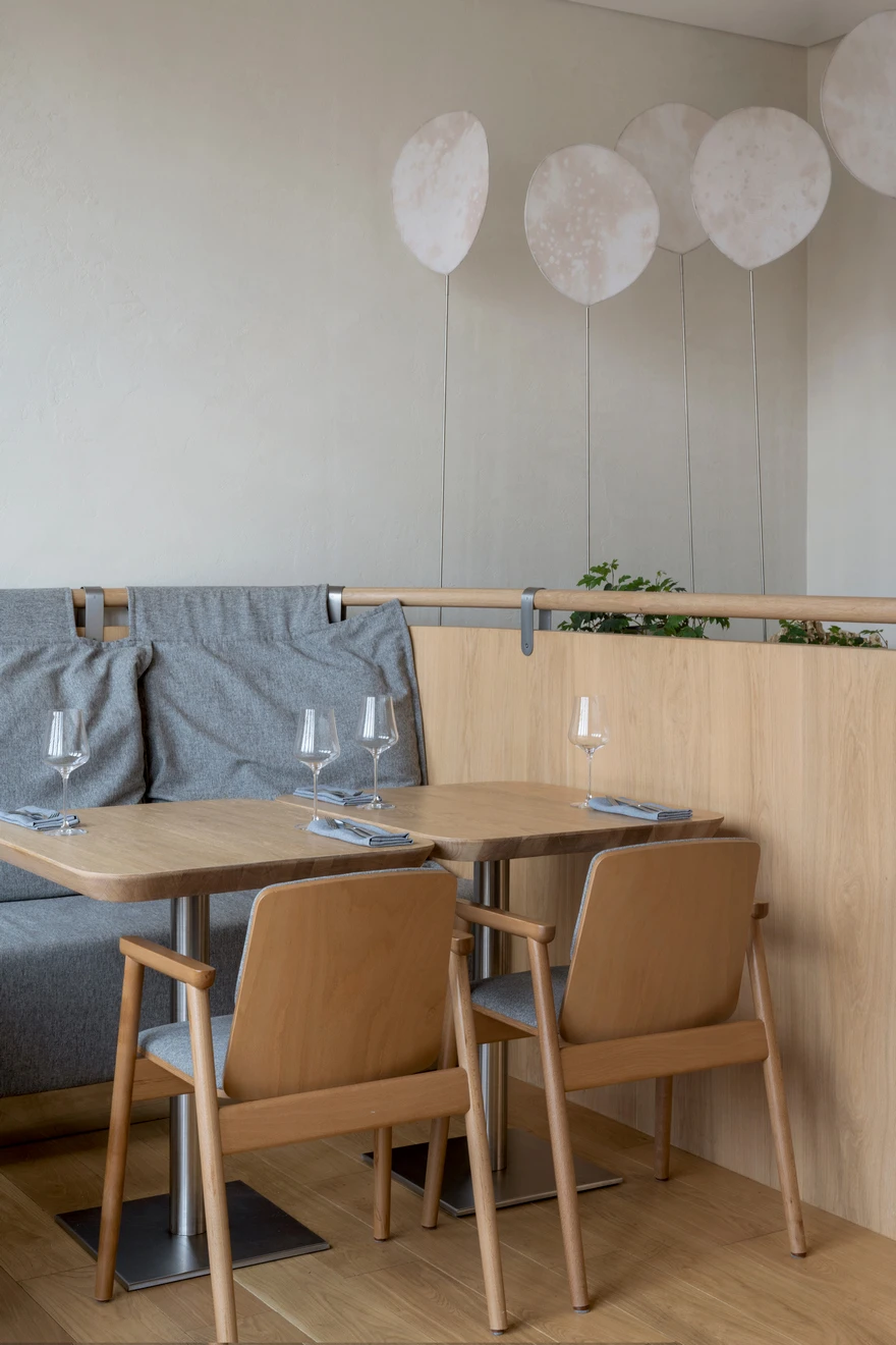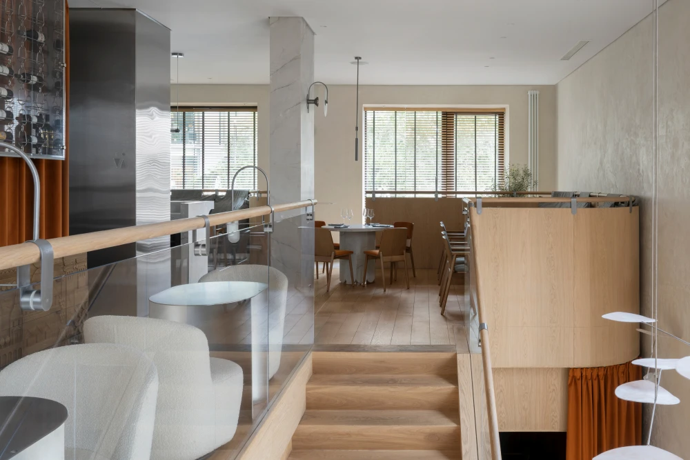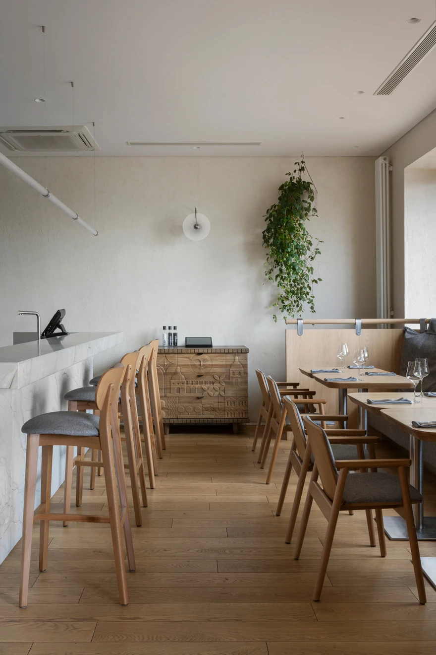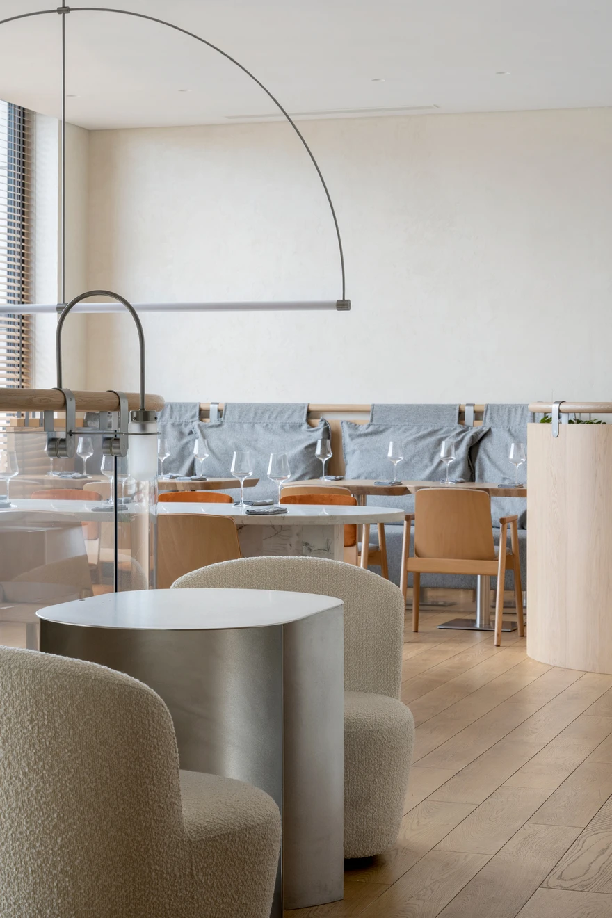 Ресторан расположен в Санкт-Петербурге на набережной Адмирала Лазарева в премиальном жилом комплексе One Trinity Place и занимает два уровня общей площадью 242,88 кв. метра. Пространство с семиметровыми потолками и окнами в два уровня для авторов проекта стало редкой возможностью и одновременно профессиональным вызовом. «Помещение имело два входа: парадный со стороны набережной и дополнительный — со стилобата, где проходят прогулочные маршруты. Вертикальный объем словно сам подсказывал решение: второй уровень логично разместить на высоте стилобата. По пожеланию заказчика кухня осталась на первом этаже — ради удобства логистики, а основной зал поднялся выше».