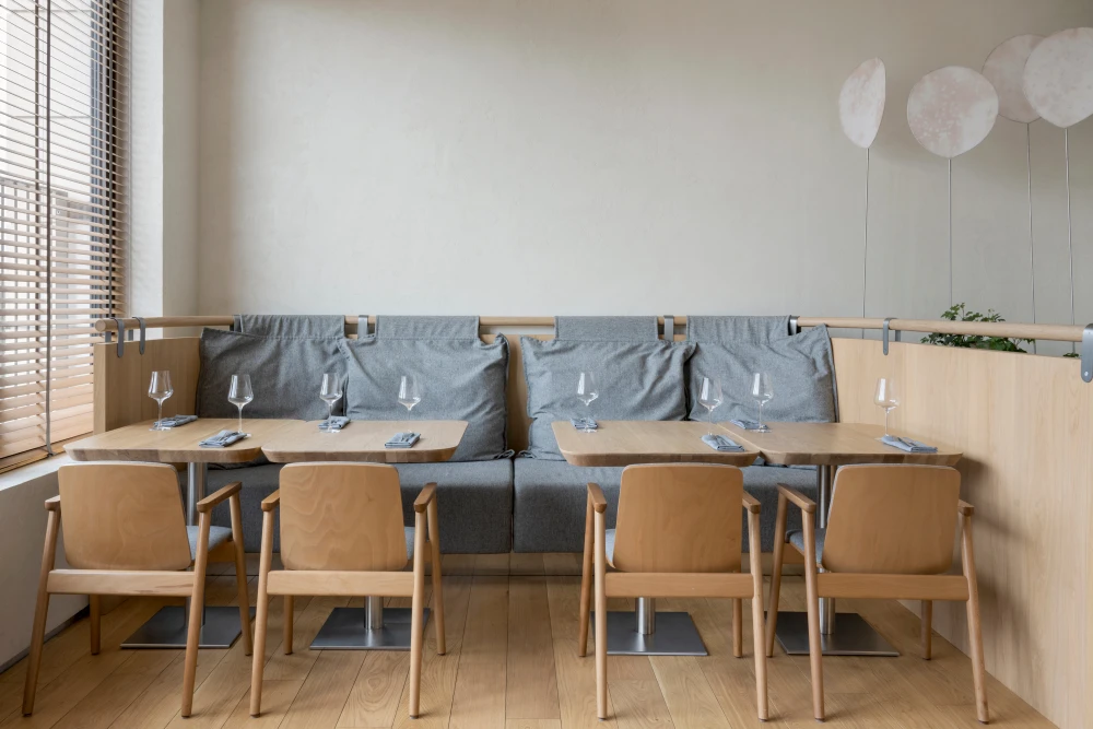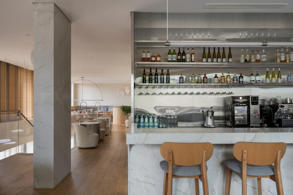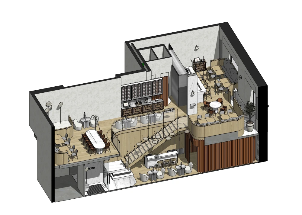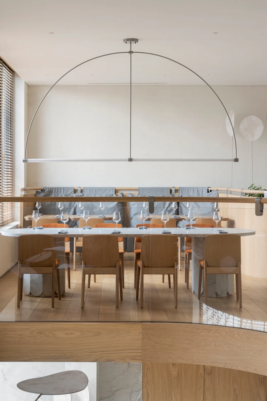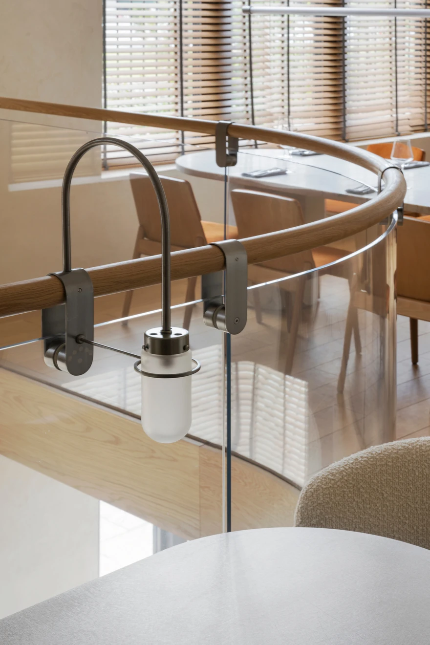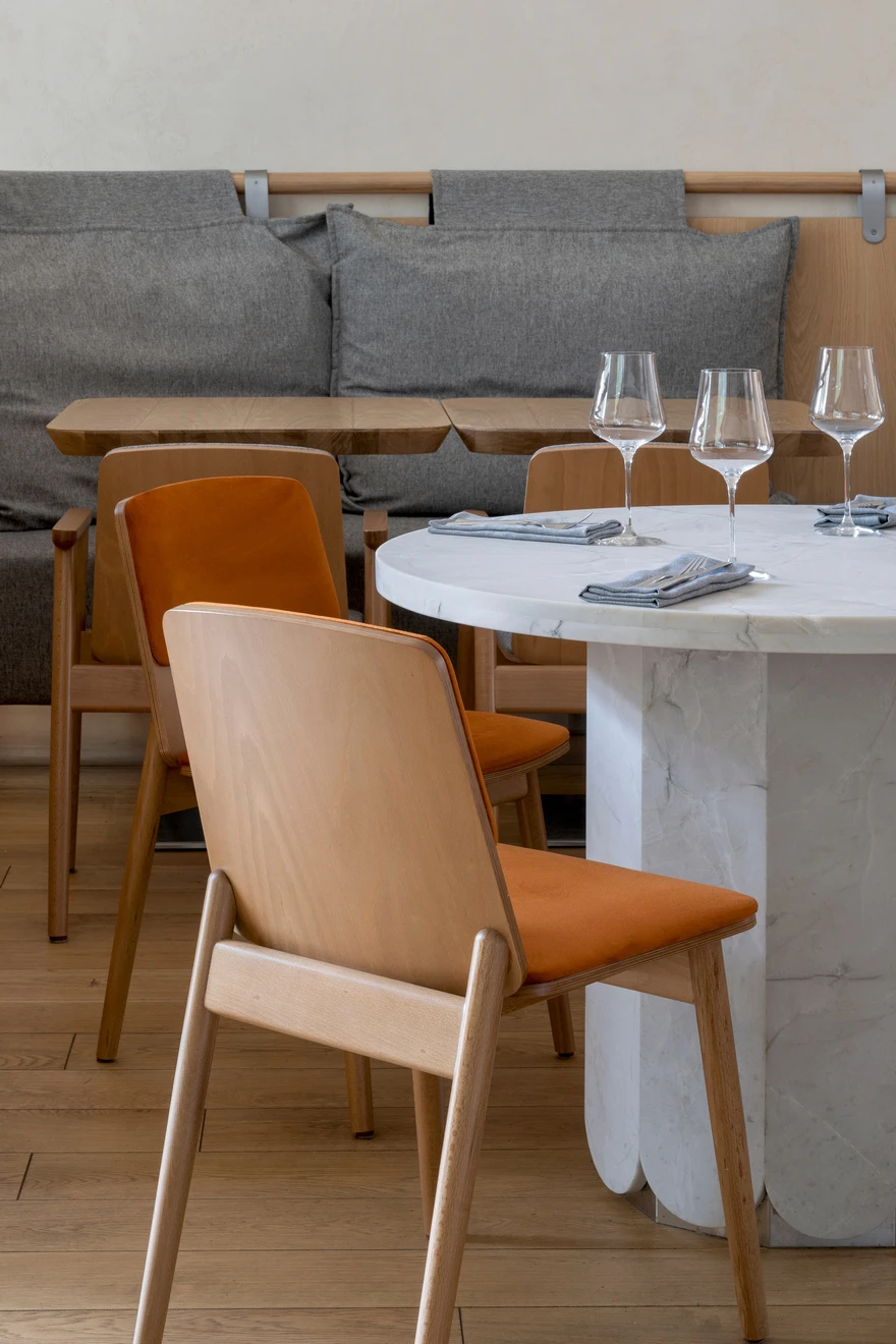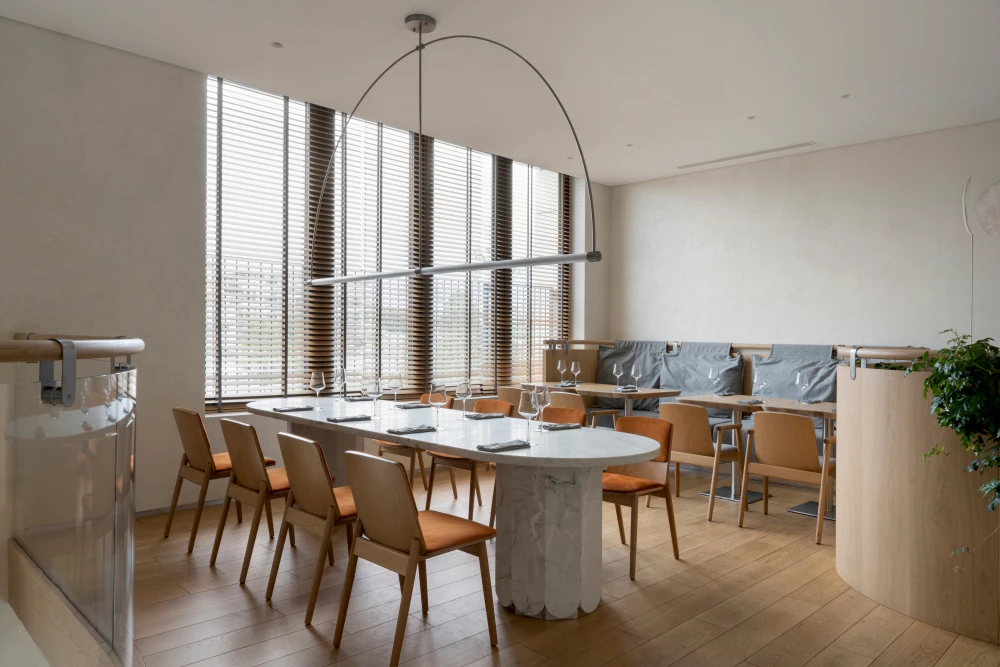 Ресторан расположен в Санкт-Петербурге на набережной Адмирала Лазарева в премиальном жилом комплексе One Trinity Place и занимает два уровня общей площадью 242,88 кв. метра. Пространство с семиметровыми потолками и окнами в два уровня для авторов проекта стало редкой возможностью и одновременно профессиональным вызовом. «Помещение имело два входа: парадный со стороны набережной и дополнительный — со стилобата, где проходят прогулочные маршруты. Вертикальный объем словно сам подсказывал решение: второй уровень логично разместить на высоте стилобата. По пожеланию заказчика кухня осталась на первом этаже — ради удобства логистики, а основной зал поднялся выше».